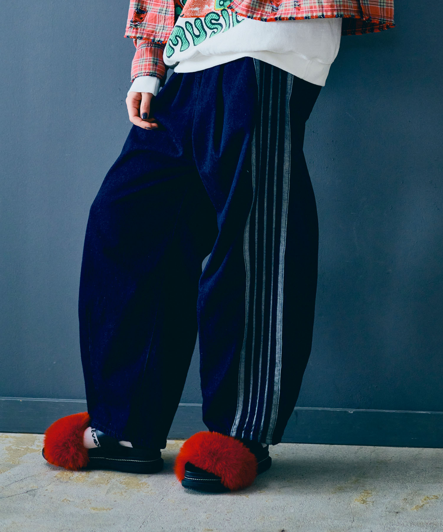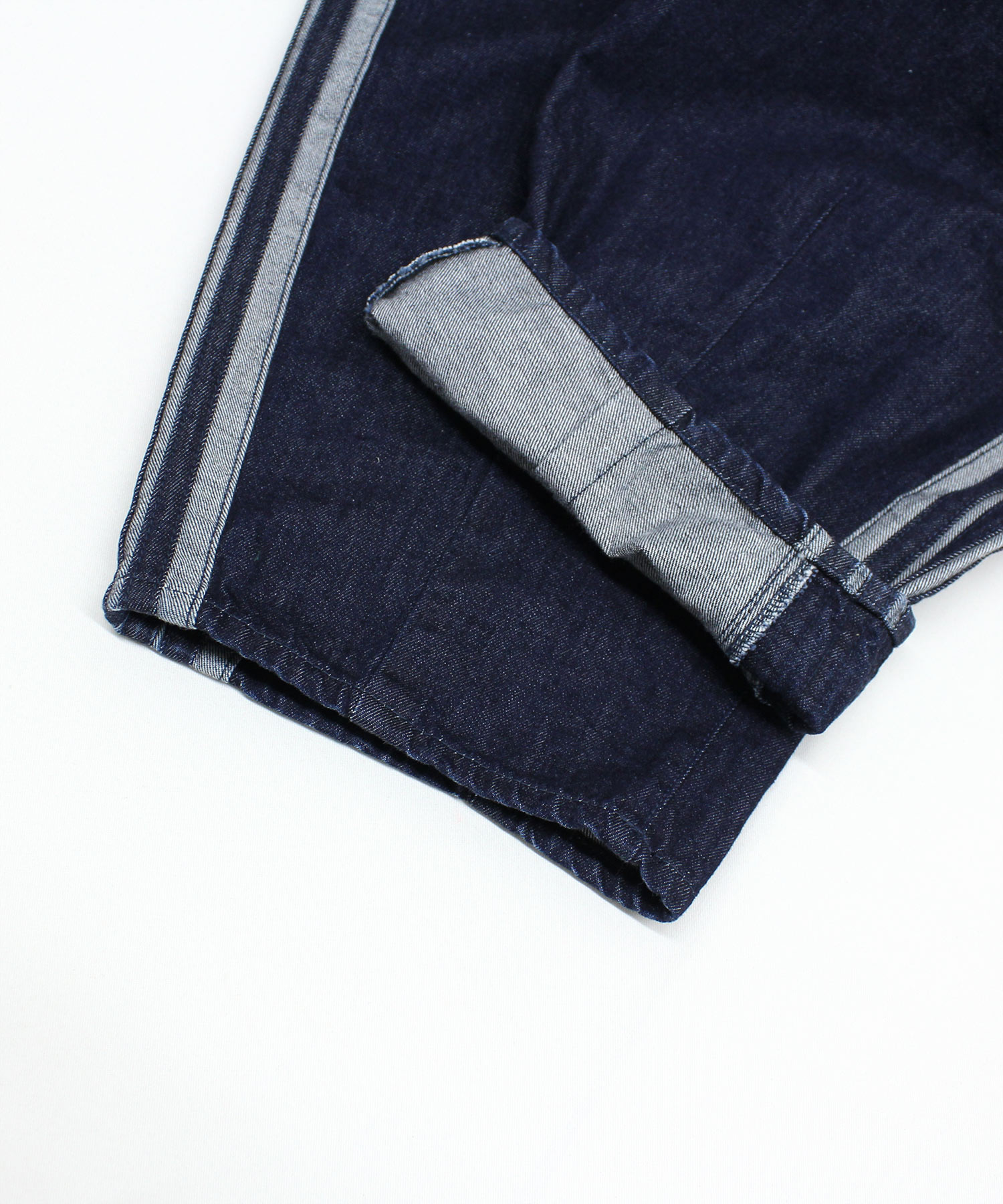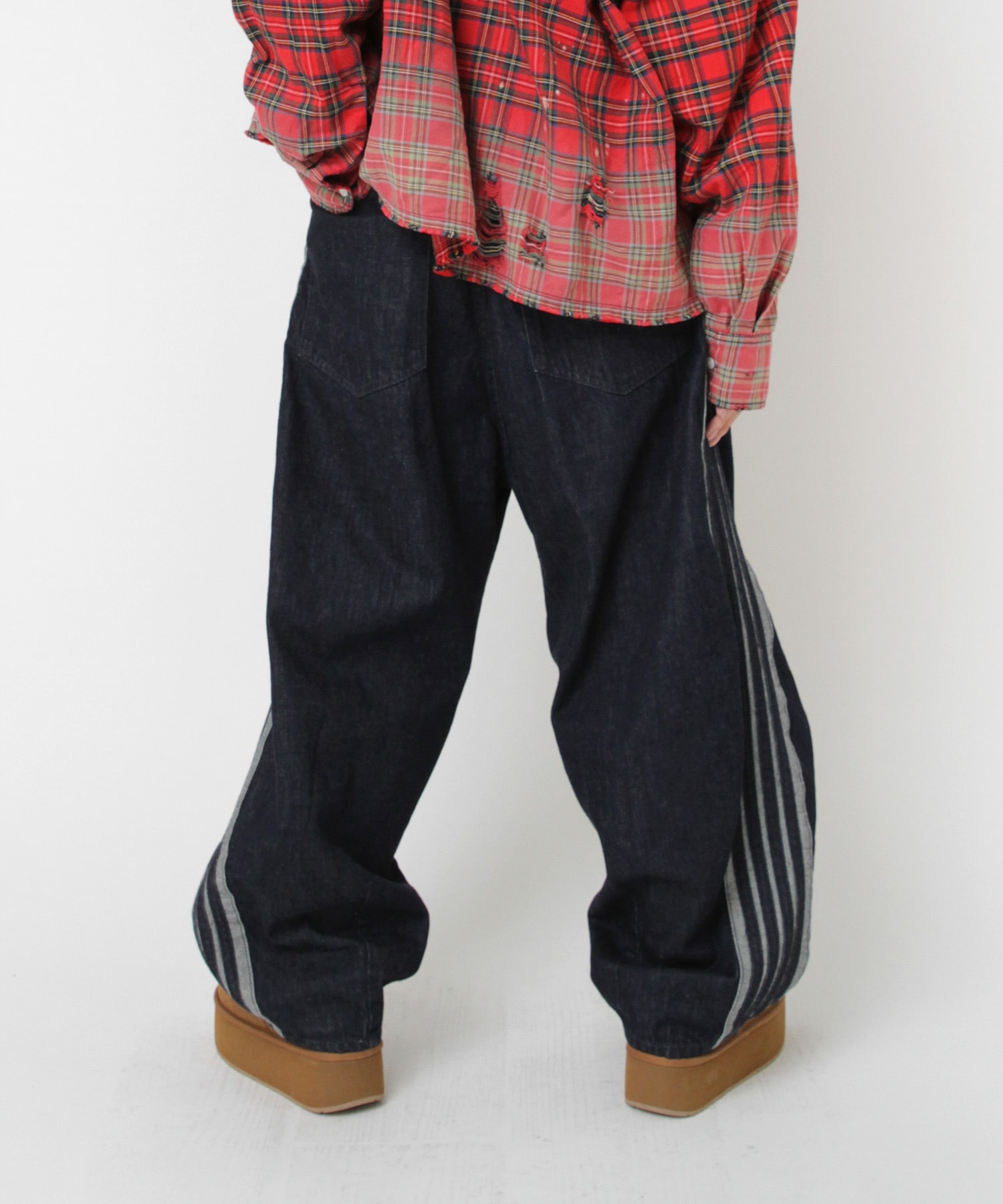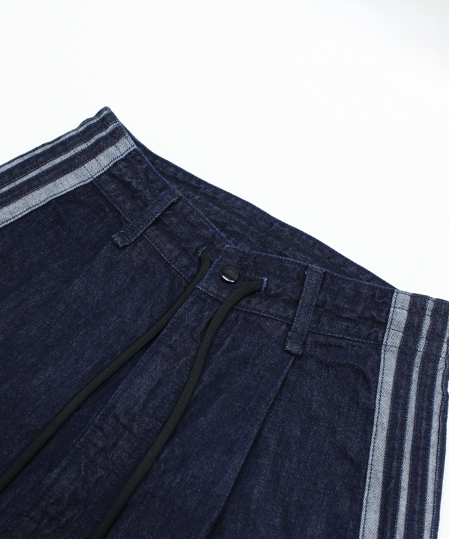 立体的なカーブシルエットがポイントのデニムトラックパンツ