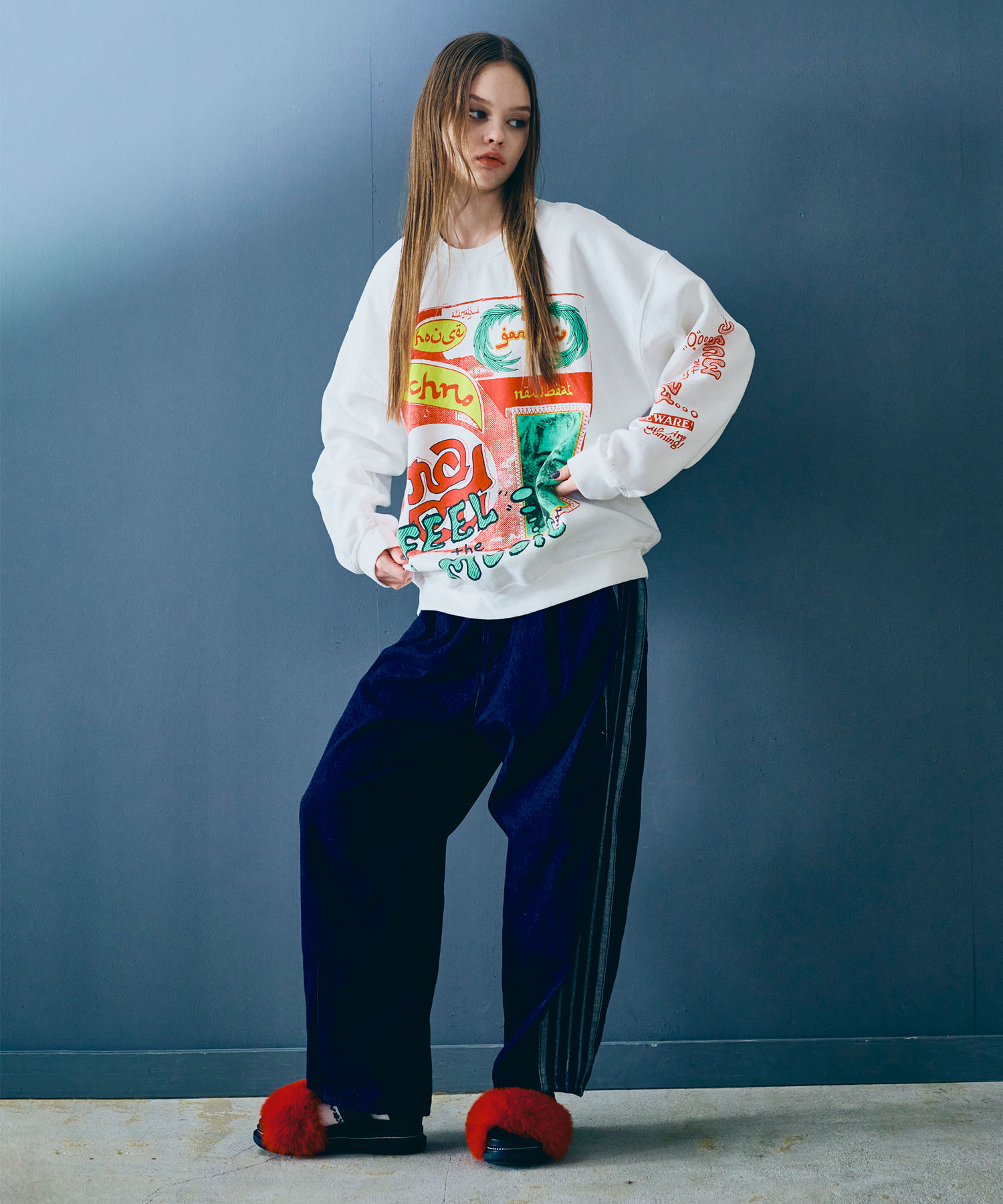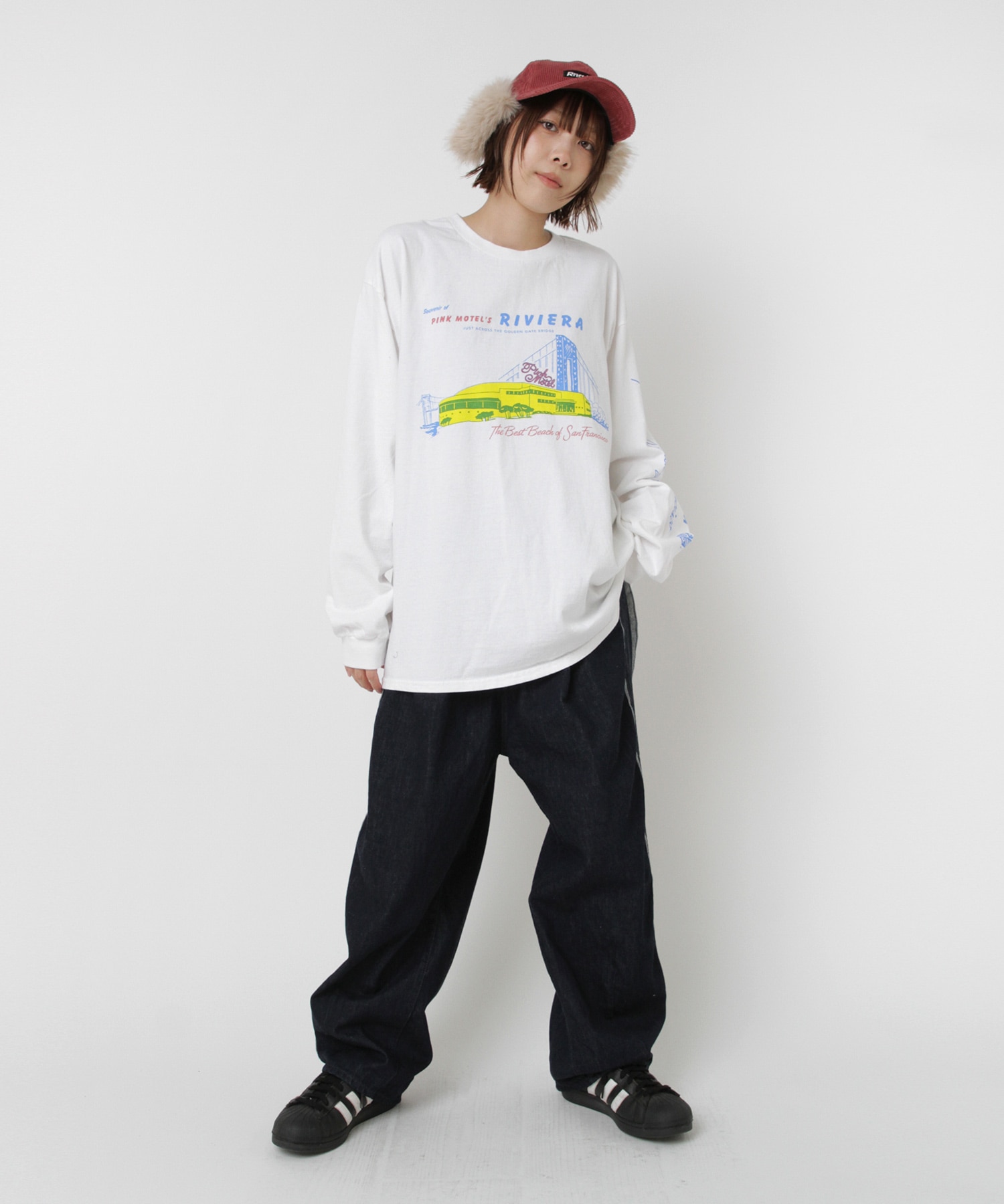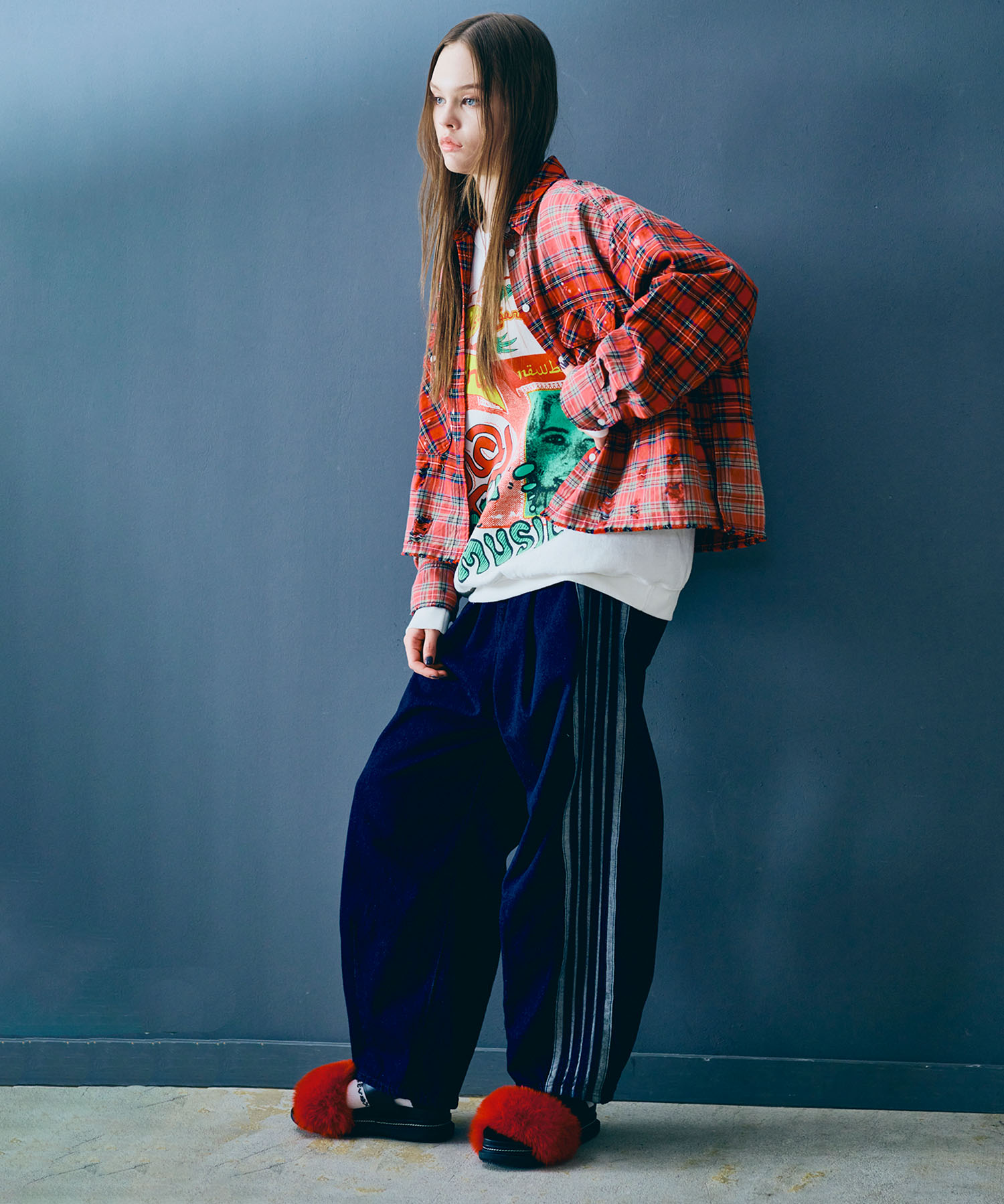 パンツの履き位置は、正ウエストからやや高めで履いていただくのがおすすめ。ウエスト周りがすっきりと脚が長く見え、かっこよく決まります。