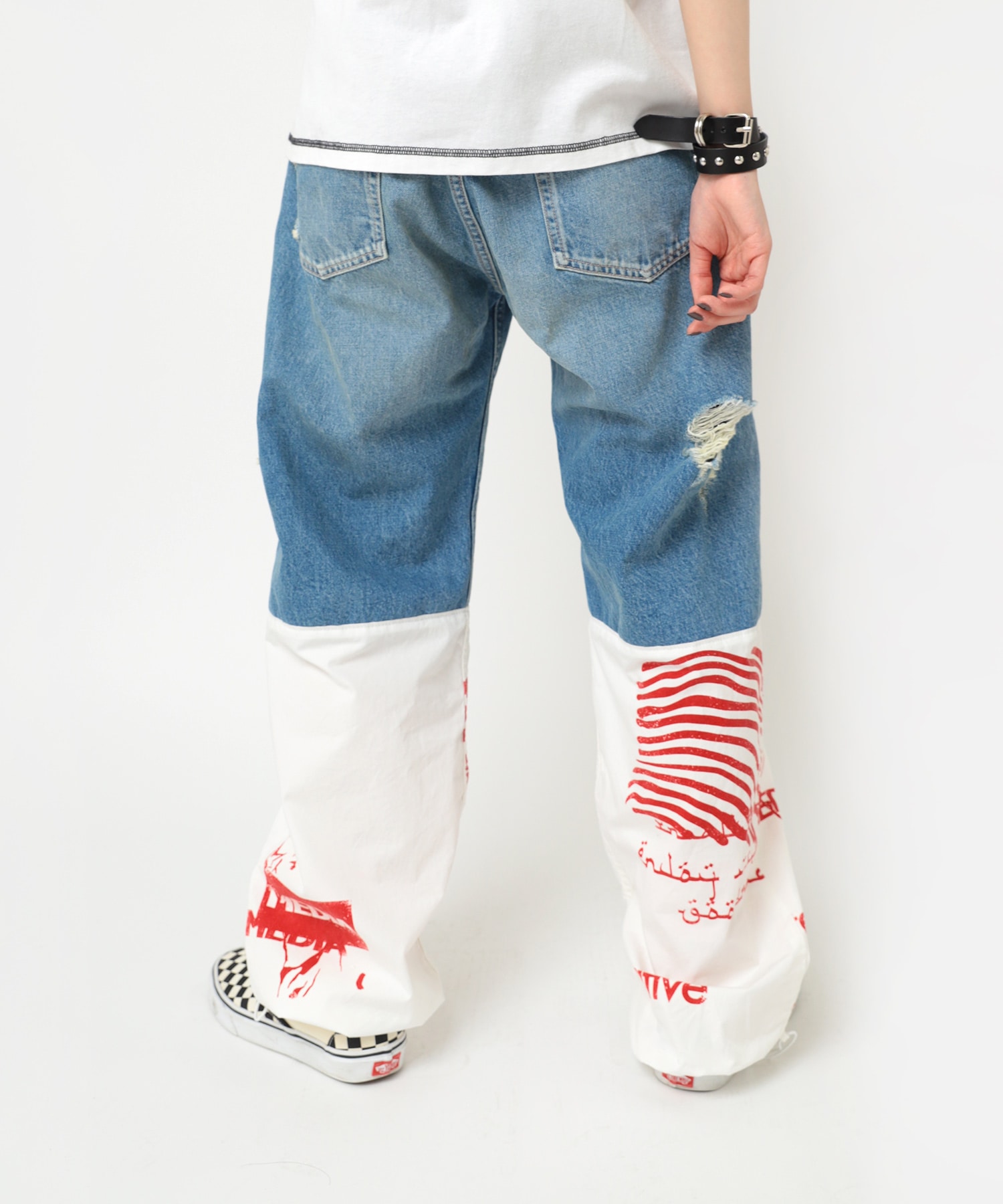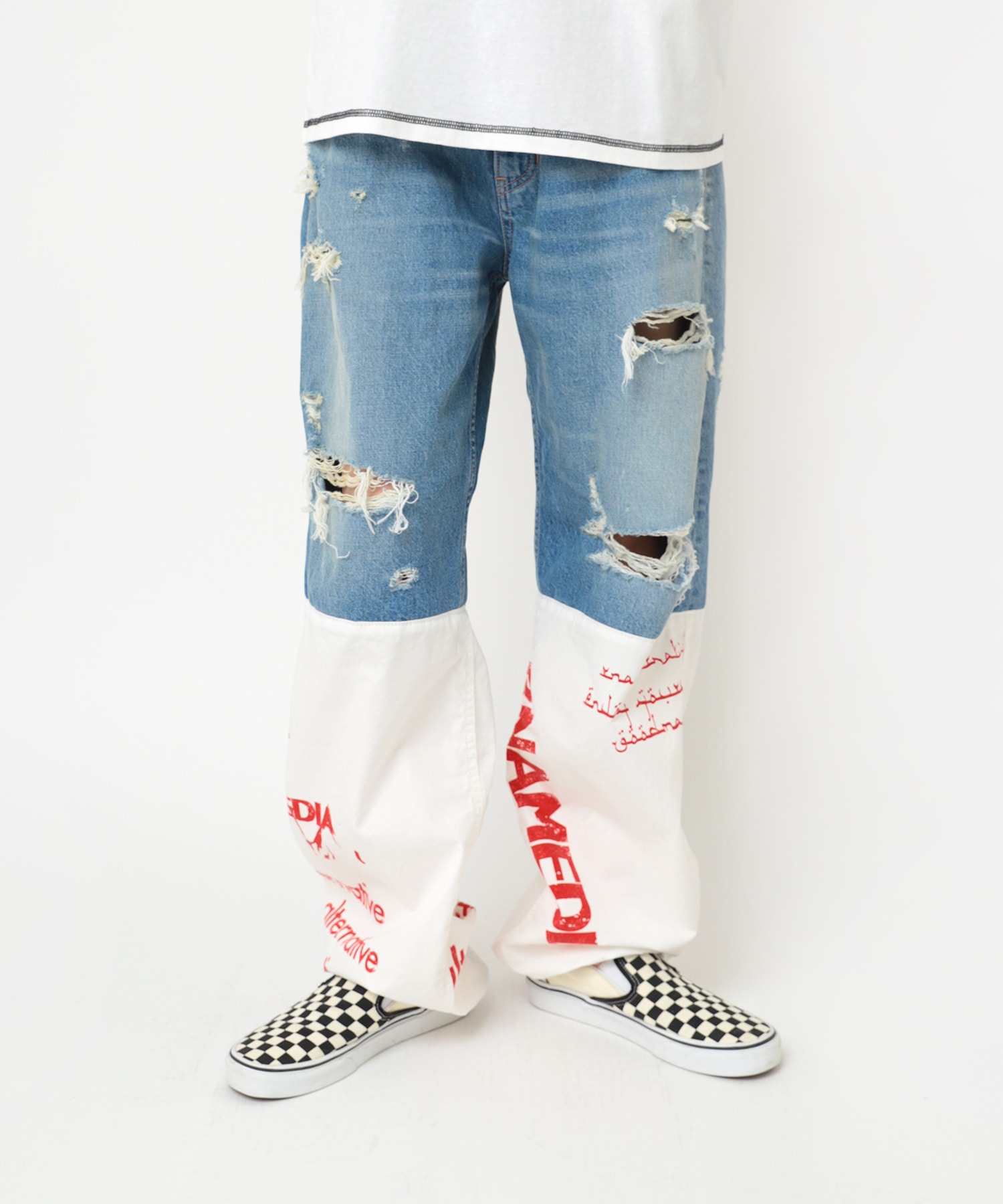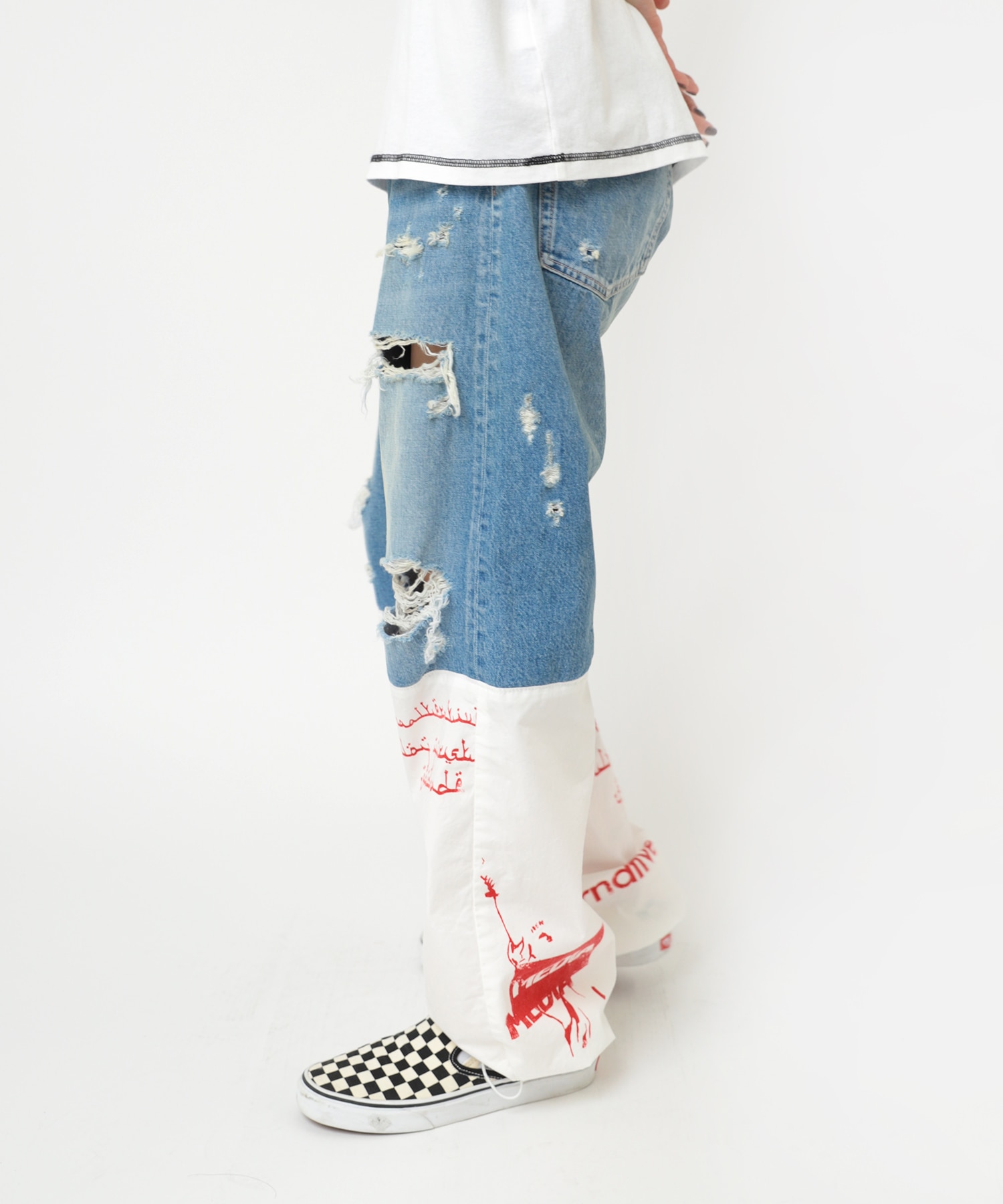 リアルな色落ちが魅力のデニムに、パラシュートパンツの裾をドッキングした、