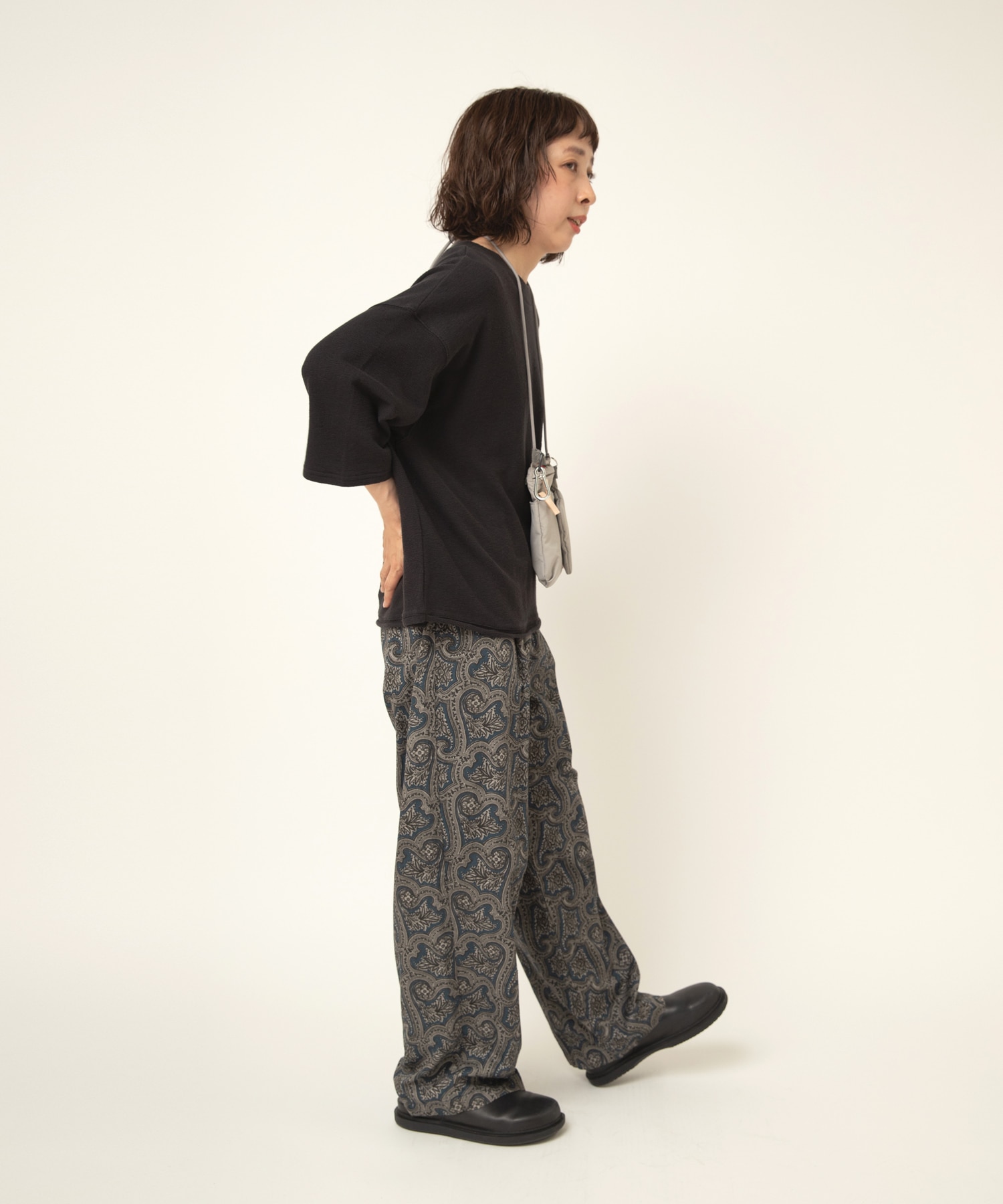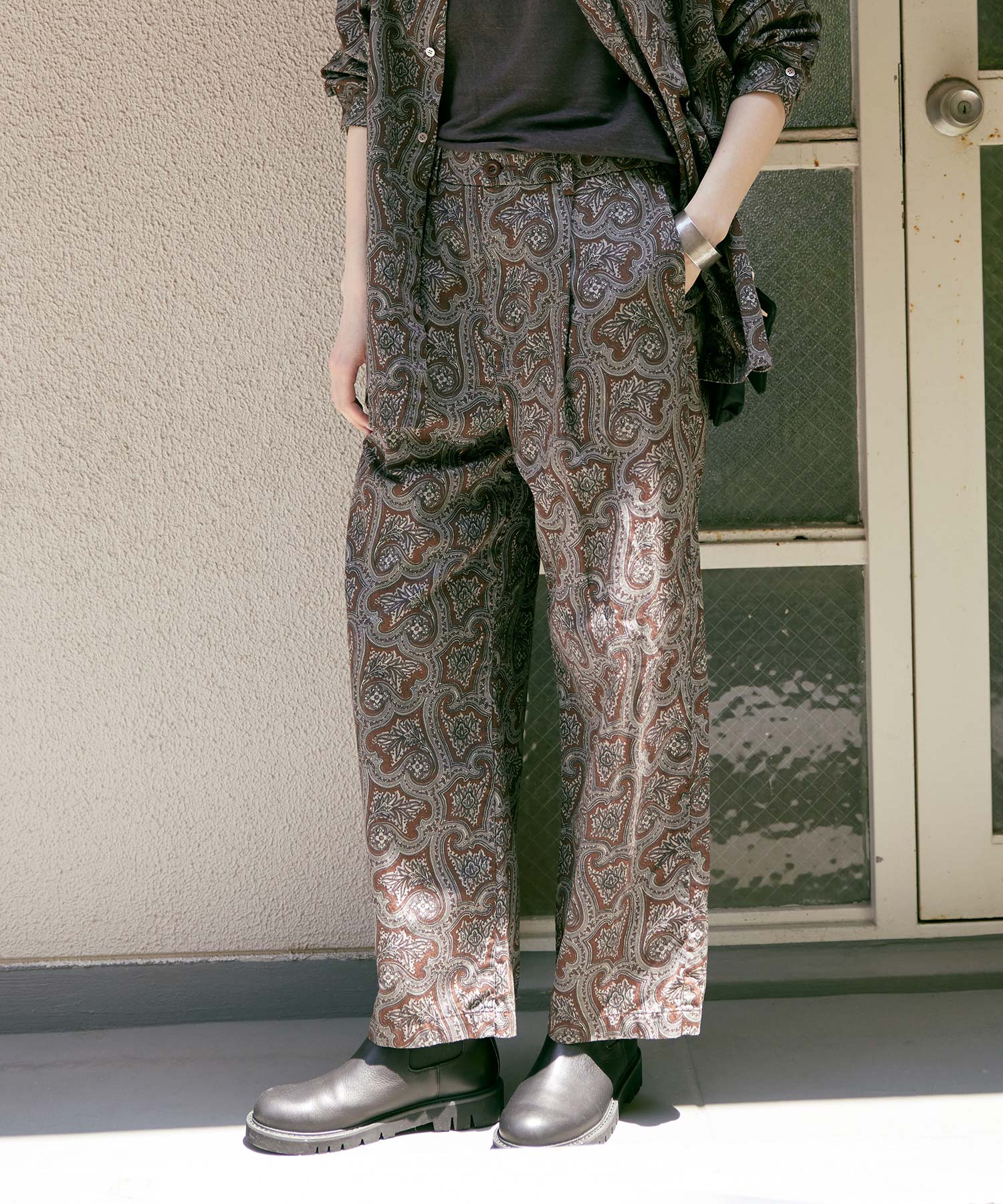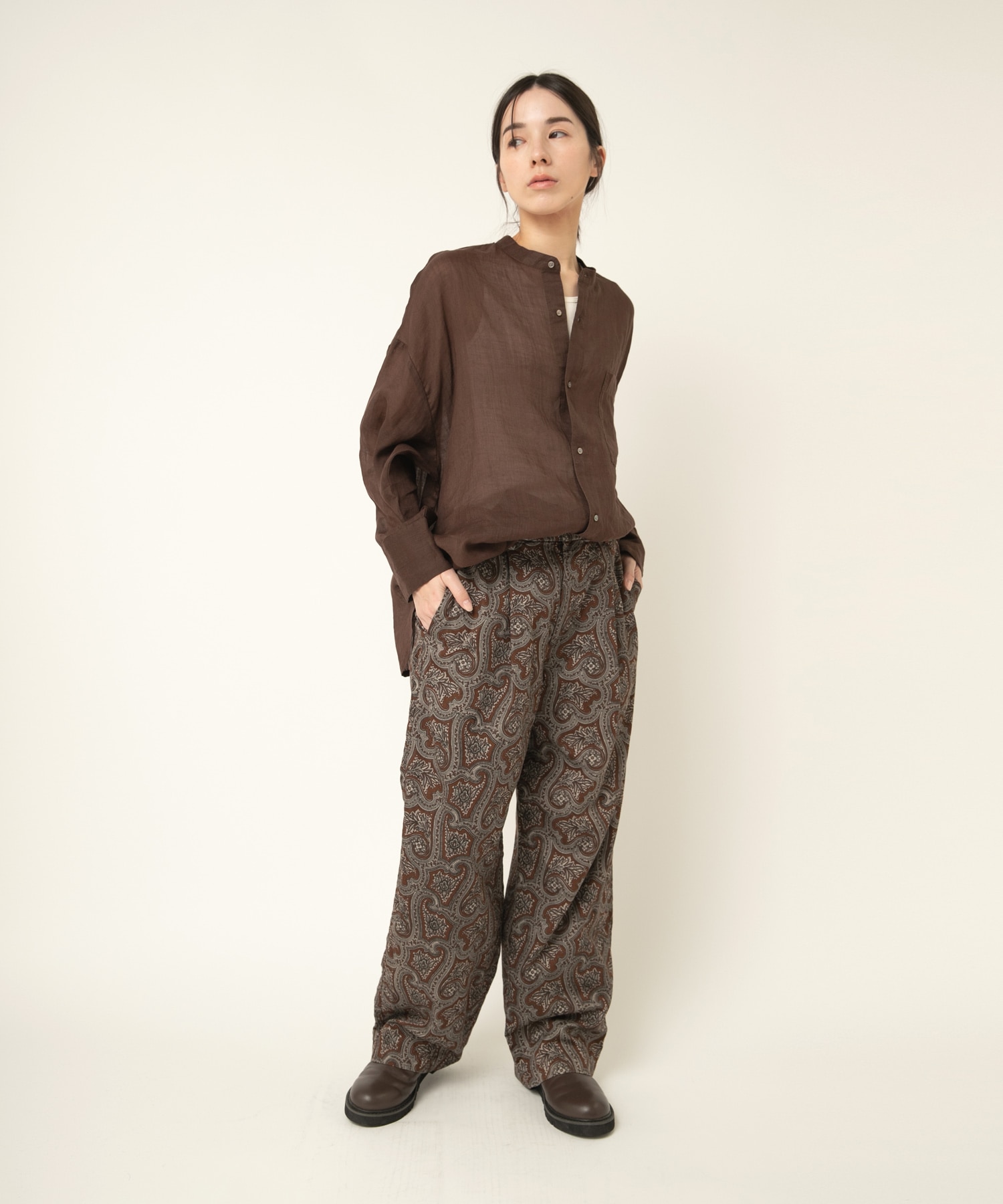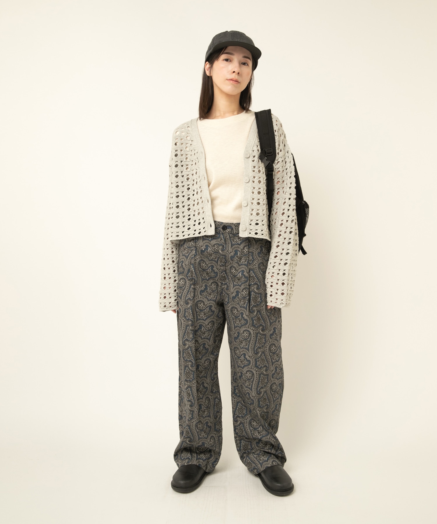 一癖あるペイズリーの柄域と、秋冬を感じさせるダークトーン、ほんのりとしたくすみ感が落ち着いた華やかさを纏って、コーディネートに程よいニュアンスを加えてくれます。