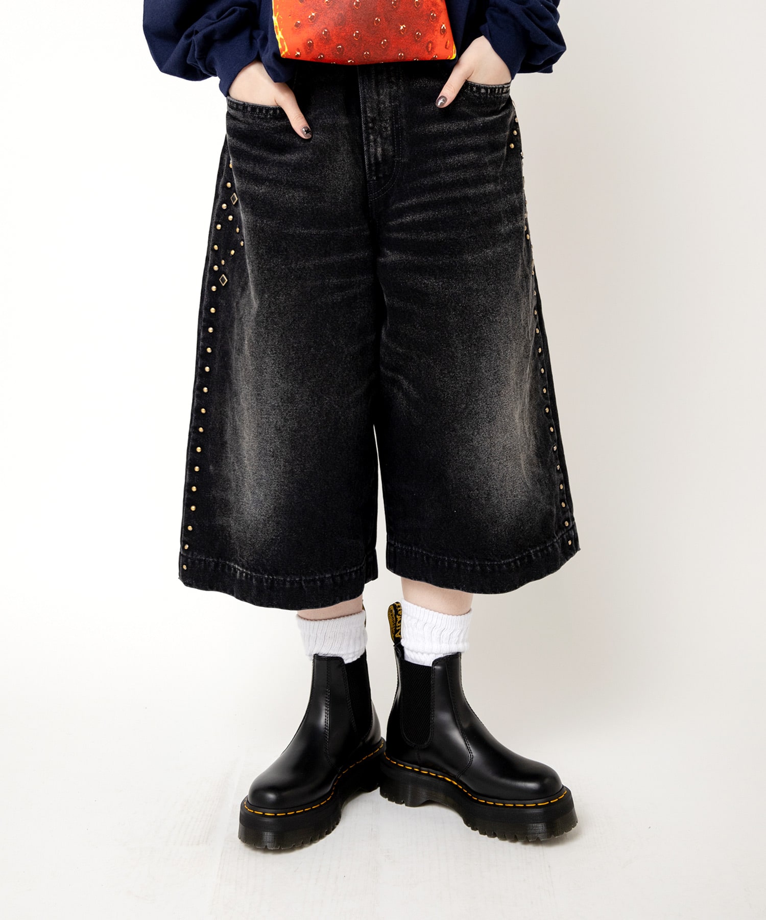 スタッズが効いた、ルーズシルエットのカットレングスパンツ