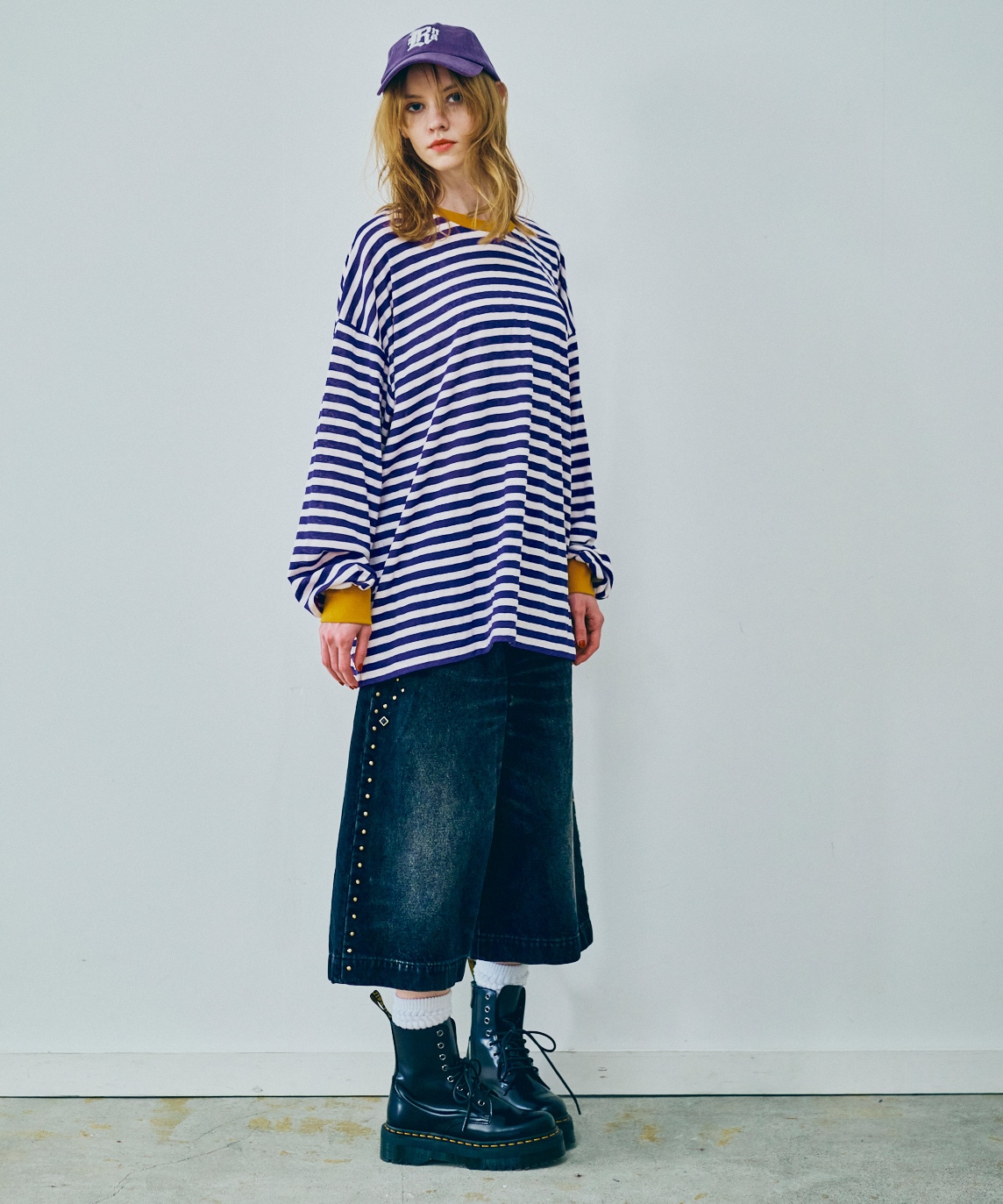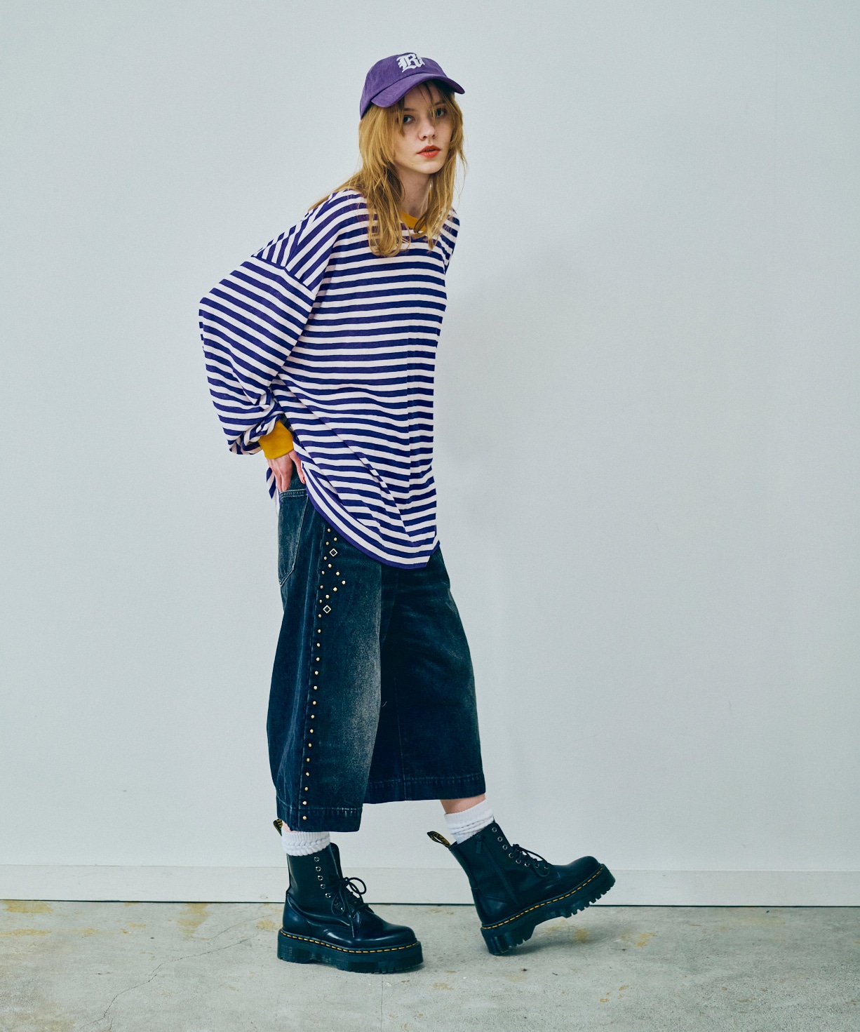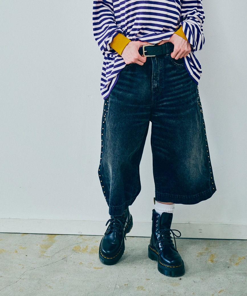 サイドのスタッズラインが目を引く、ルーズなサイズ感のカットレングスパンツです。