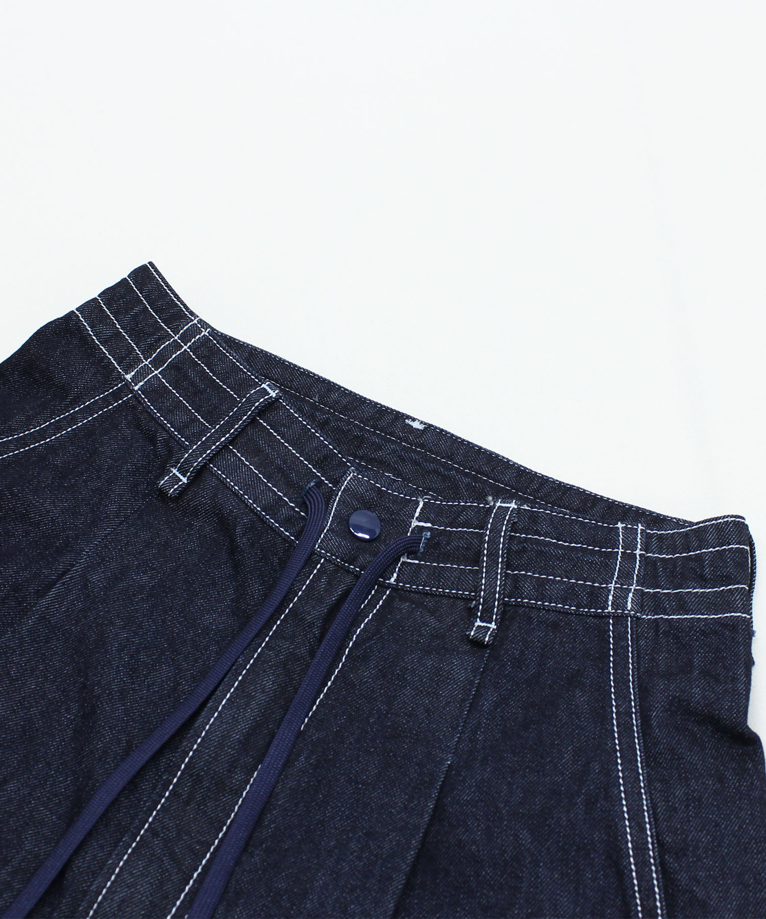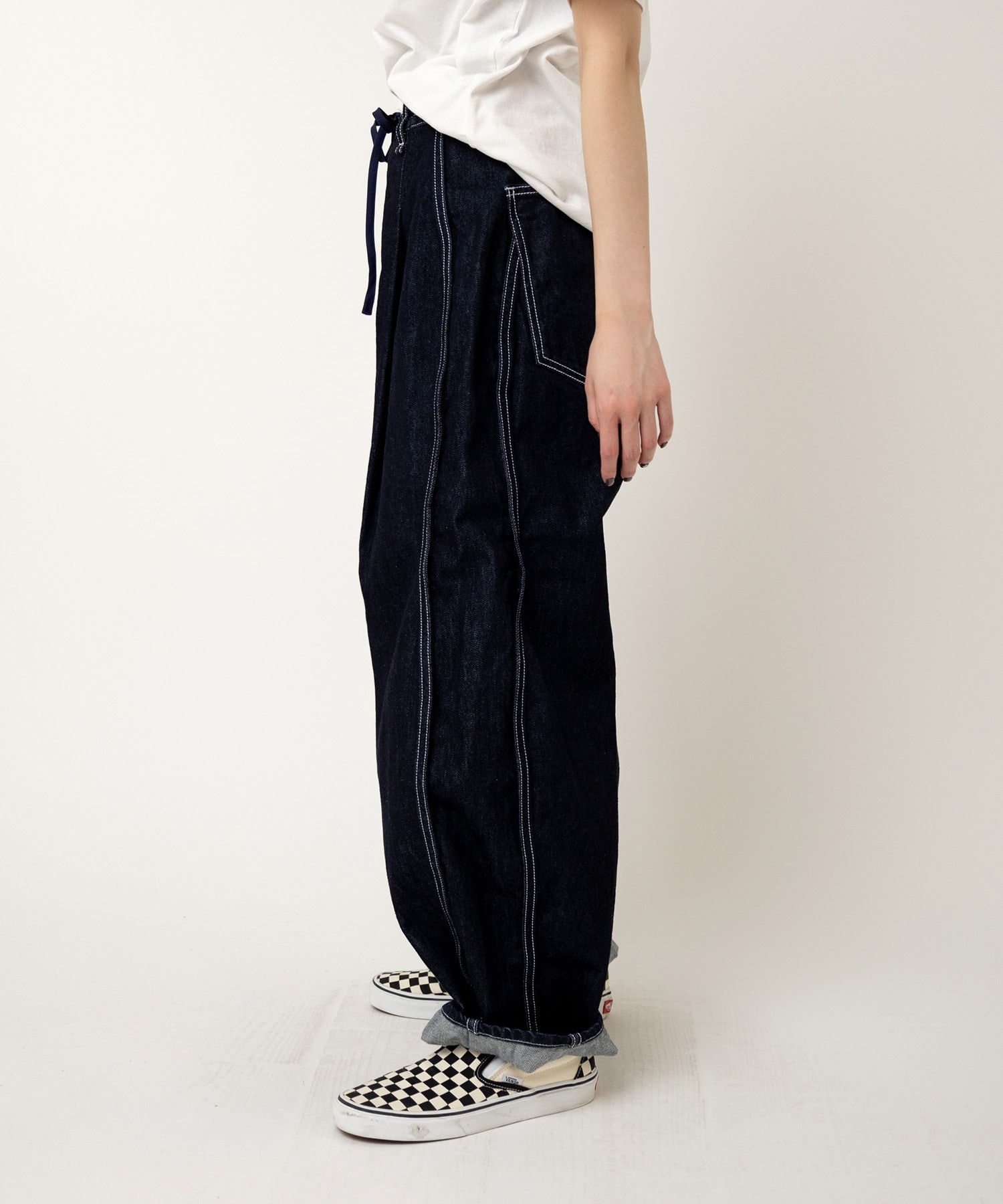 ウエストコードにより、履き位置を決めることができます。コードをしっかり目に締めてスッキリと正ウエスト履きや、コードを緩めルーズ履きでもスタイリングによりお選びいただけます。