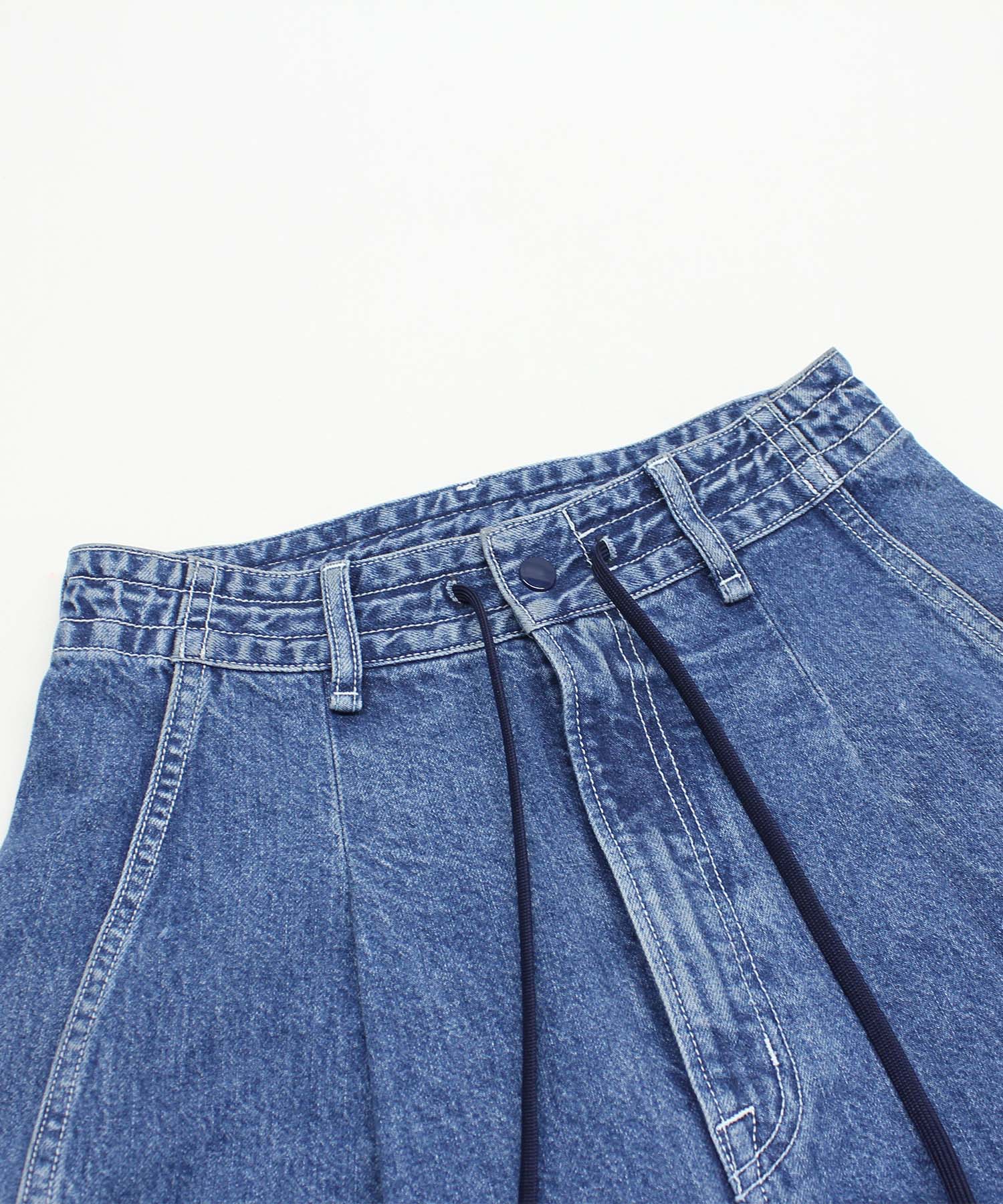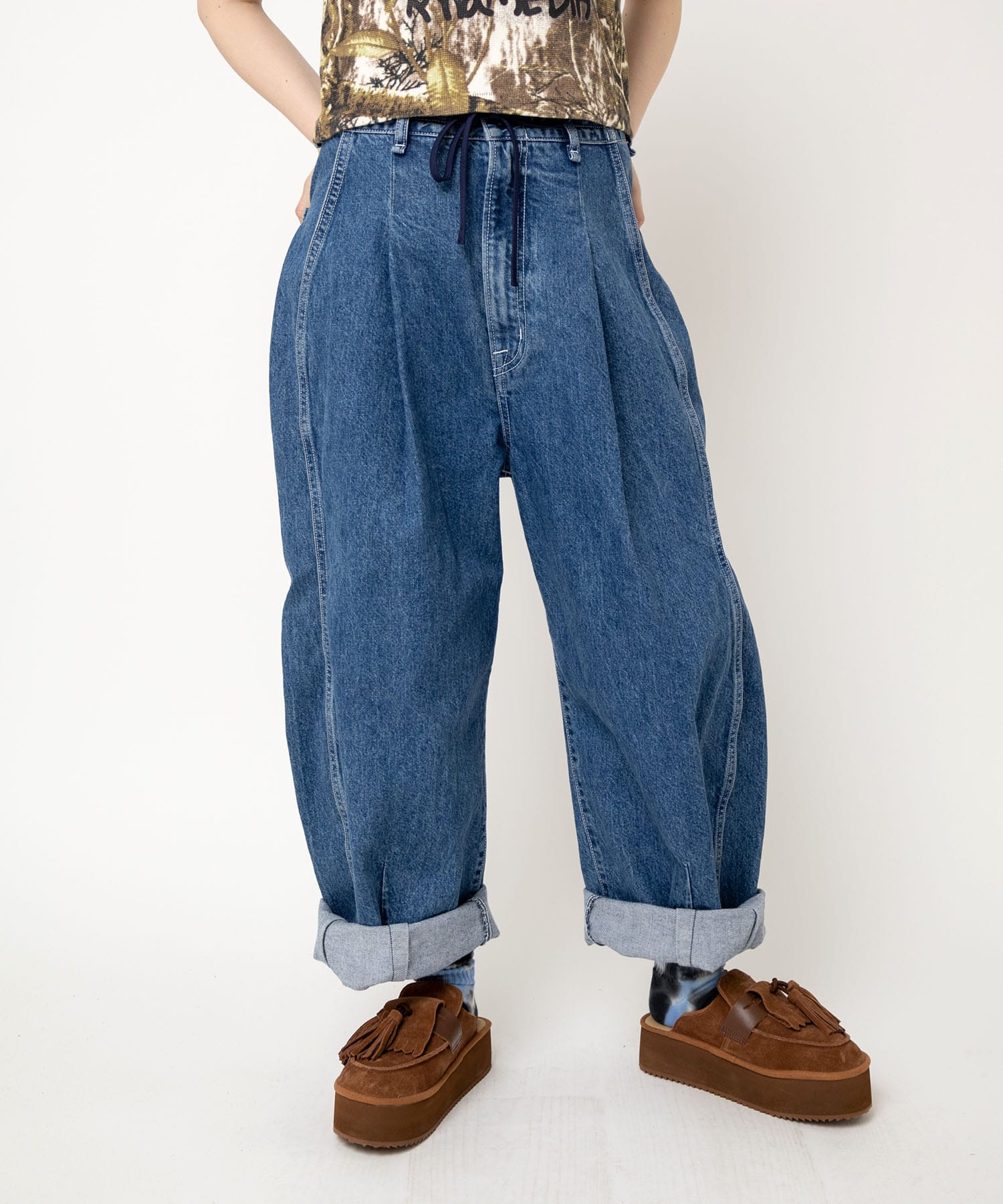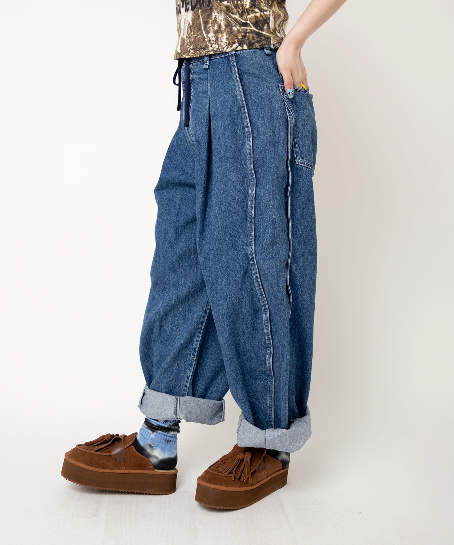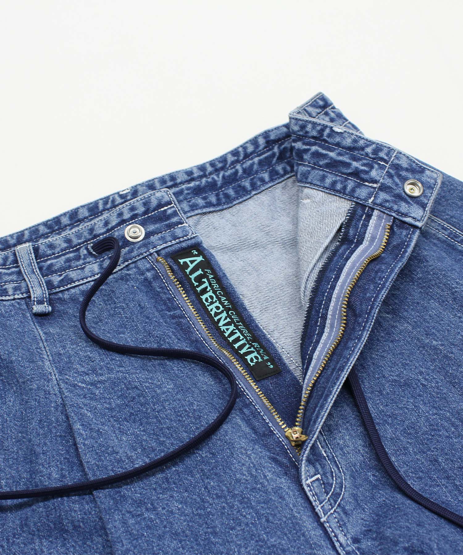 ウエストコードにより、履き位置を決めることができます。コードをしっかり目に締めてスッキリと正ウエスト履きや、コードを緩めルーズ履きでもスタイリングによりお選びいただけます。