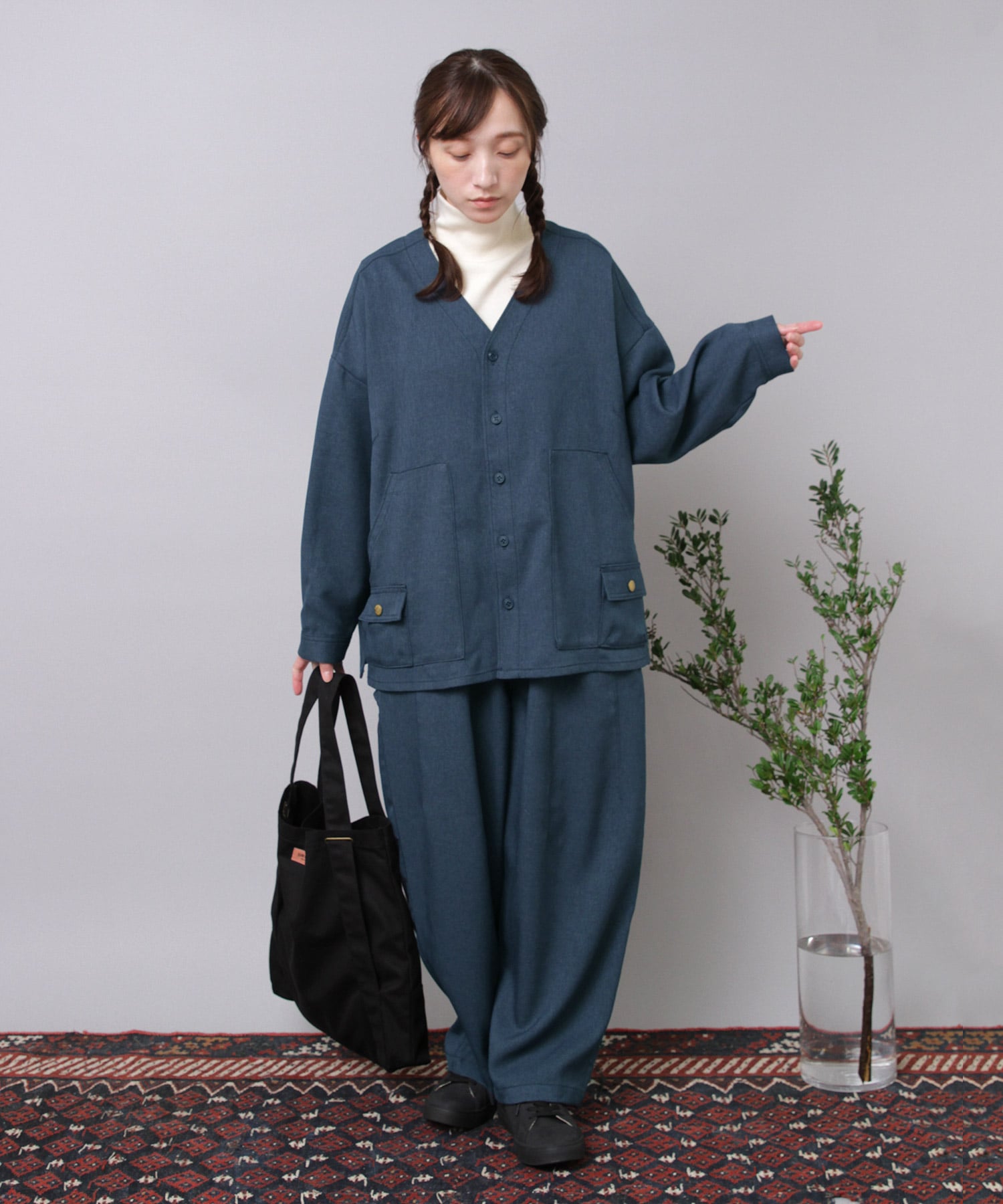 F.ワークのウールライクシャツジャケット(品番:B2927)とのセットアップも可能で、いつもとは一味違うカジュアルシーンを演出でき、コーディネートの幅が広がります。