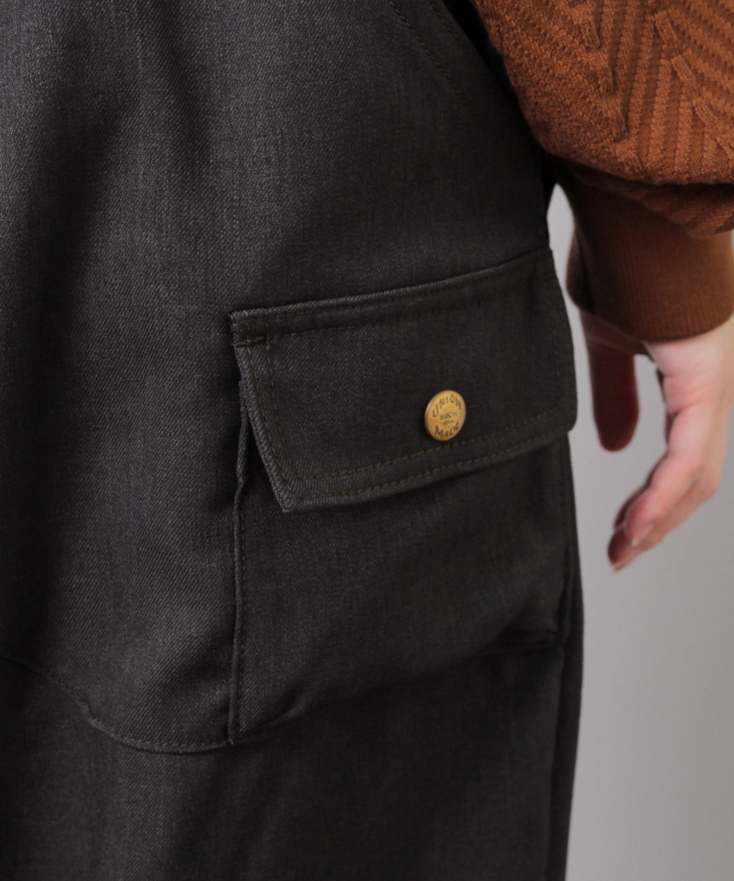 URCH RNAらしい大きく実用的な後ろ身頃のポケットと、その下に付いた小さなフラップポケットが、フレンチワークを意識したデザインポイント。