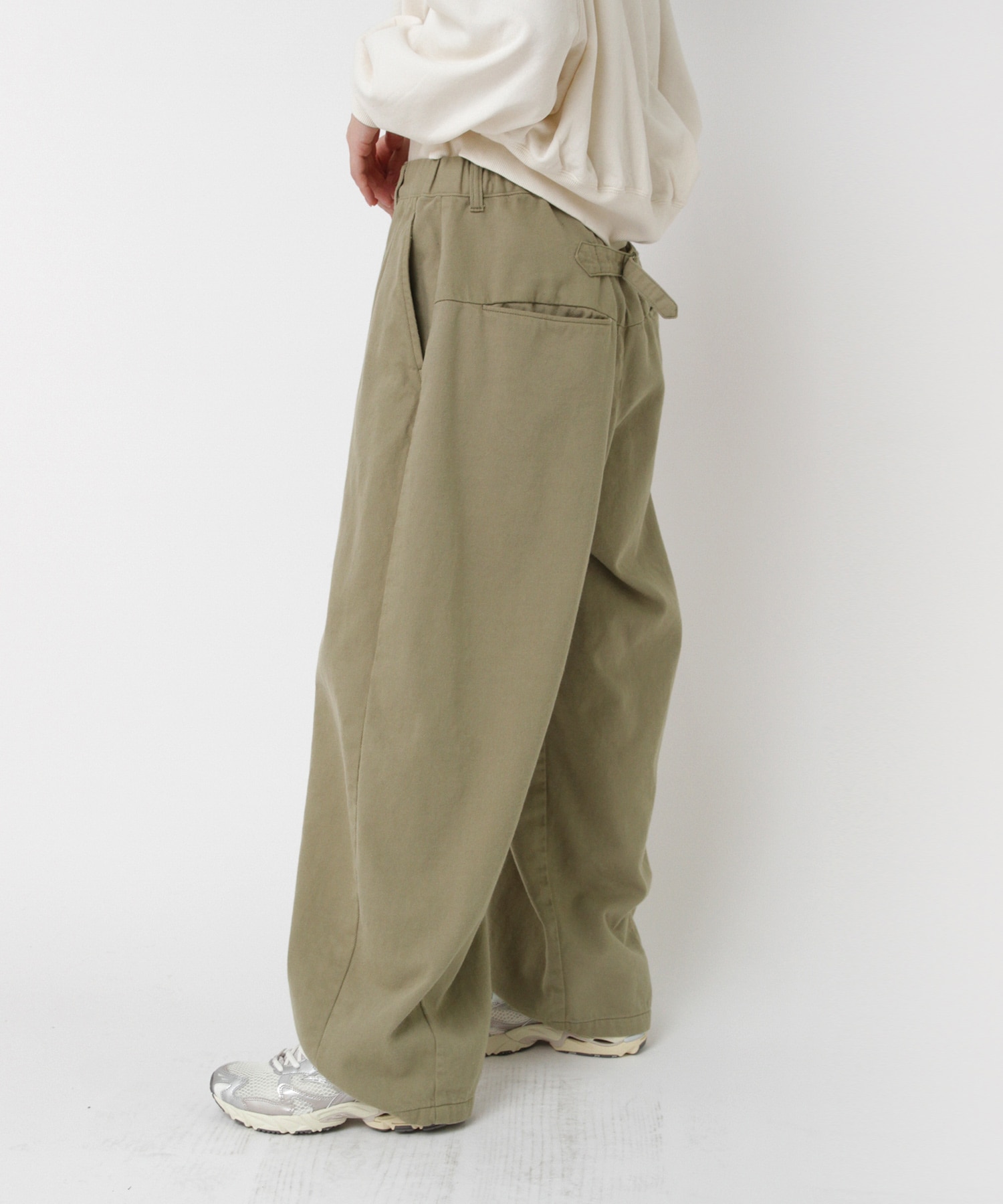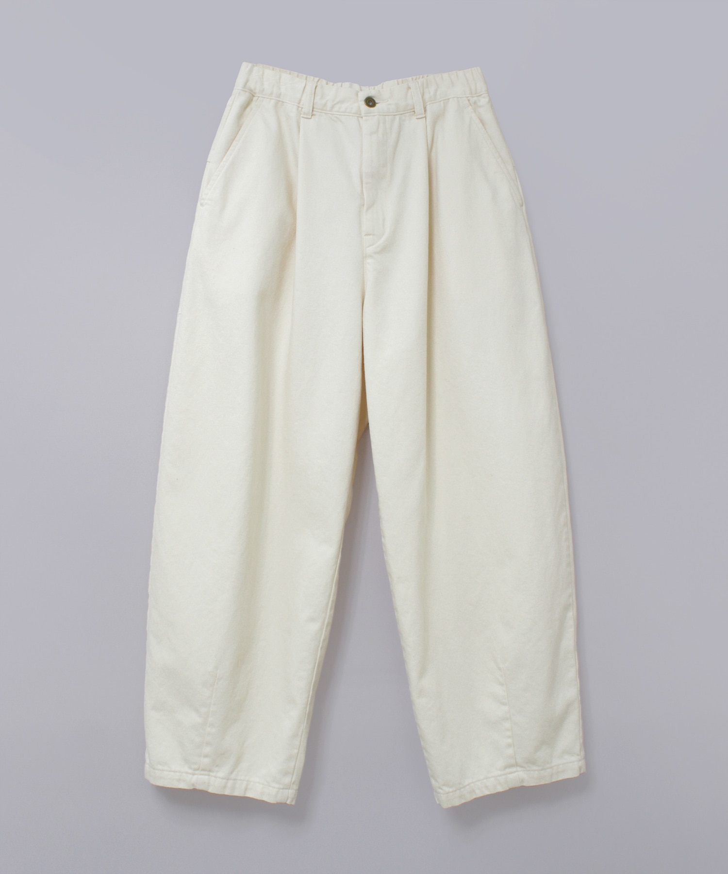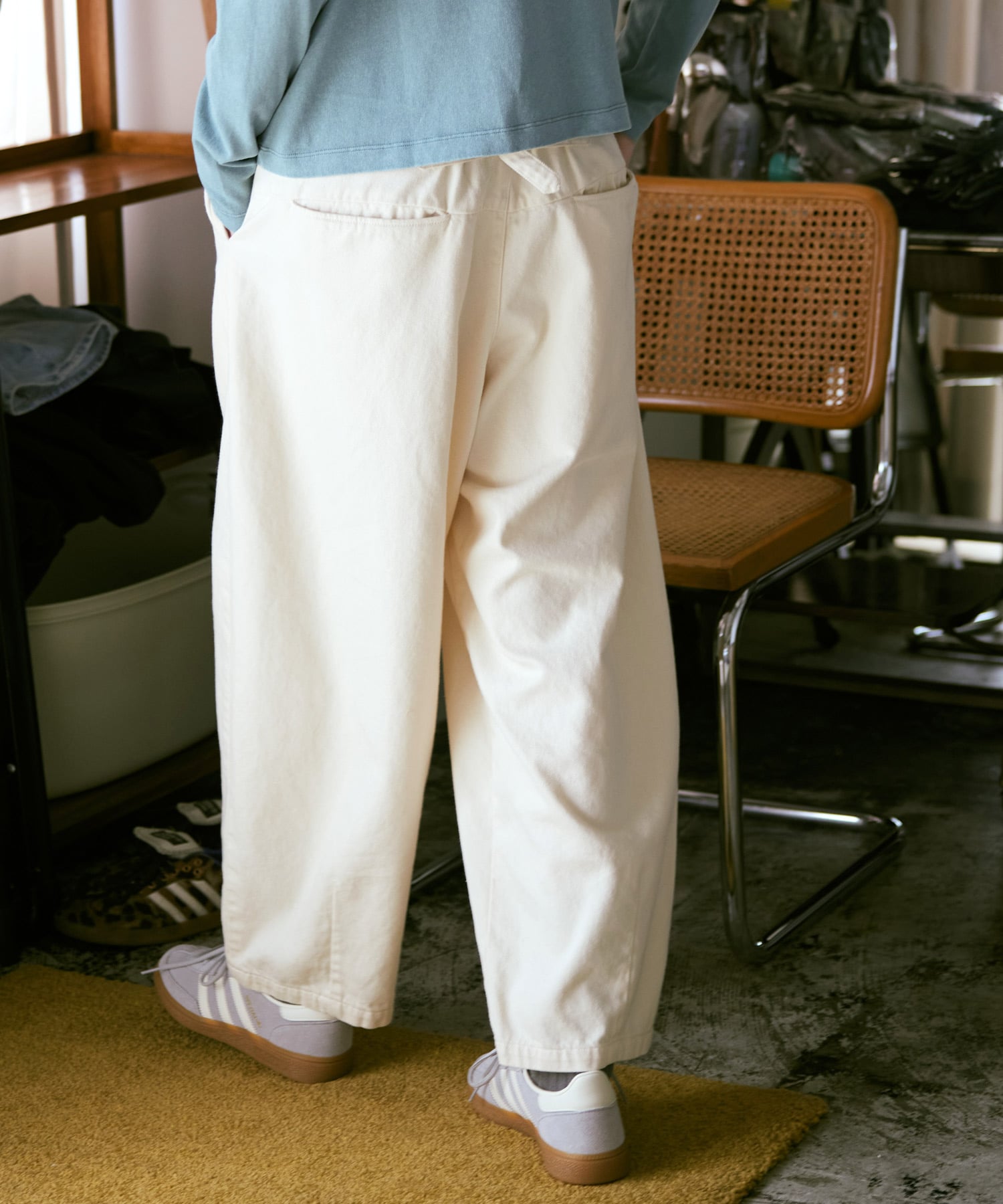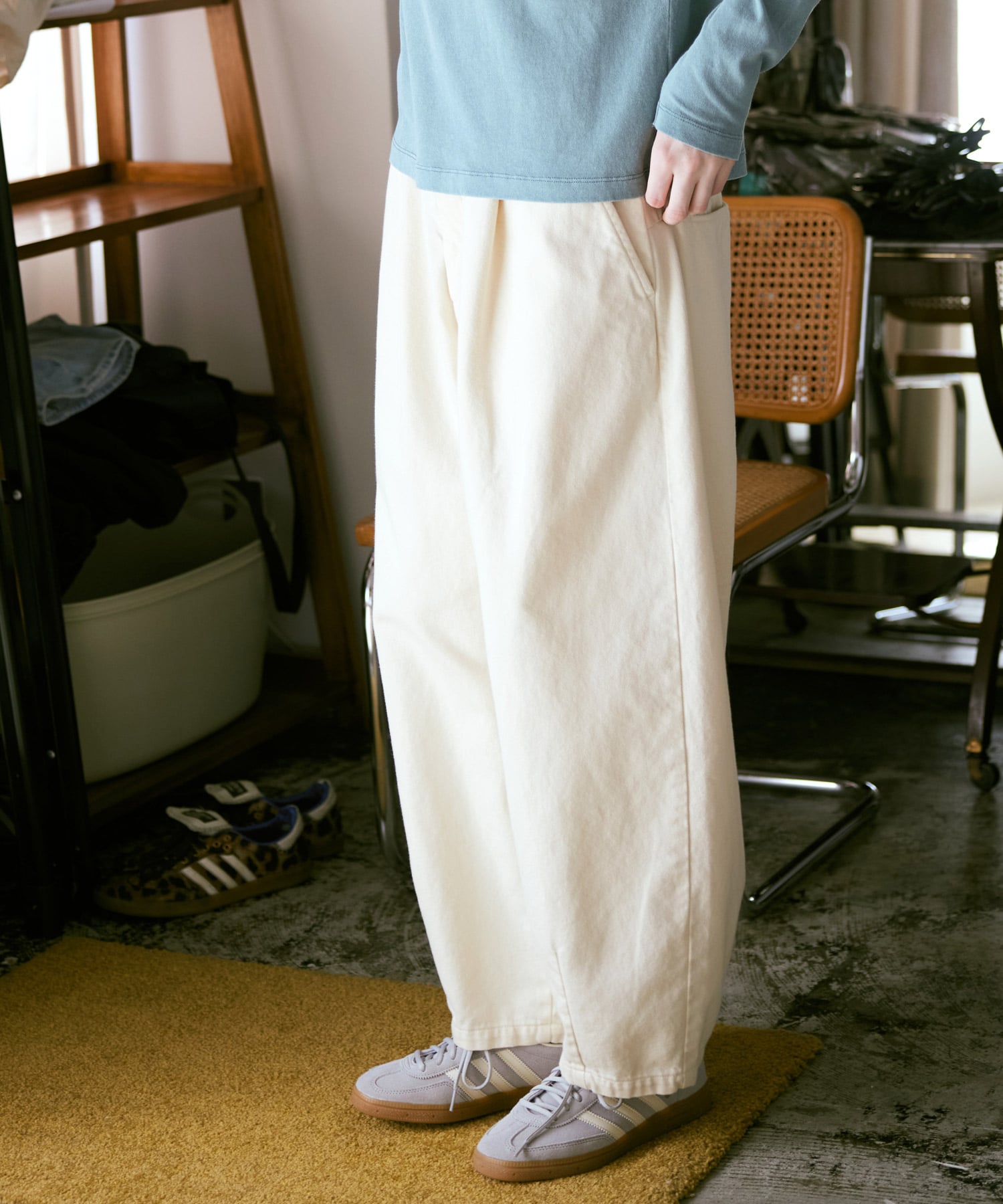 裾の方にカーブを描くような独特なシルエットのワイドパンツです。