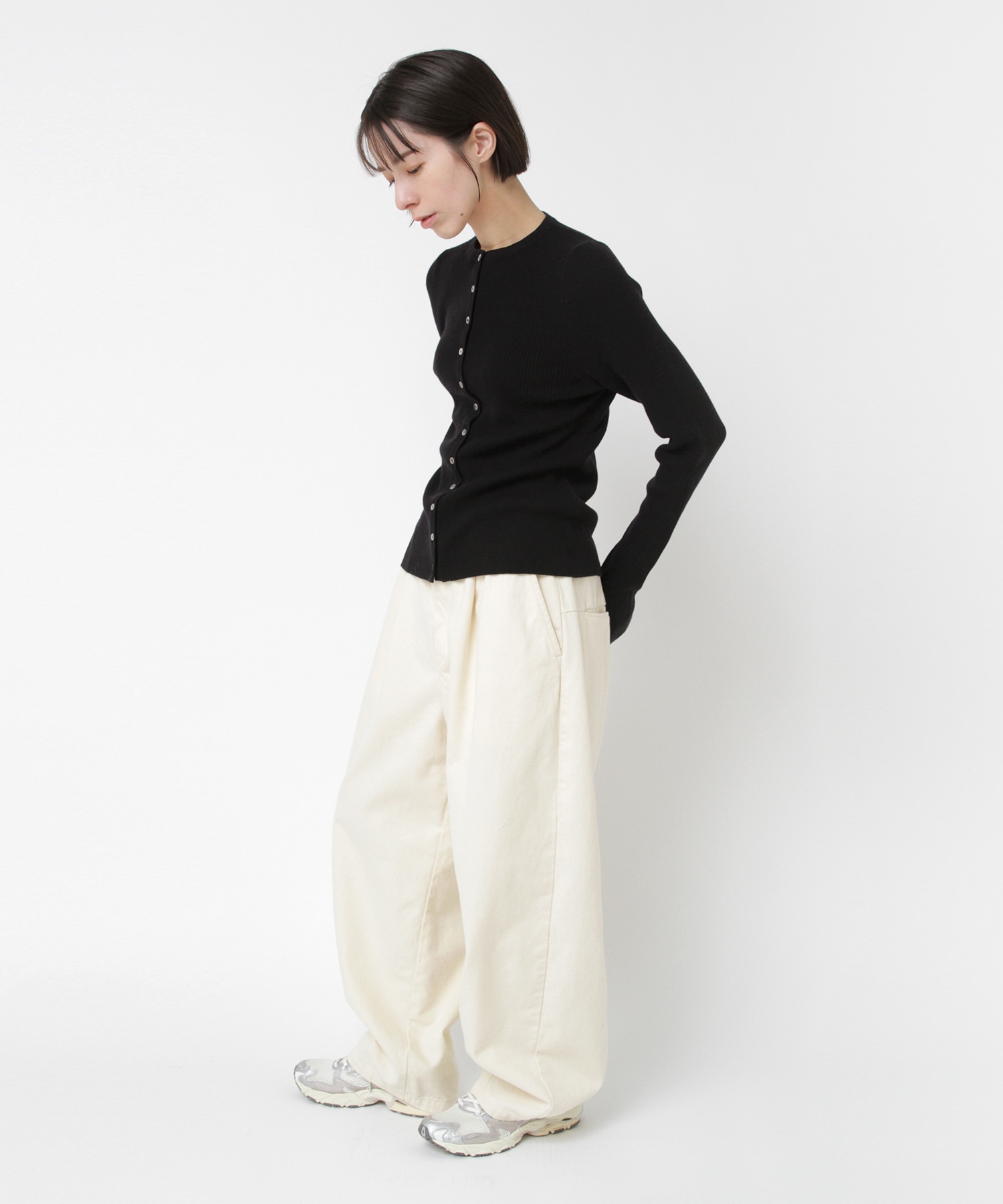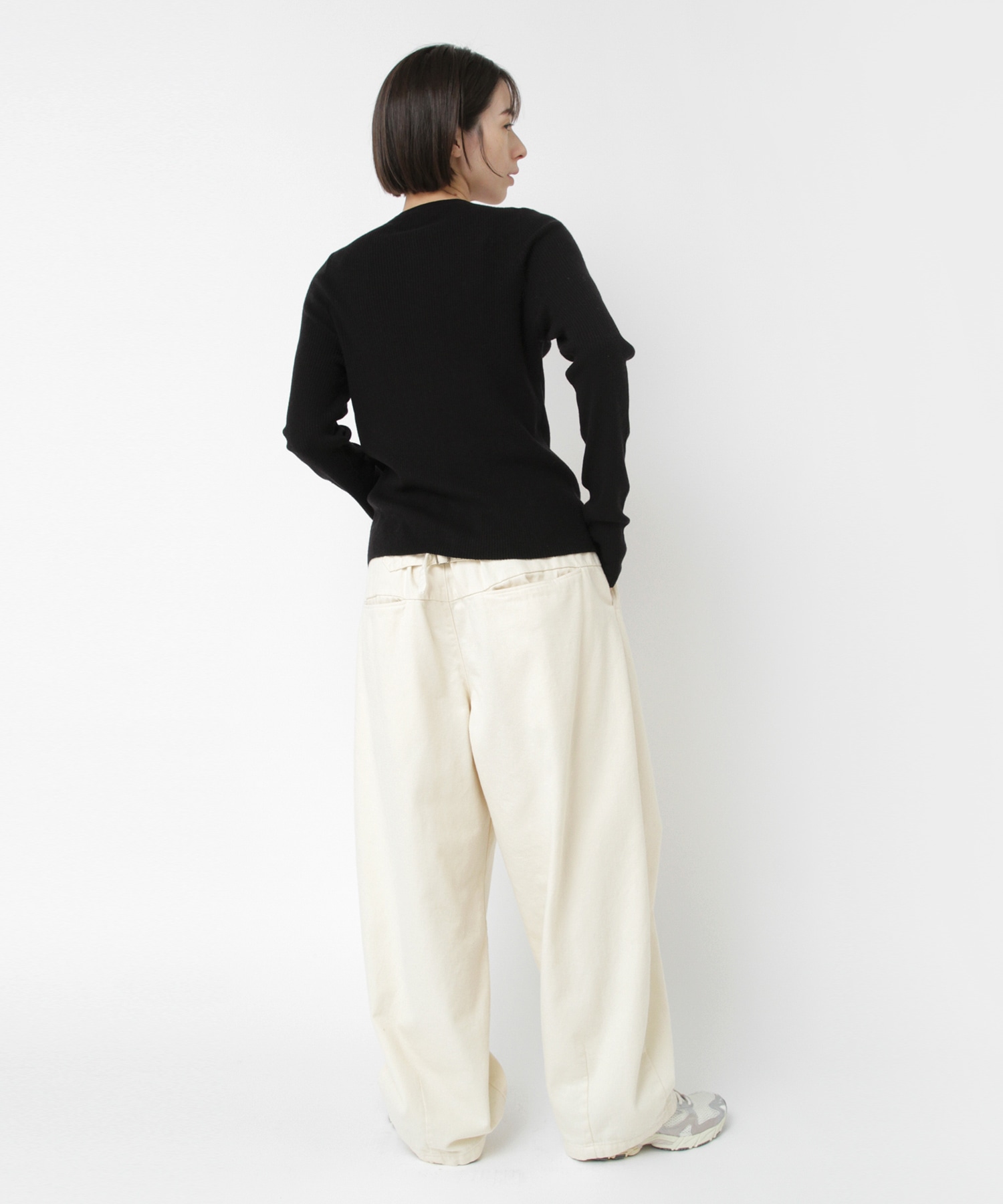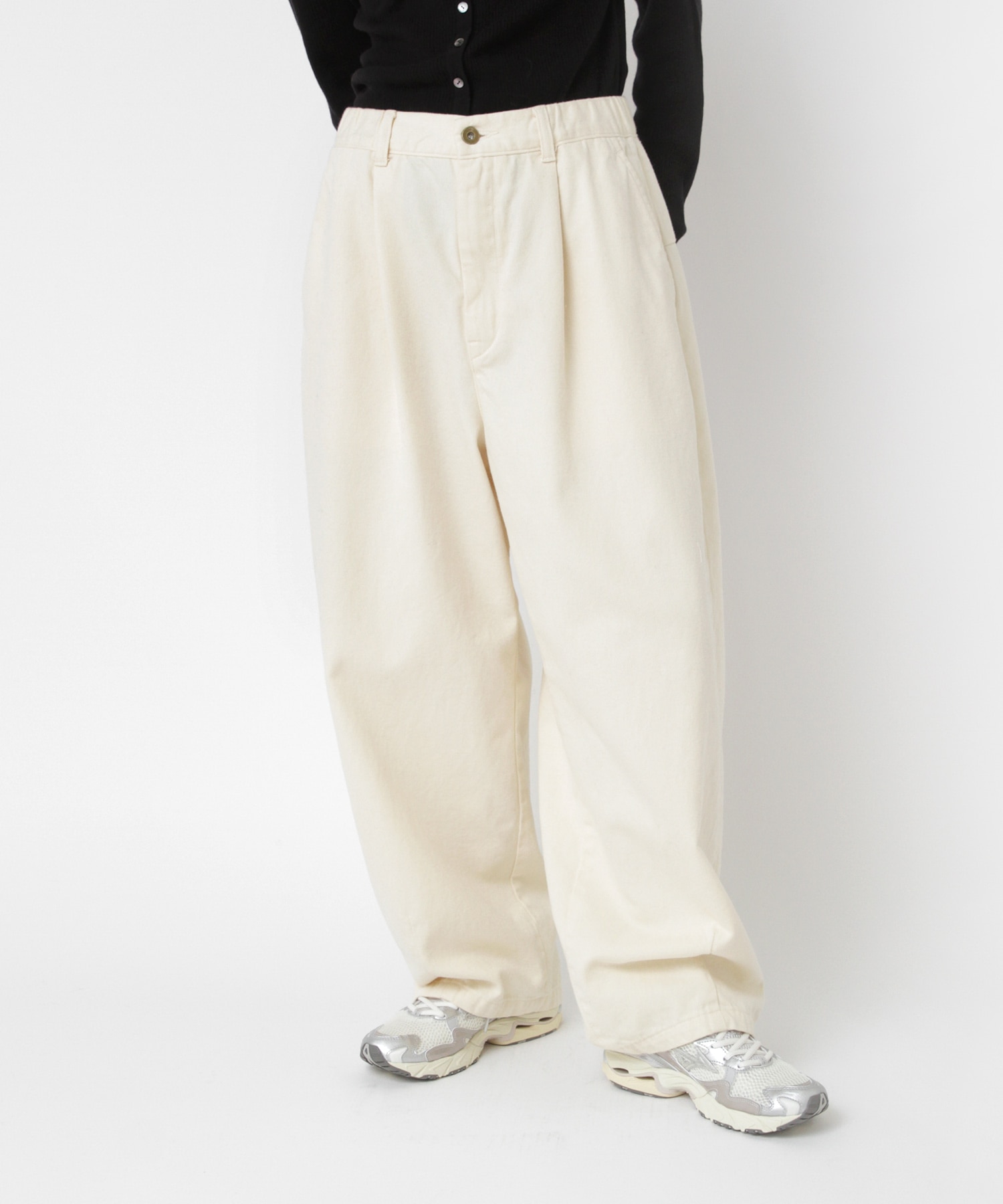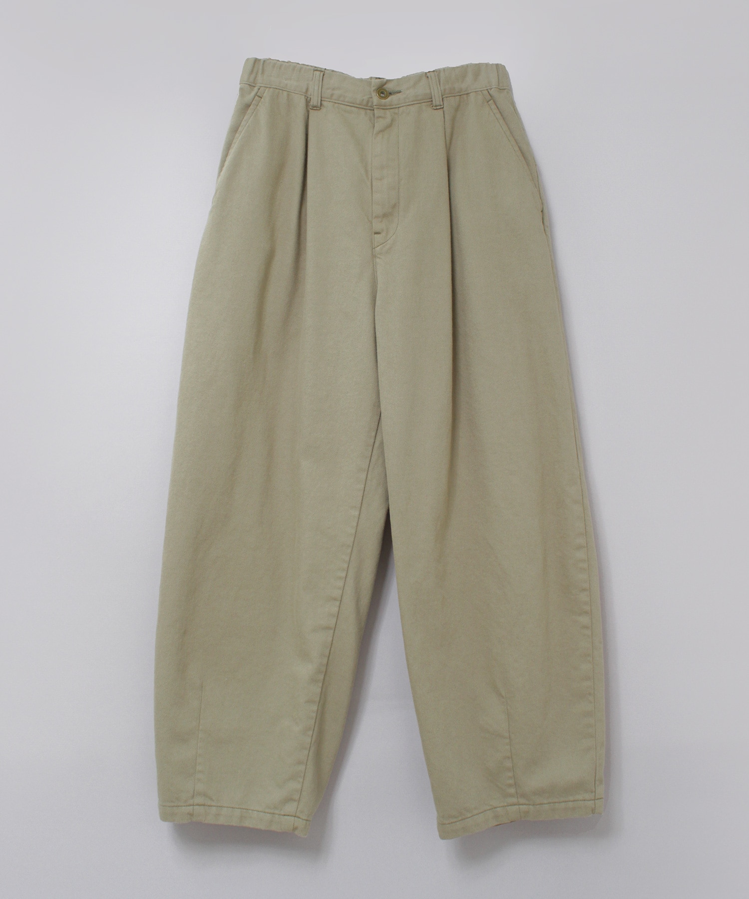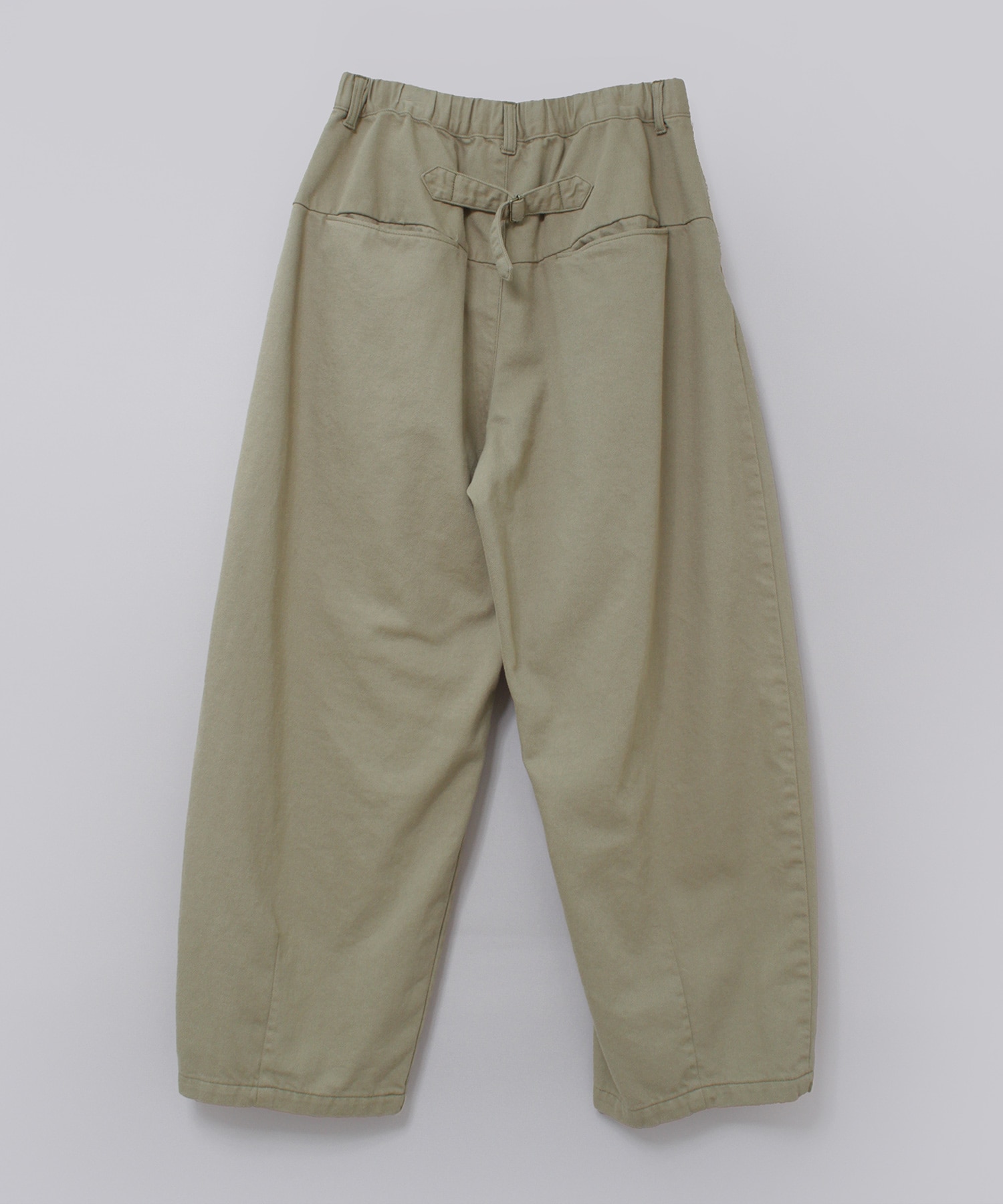 裾の方にカーブを描くような独特なシルエットのワイドパンツです。
