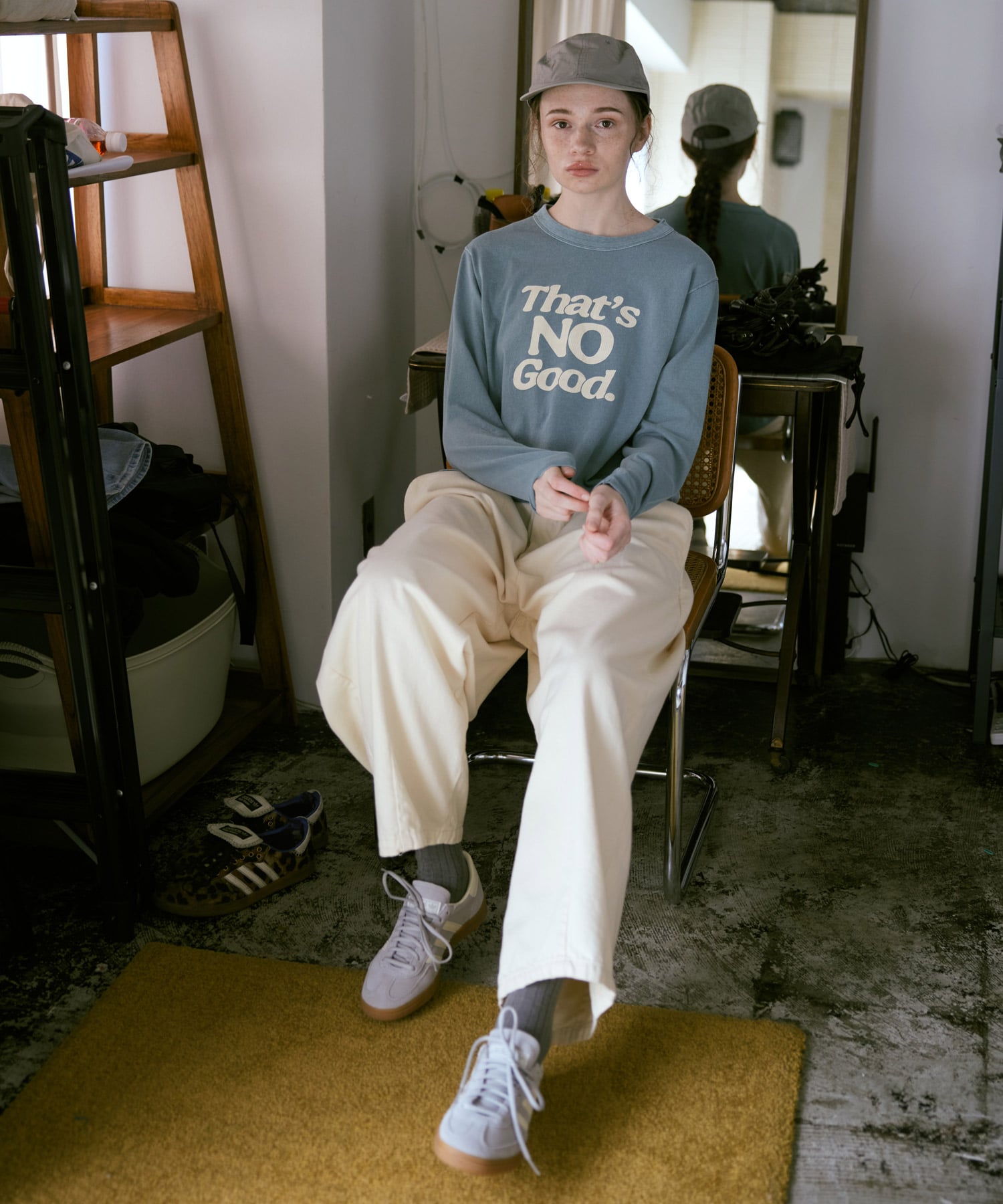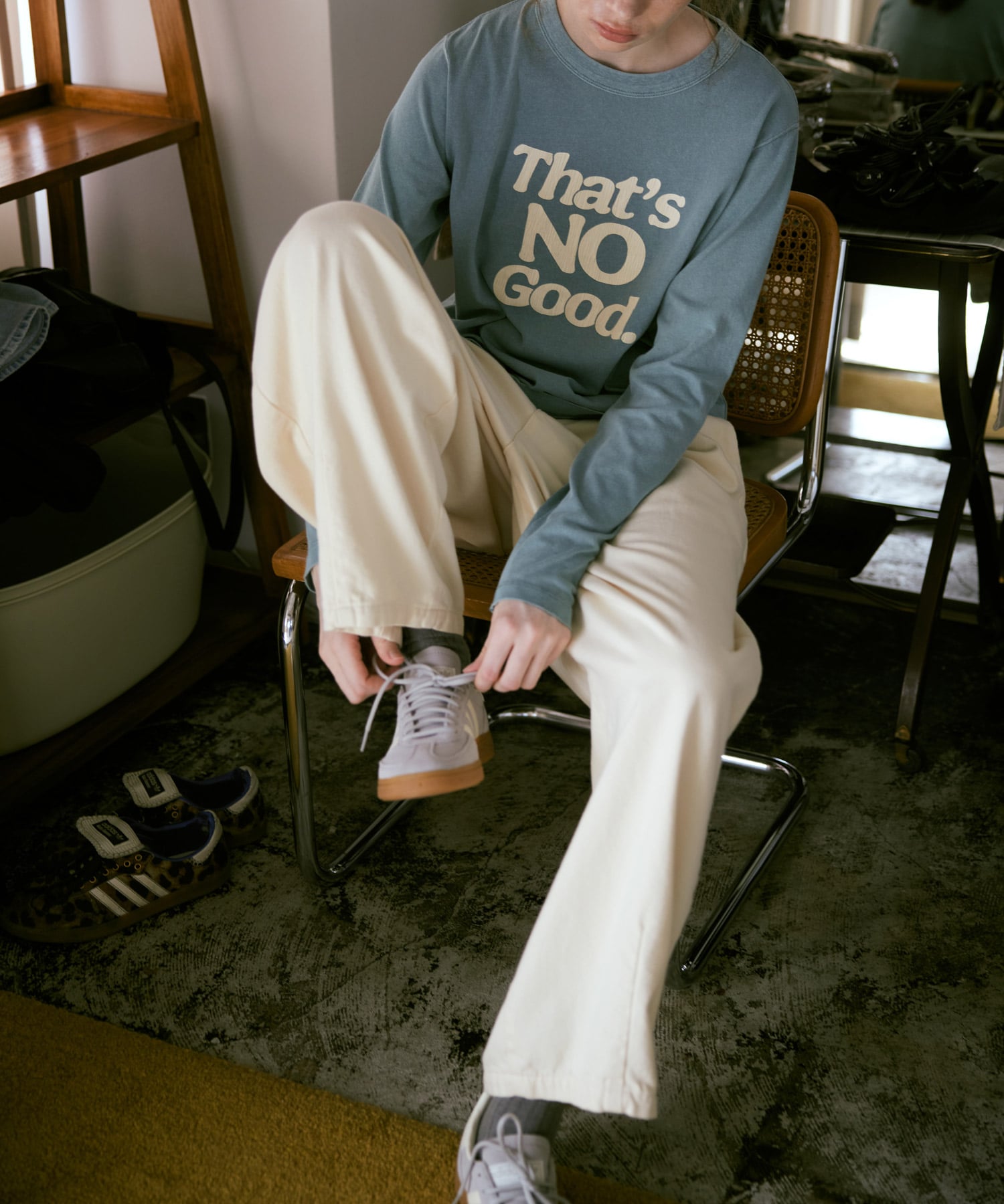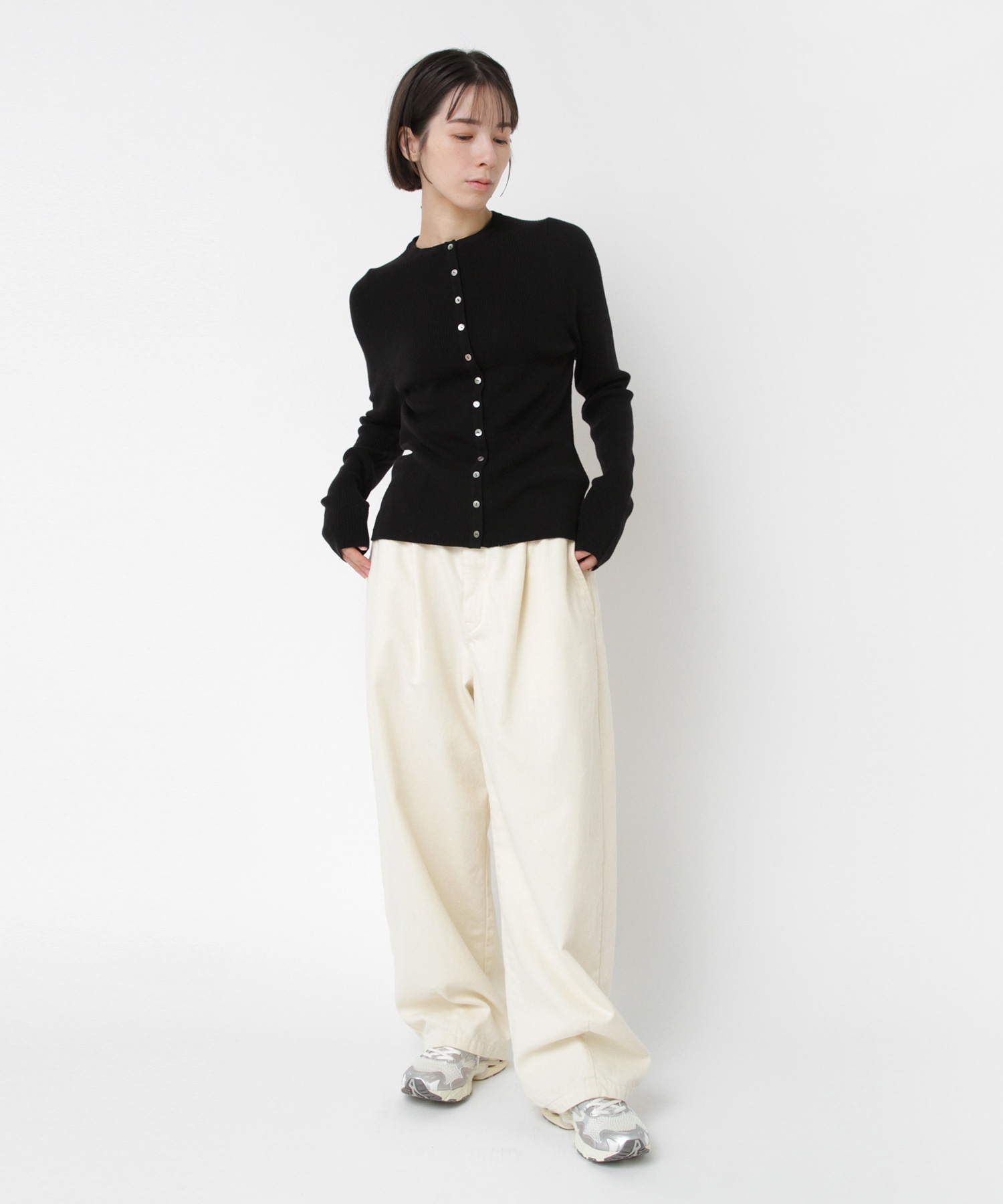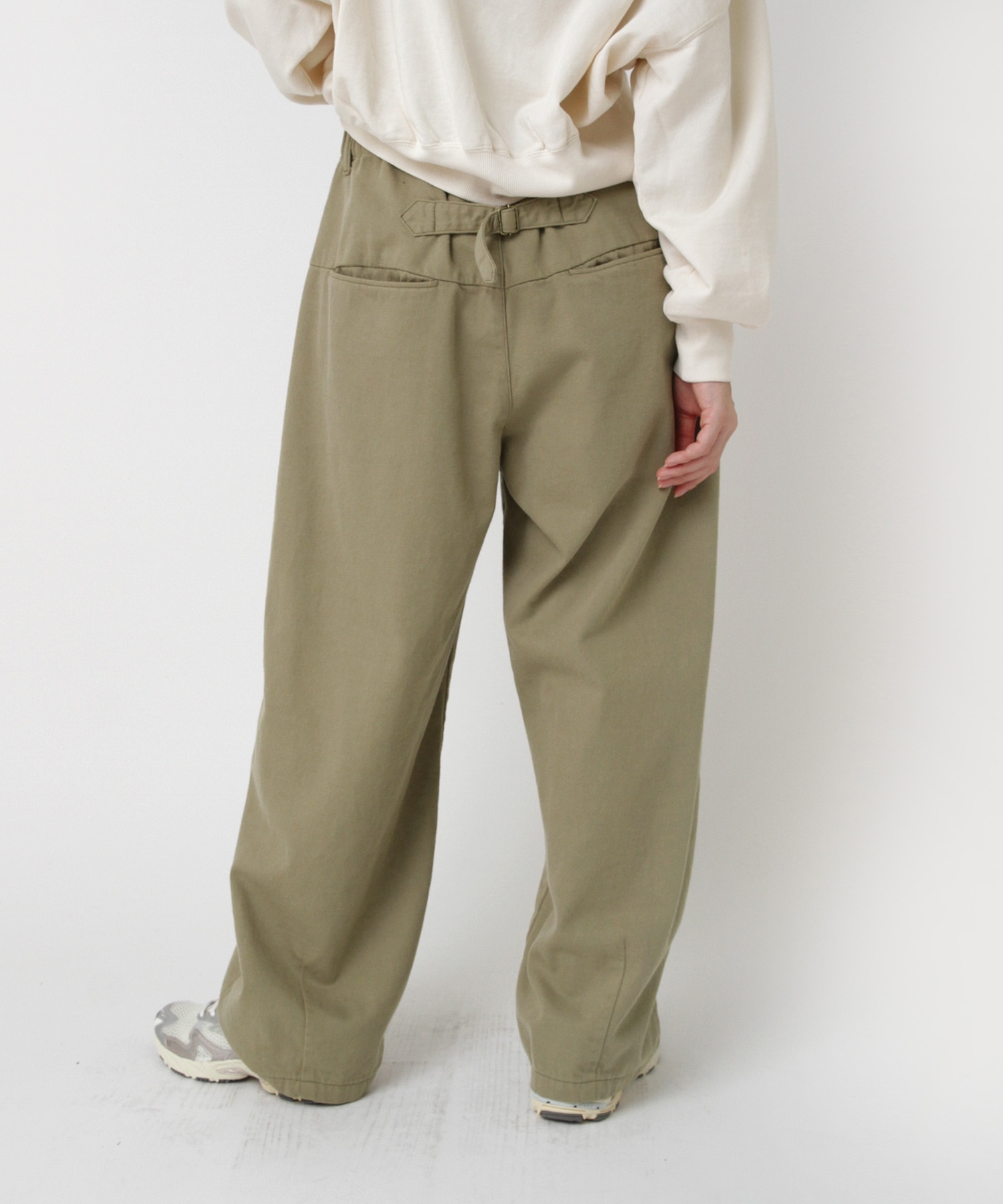 裾の方にカーブを描くような独特なシルエットのワイドパンツです。