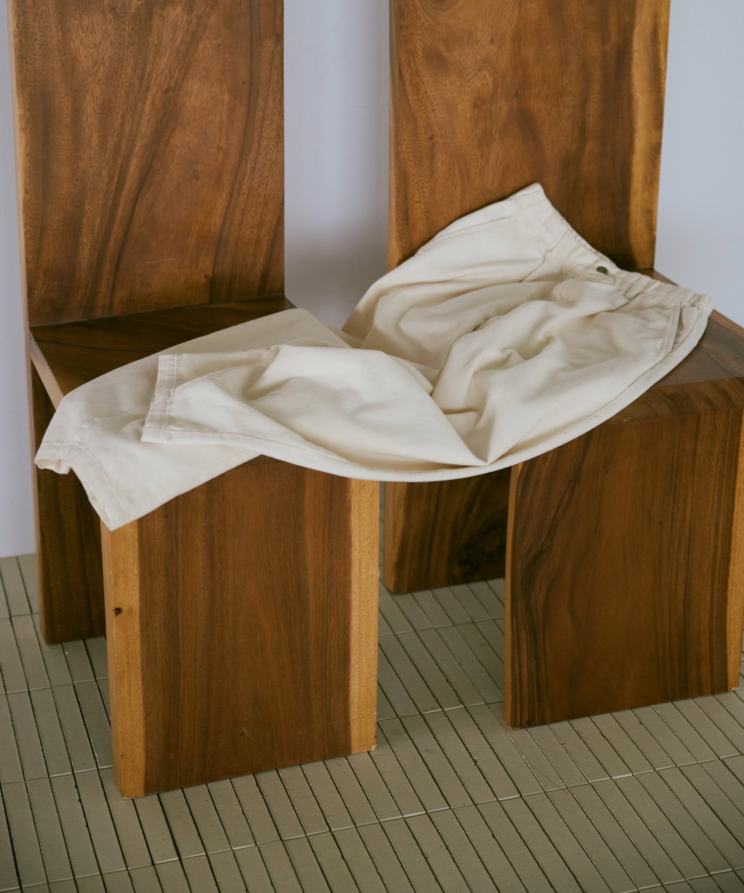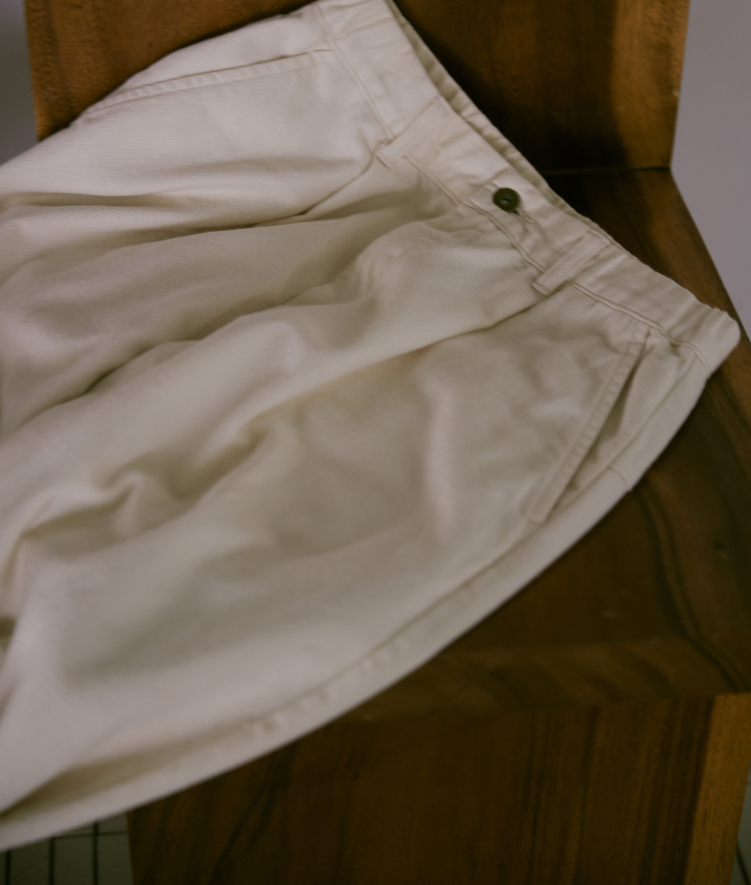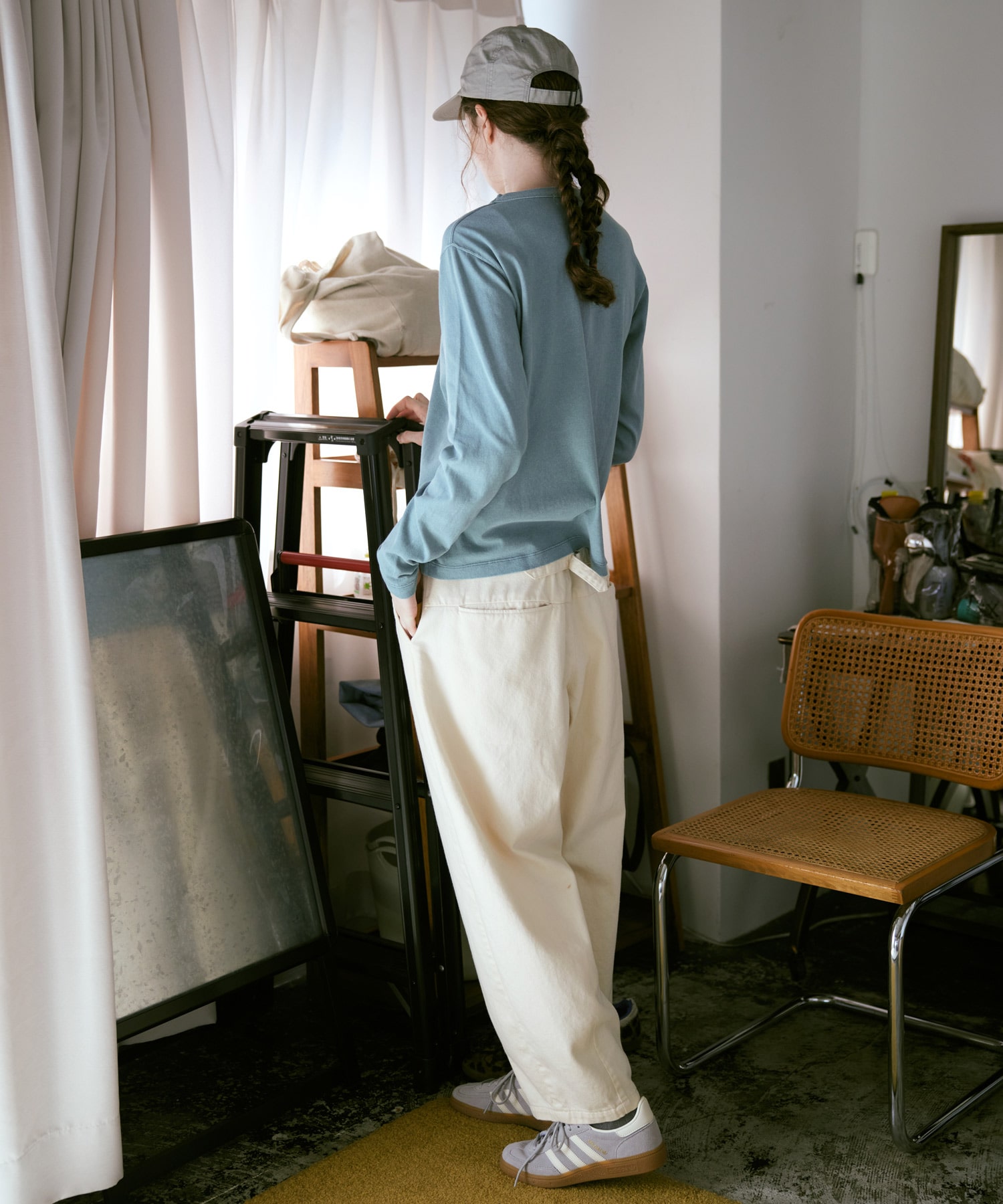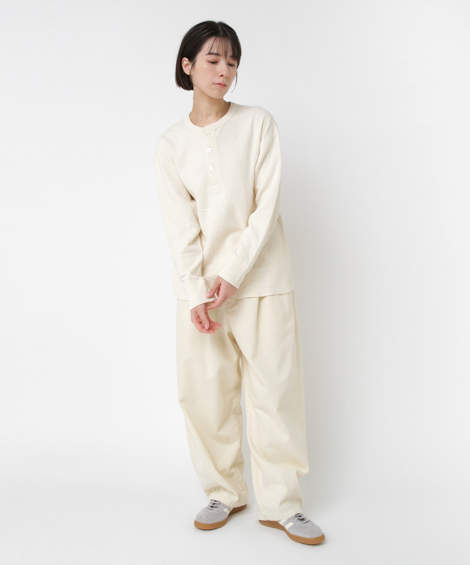 コットンウールの混紡糸を使って製織し、仕上げにタンブラーで揉みこむ事で暖かみのある表面感と上品な洗い晒し感を併せ持ったカジュアルな中肉素材を使用しています。