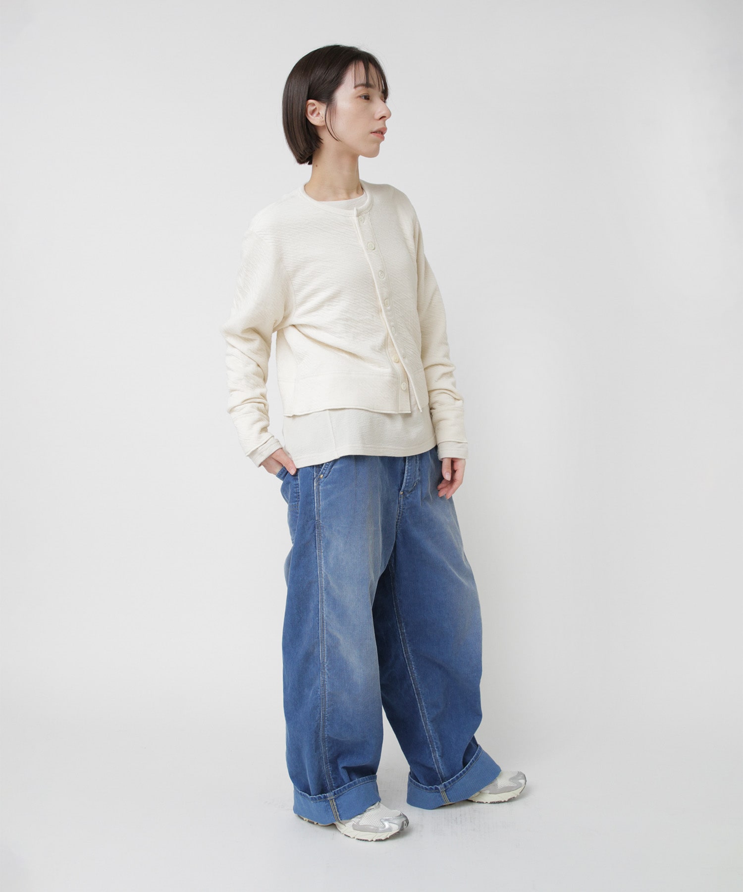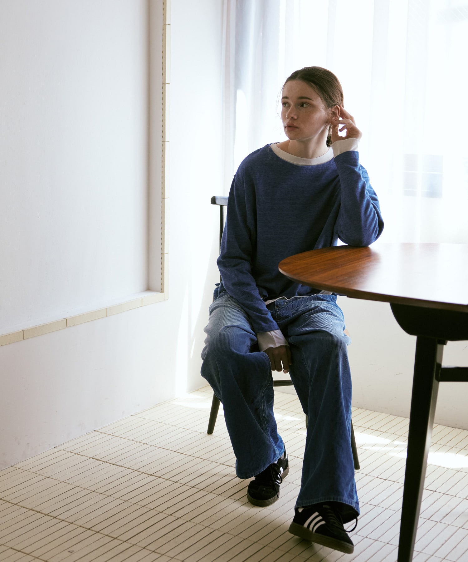 冬はニットと合わせてあたたかみを、夏はTシャツなど軽めのトップスと合わせて、素材のコントラストを楽しんでいただくのもおすすめです。