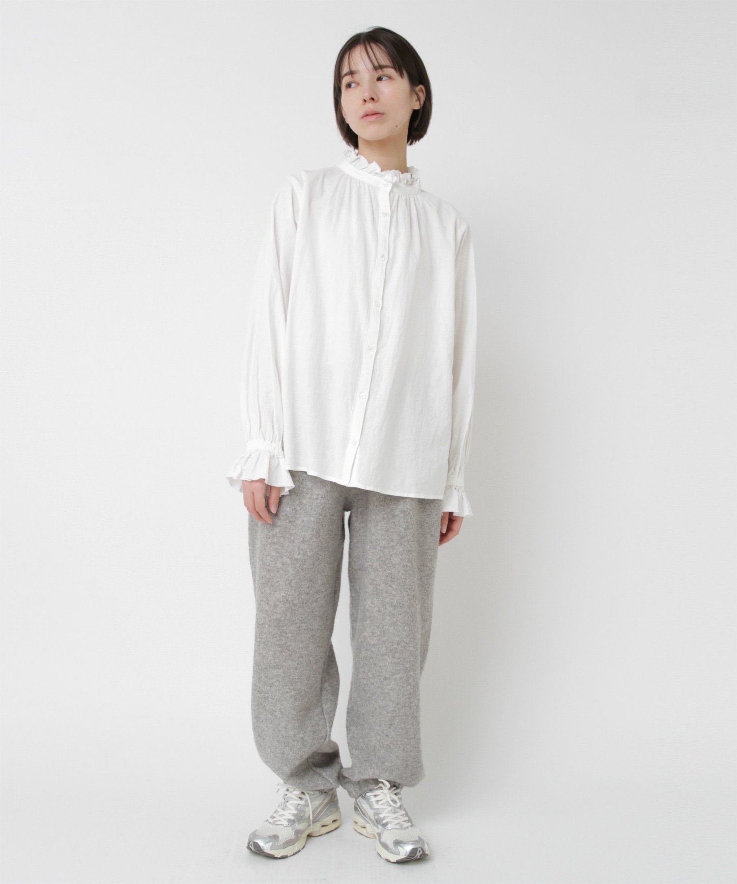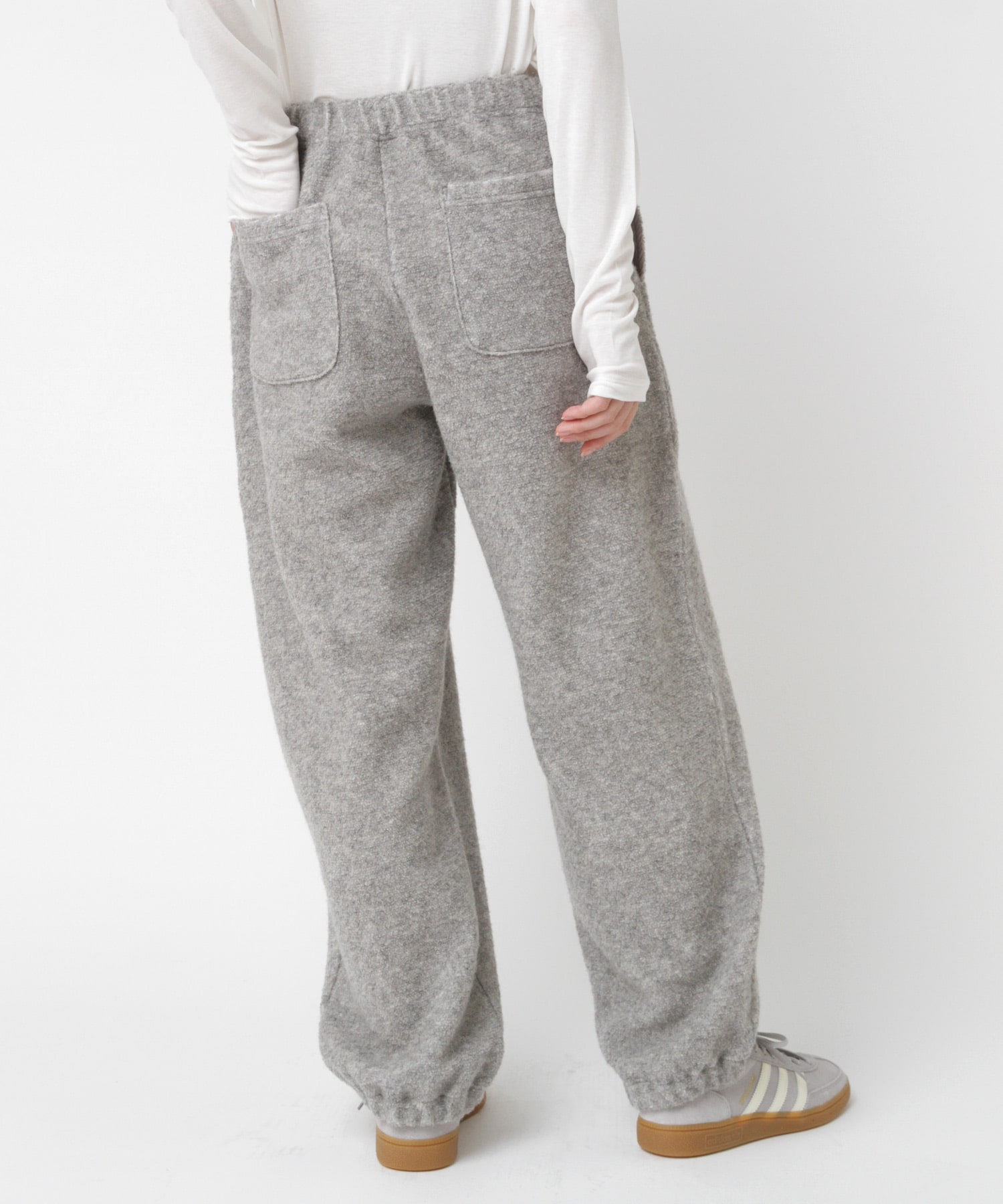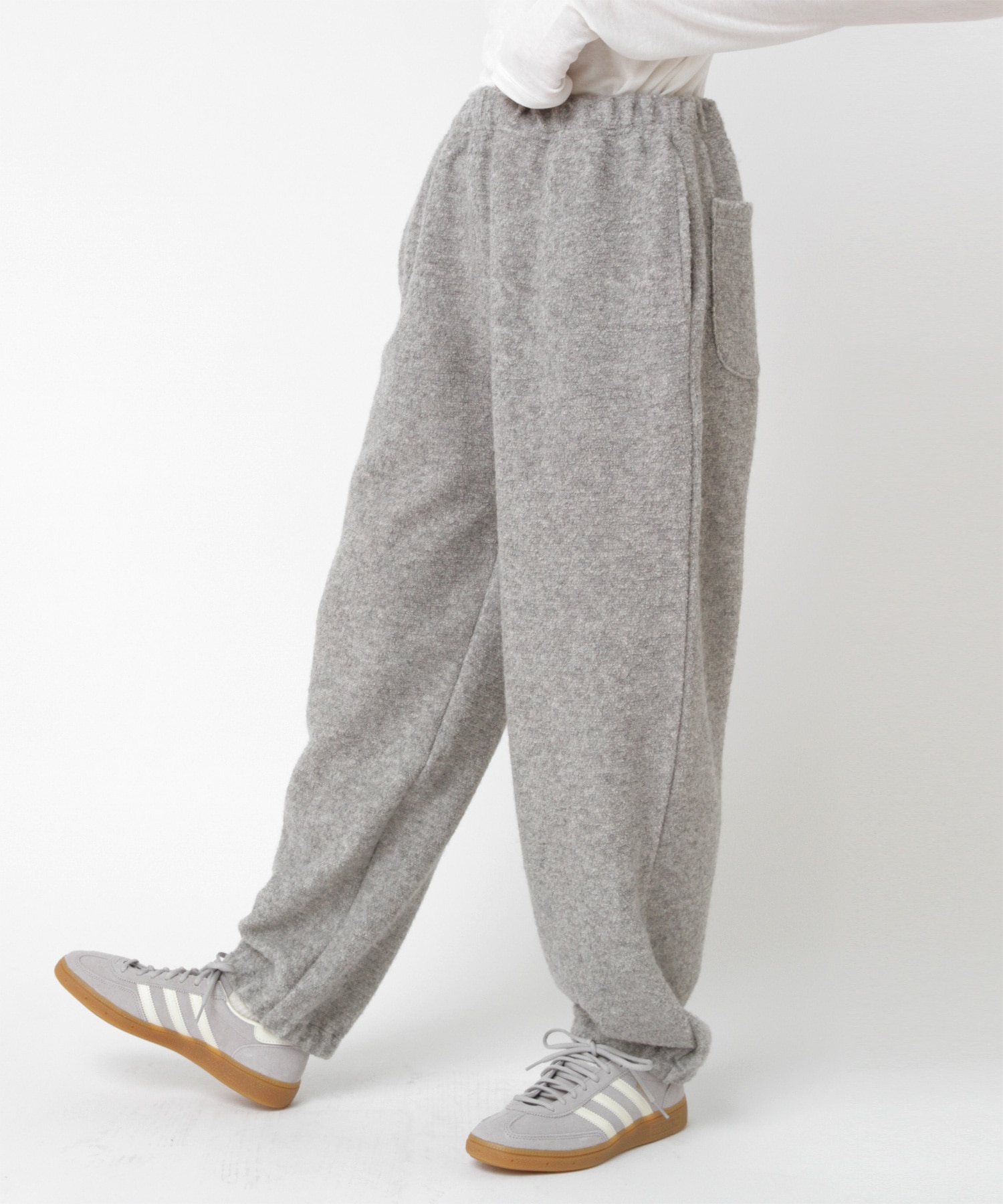 太めのシルエットに、ウエストはゴムとシャーリングで全体にゆるくカジュアルなムードをプラス。
