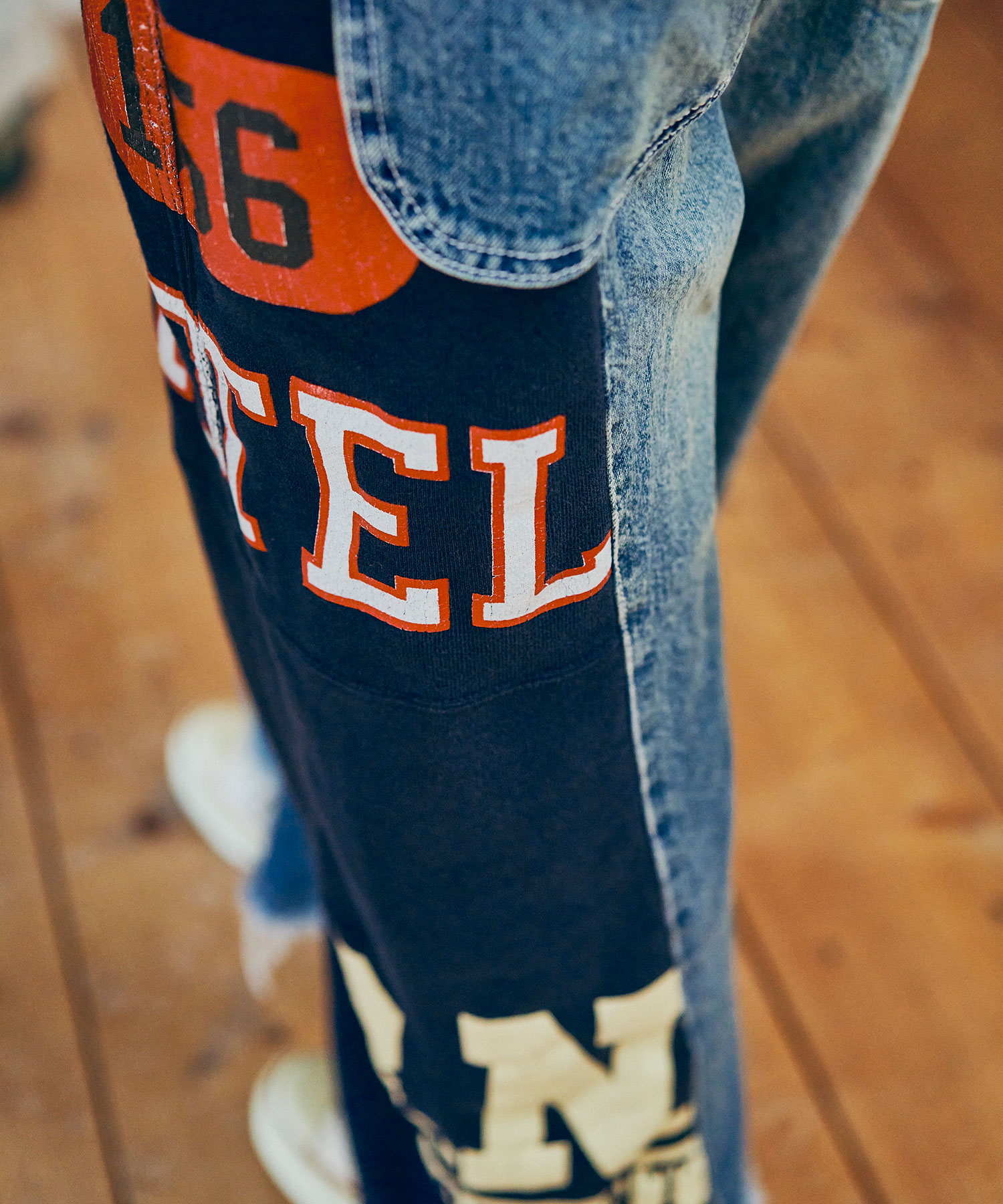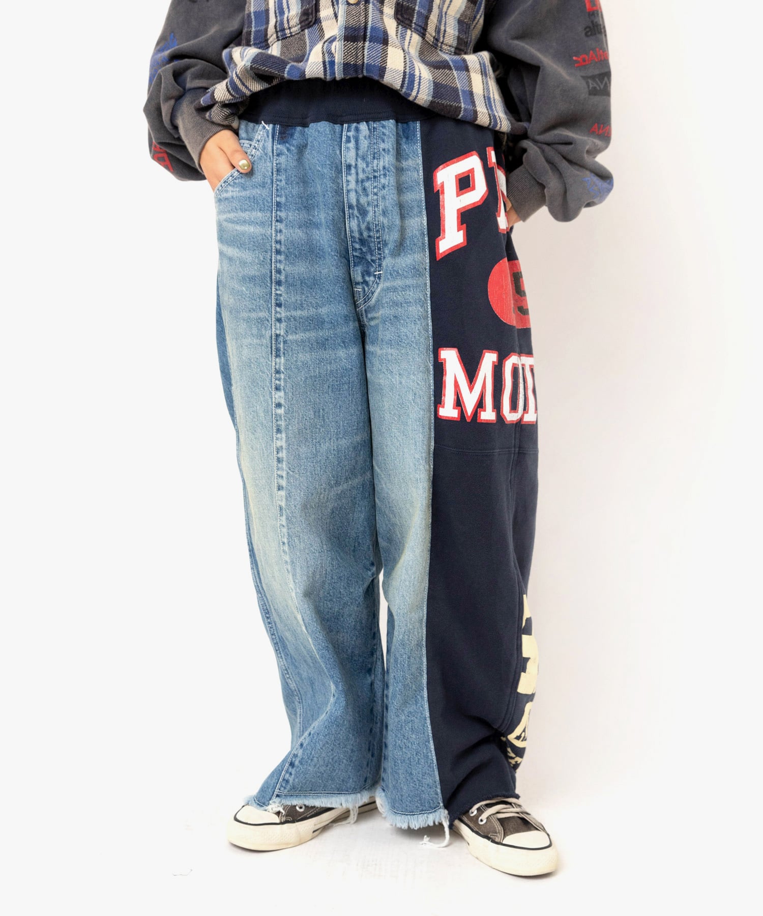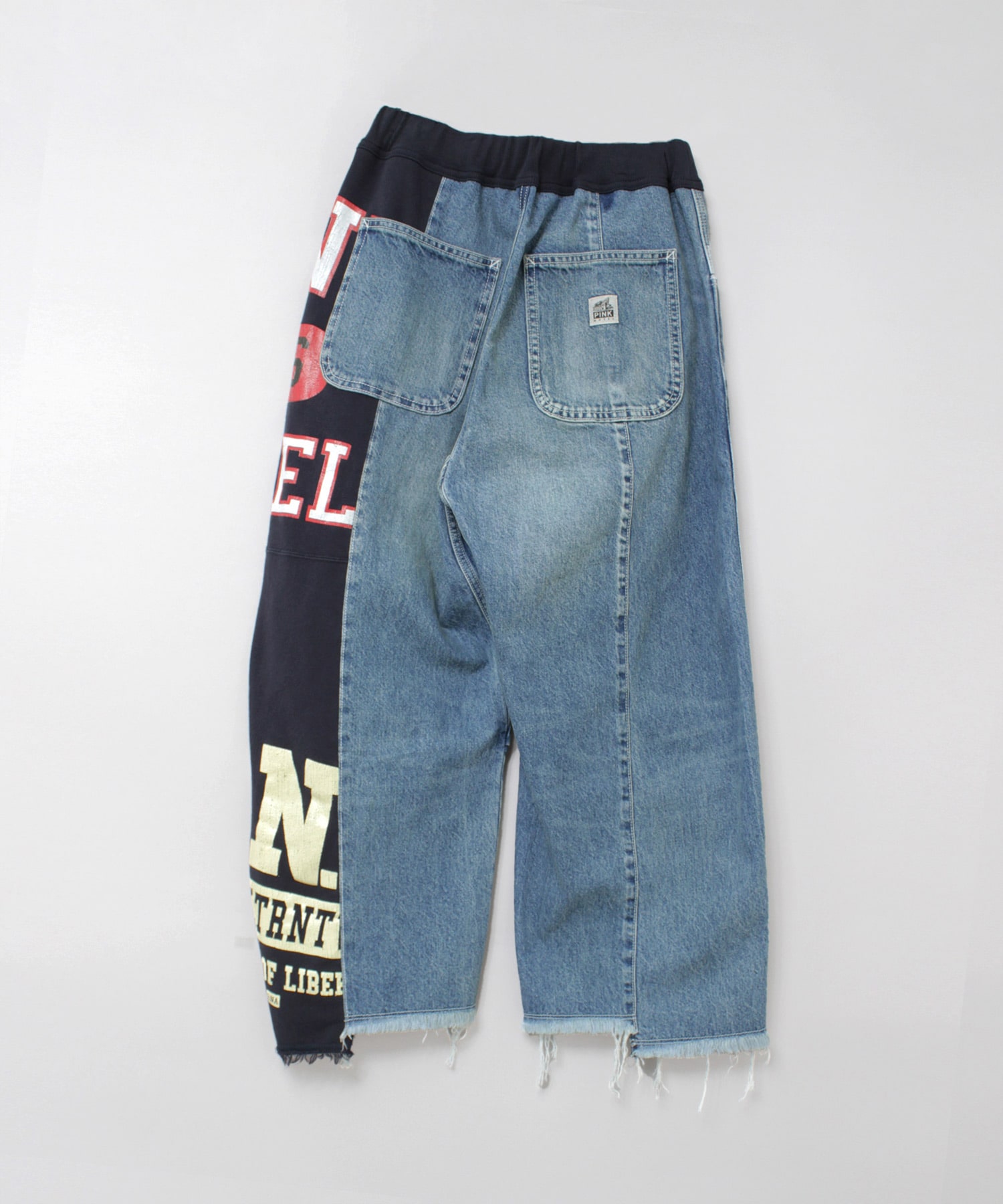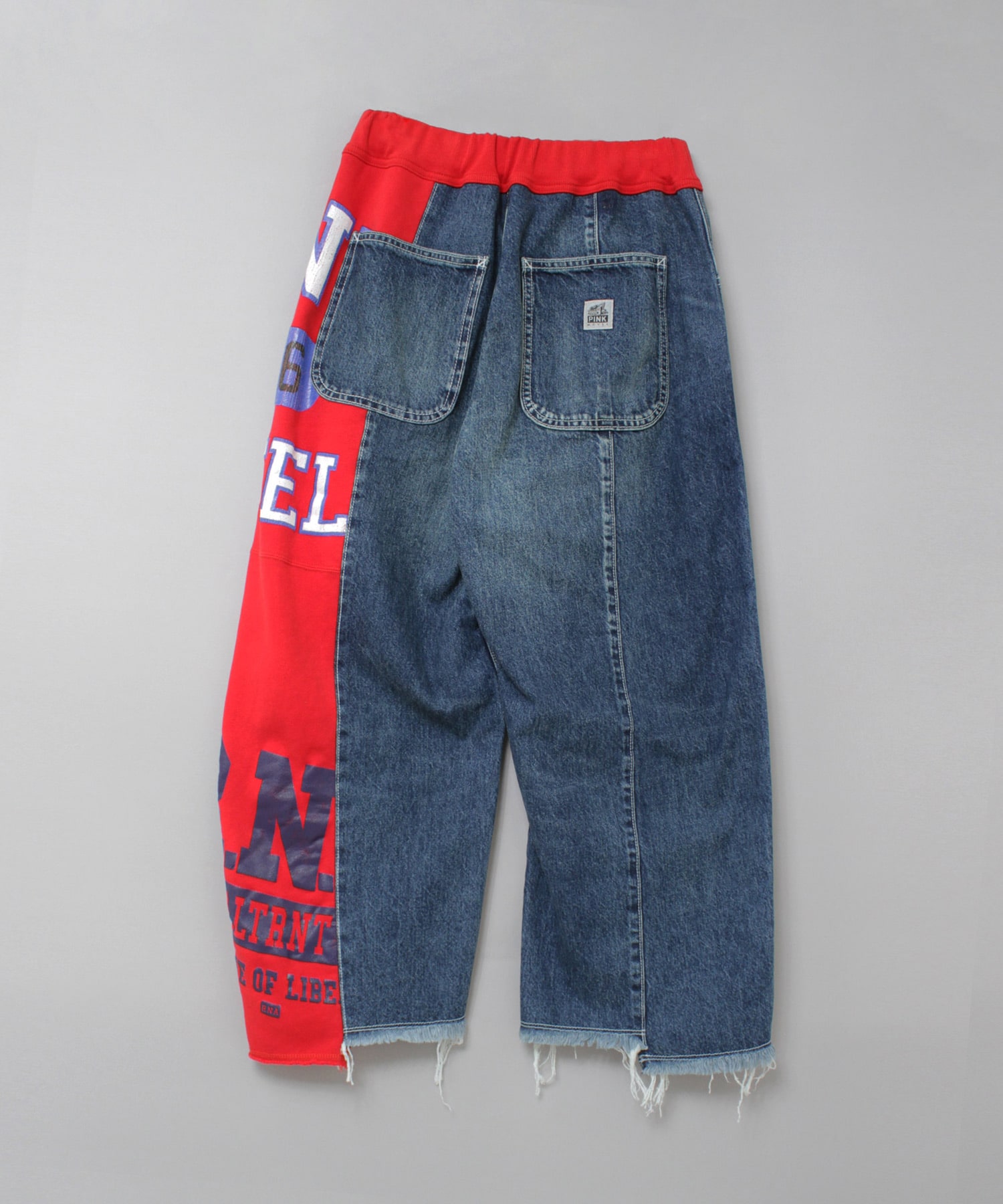 このパンツは、ワークパンツと裏毛スウェットパンツとトレーナーを大胆に組み合わせた、リメイク調のコラージュデザインが魅力です。デザインの特徴は、左右非対称なパッチワークでデニムワークパンツの片足に、裏毛スウェットパンツやトレーナーをはめ込んだようなストーリー性のあるデザインです。さらにデニムのウエストベルトを外して代わりにトレーナーのリブを取り付けることで、快適なイージーパンツ仕様を実現しました。
