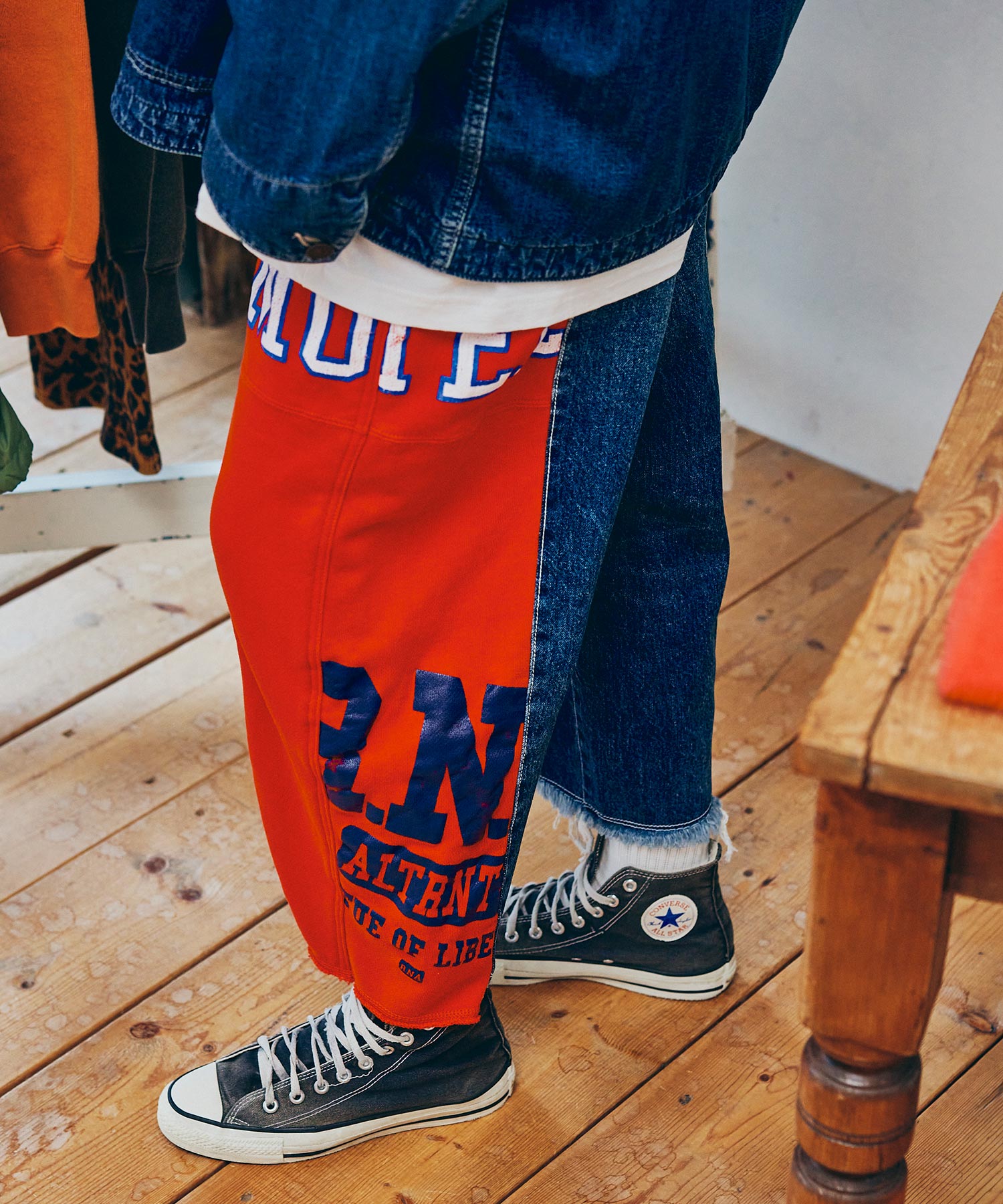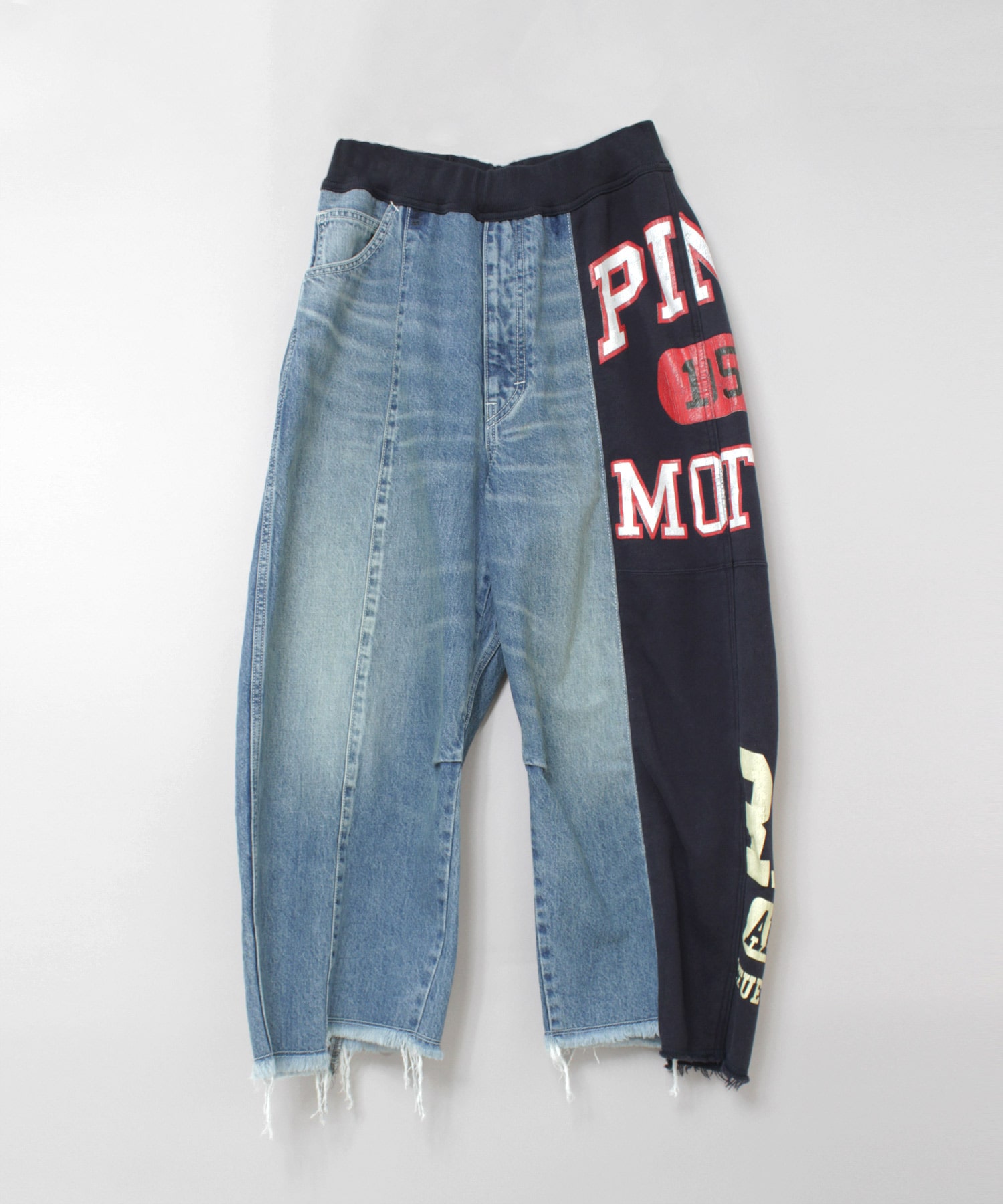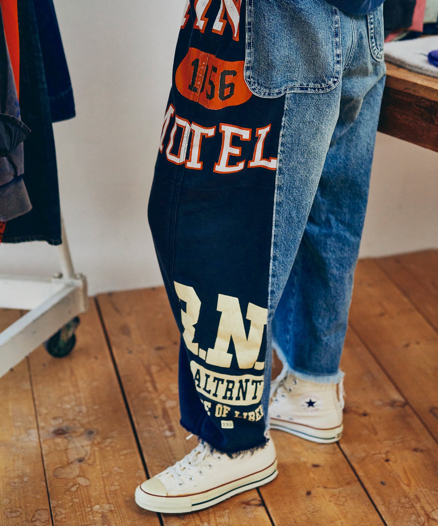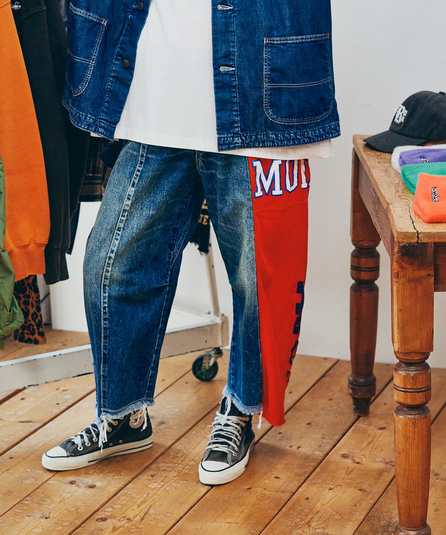 このパンツは、ワークパンツと裏毛スウェットパンツとトレーナーを大胆に組み合わせた、リメイク調のコラージュデザインが魅力です。デザインの特徴は、左右非対称なパッチワークでデニムワークパンツの片足に、裏毛スウェットパンツやトレーナーをはめ込んだようなストーリー性のあるデザインです。さらにデニムのウエストベルトを外して代わりにトレーナーのリブを取り付けることで、快適なイージーパンツ仕様を実現しました。