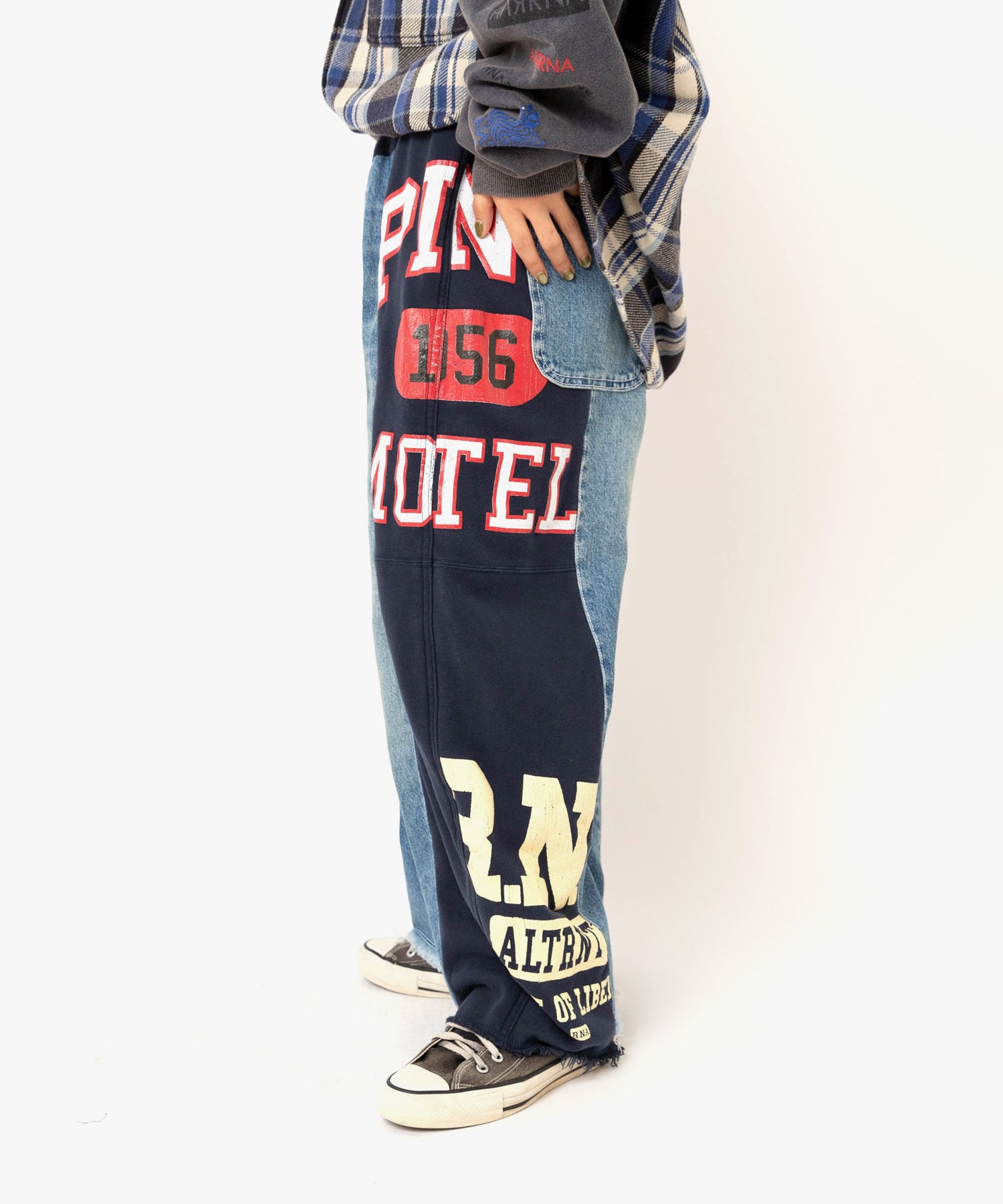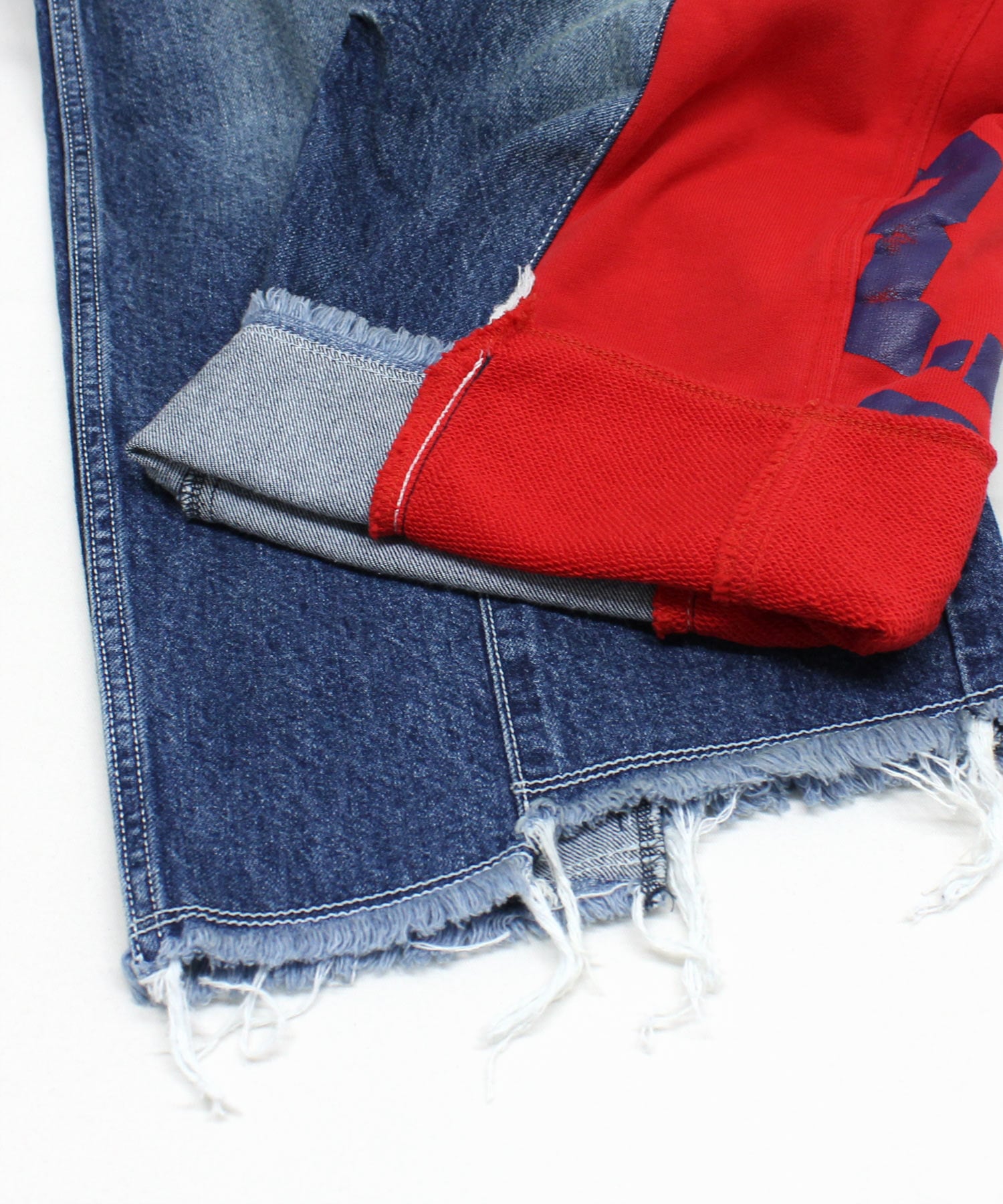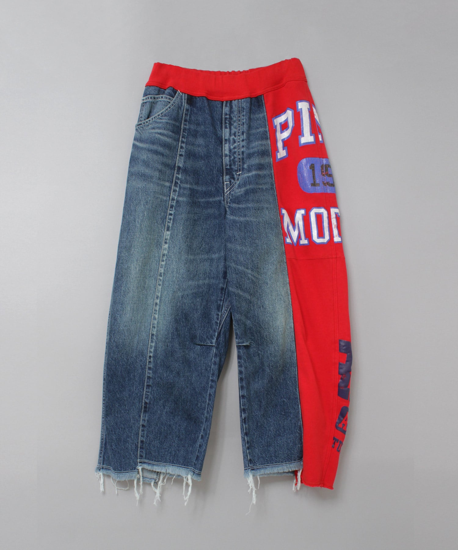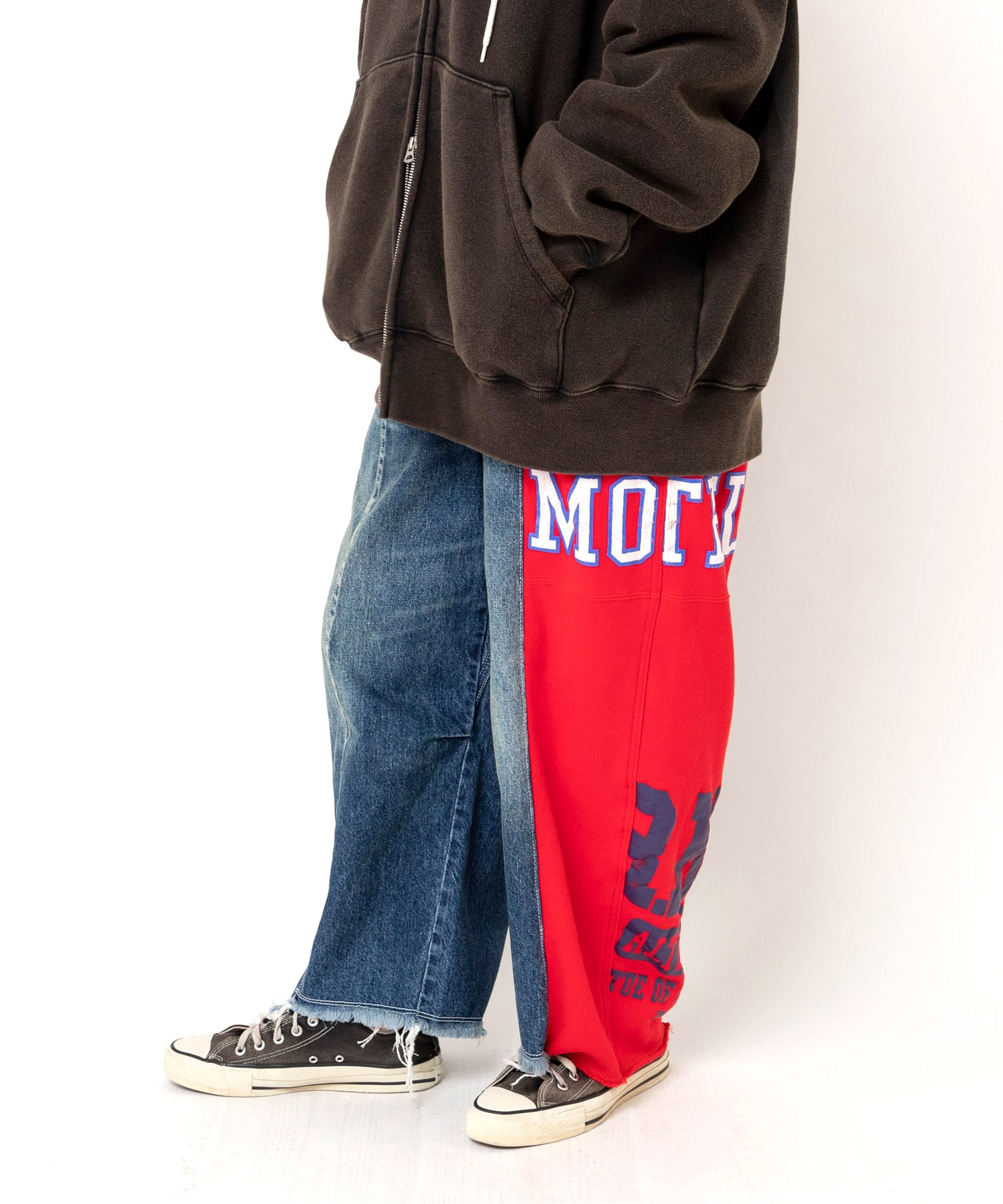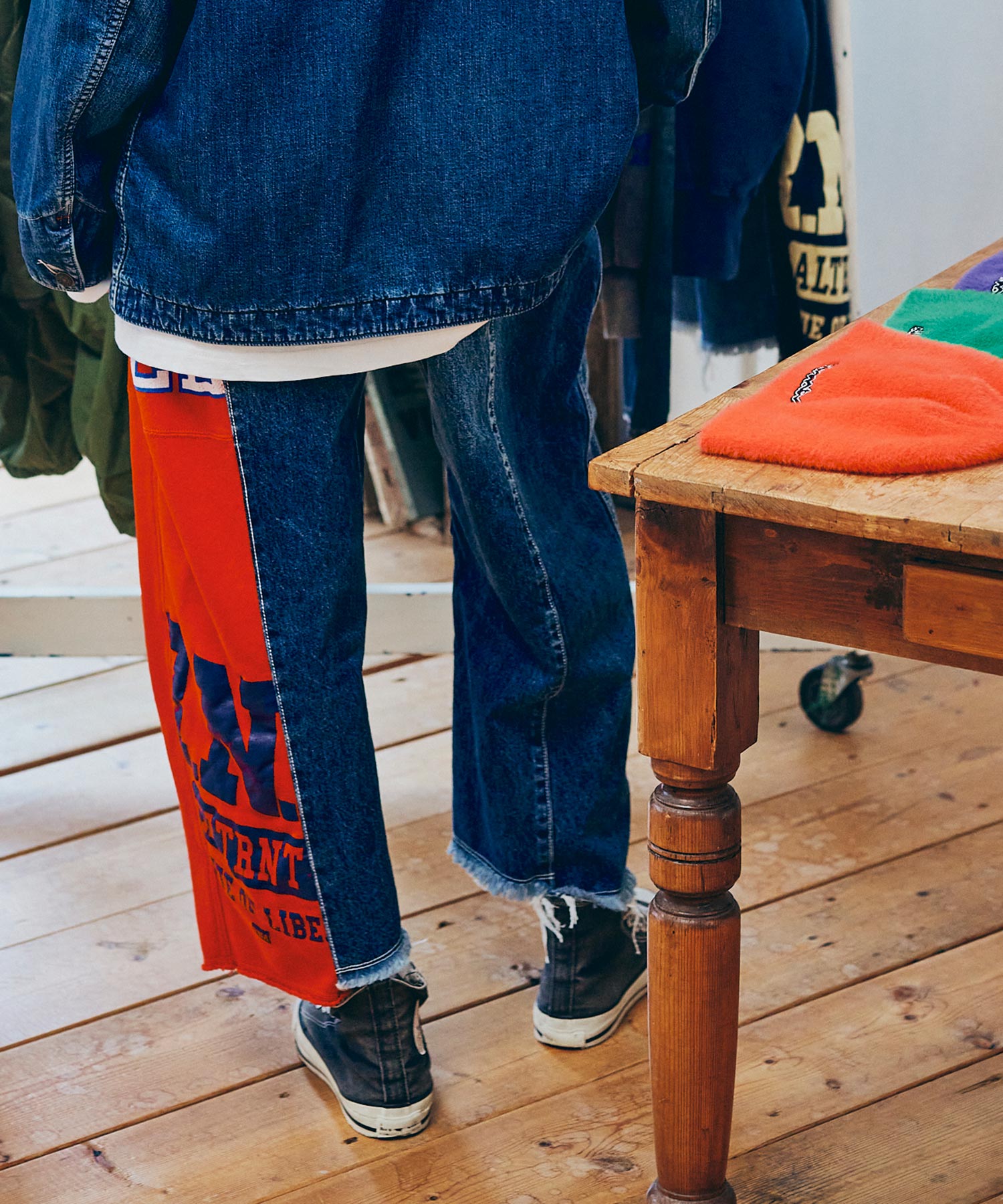 このパンツは、ワークパンツと裏毛スウェットパンツとトレーナーを大胆に組み合わせた、リメイク調のコラージュデザインが魅力です。デザインの特徴は、左右非対称なパッチワークでデニムワークパンツの片足に、裏毛スウェットパンツやトレーナーをはめ込んだようなストーリー性のあるデザインです。さらにデニムのウエストベルトを外して代わりにトレーナーのリブを取り付けることで、快適なイージーパンツ仕様を実現しました。