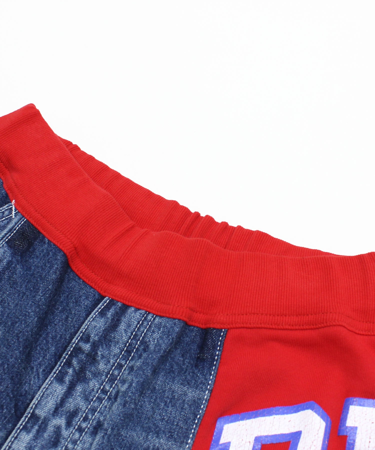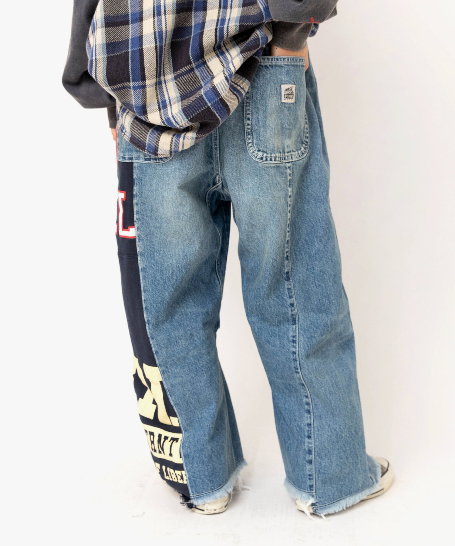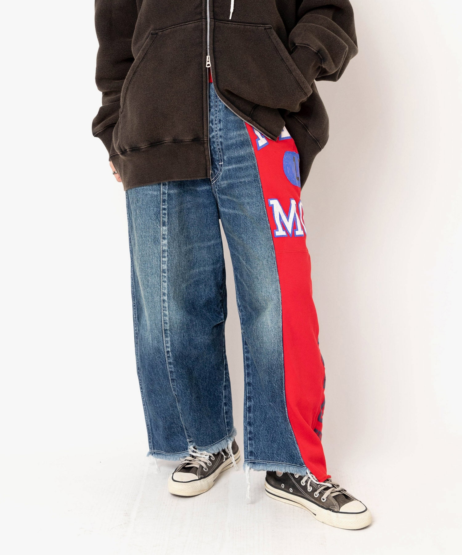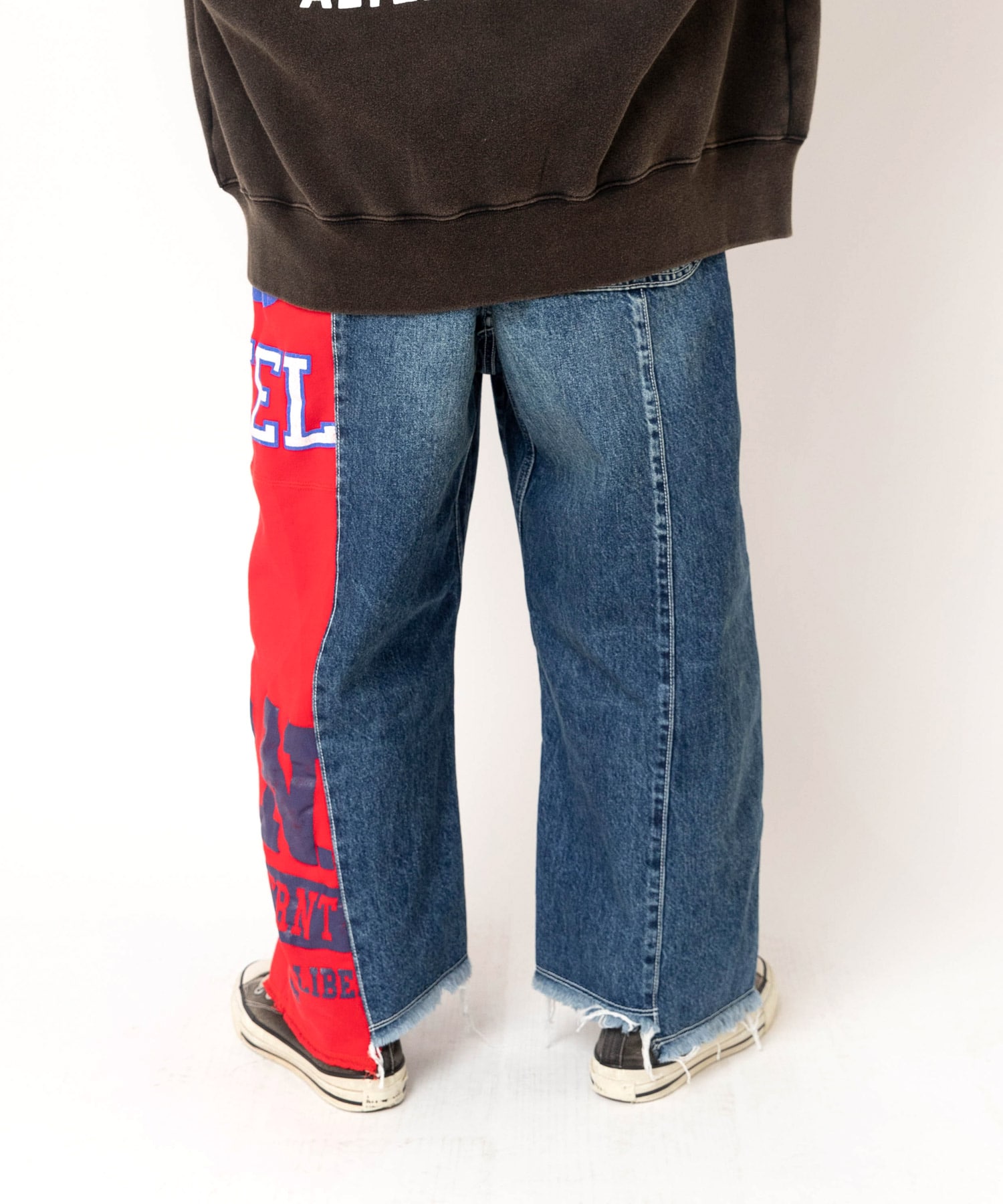 このパンツは、ワークパンツと裏毛スウェットパンツとトレーナーを大胆に組み合わせた、リメイク調のコラージュデザインが魅力です。デザインの特徴は、左右非対称なパッチワークでデニムワークパンツの片足に、裏毛スウェットパンツやトレーナーをはめ込んだようなストーリー性のあるデザインです。さらにデニムのウエストベルトを外して代わりにトレーナーのリブを取り付けることで、快適なイージーパンツ仕様を実現しました。