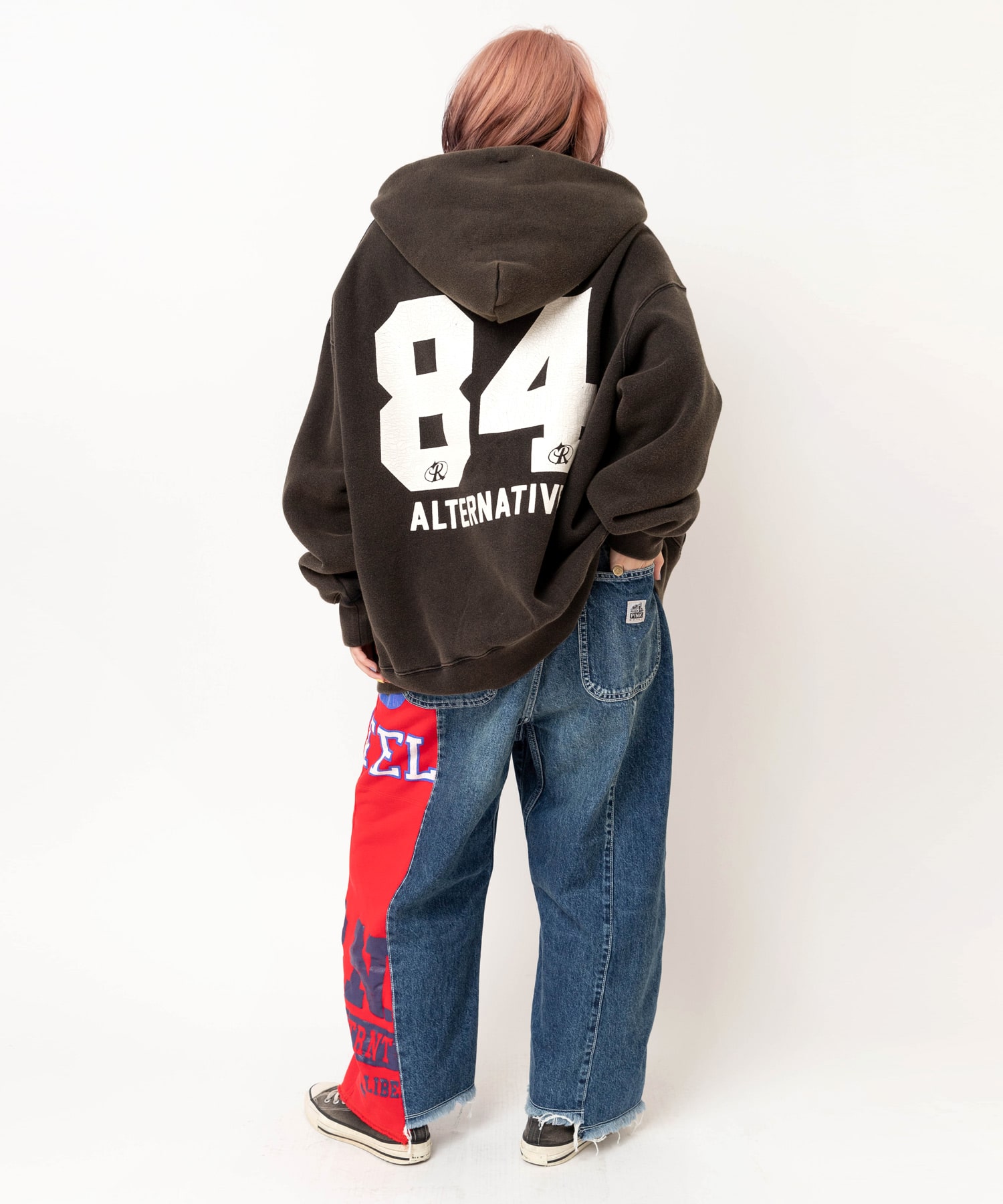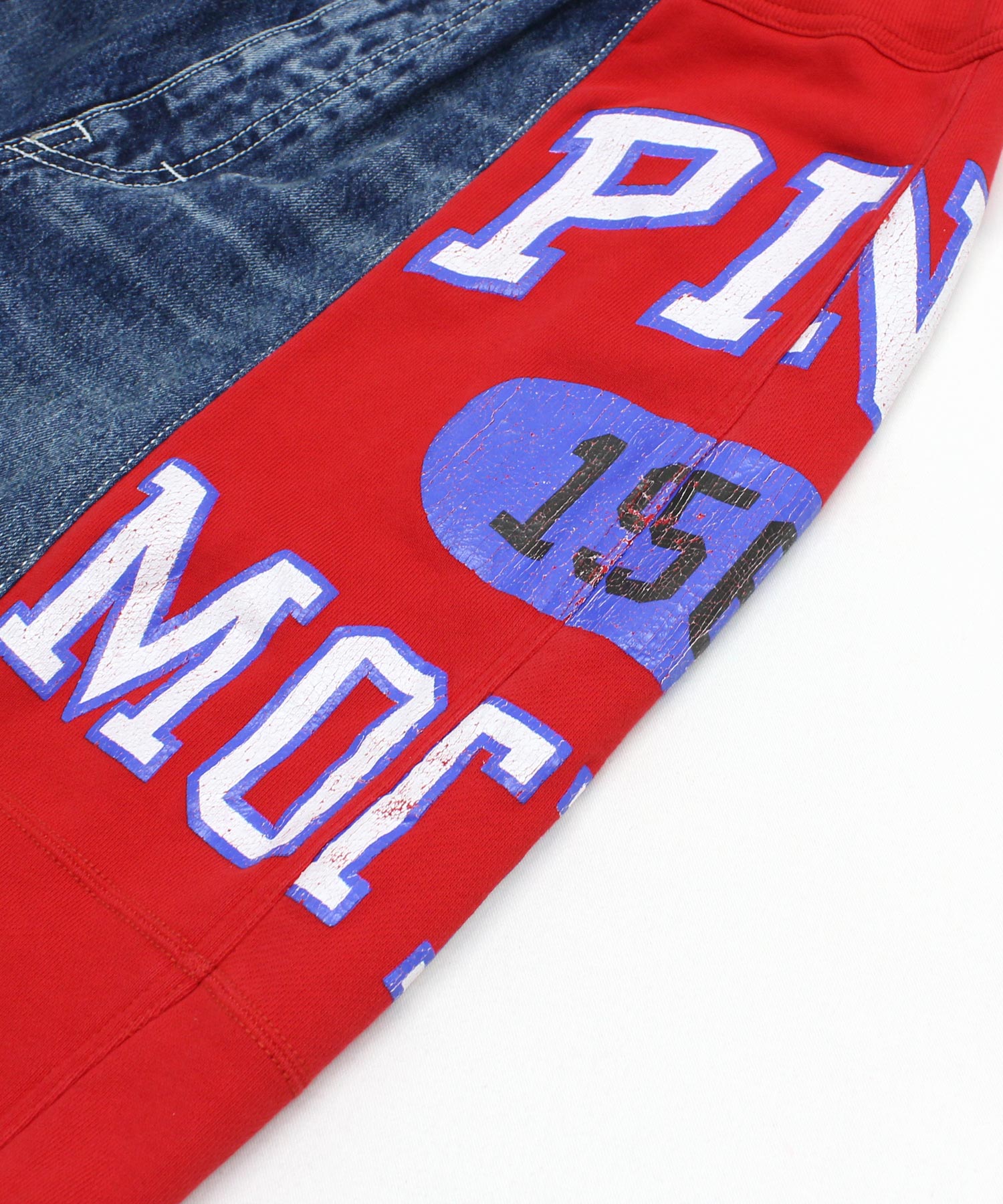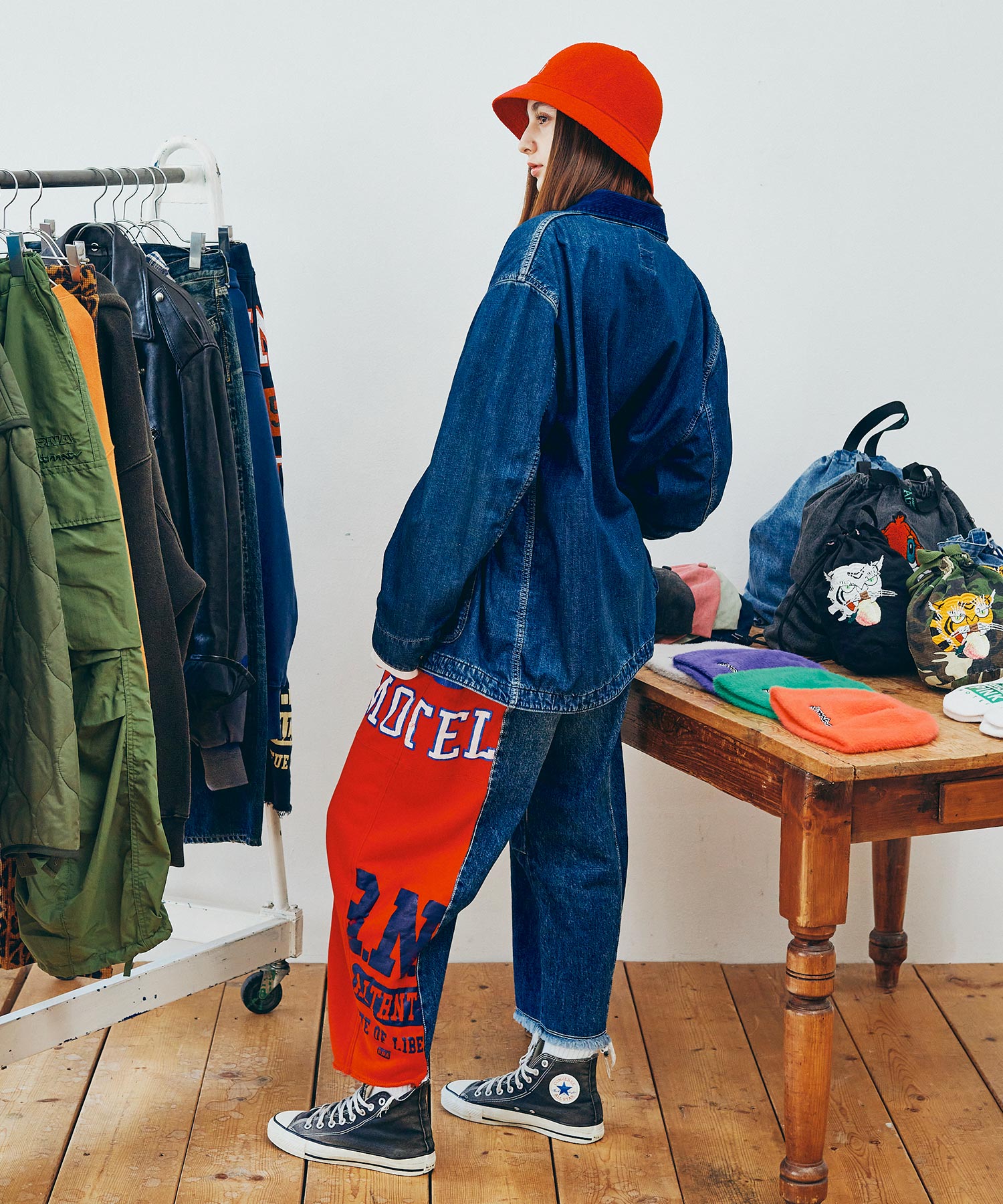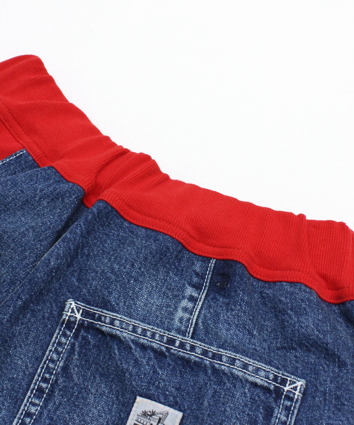 このパンツは、ワークパンツと裏毛スウェットパンツとトレーナーを大胆に組み合わせた、リメイク調のコラージュデザインが魅力です。デザインの特徴は、左右非対称なパッチワークでデニムワークパンツの片足に、裏毛スウェットパンツやトレーナーをはめ込んだようなストーリー性のあるデザインです。さらにデニムのウエストベルトを外して代わりにトレーナーのリブを取り付けることで、快適なイージーパンツ仕様を実現しました。