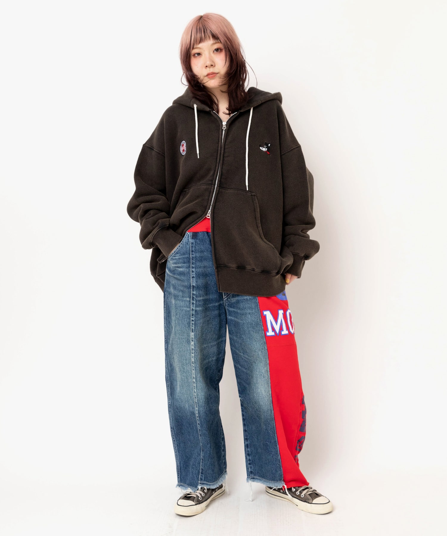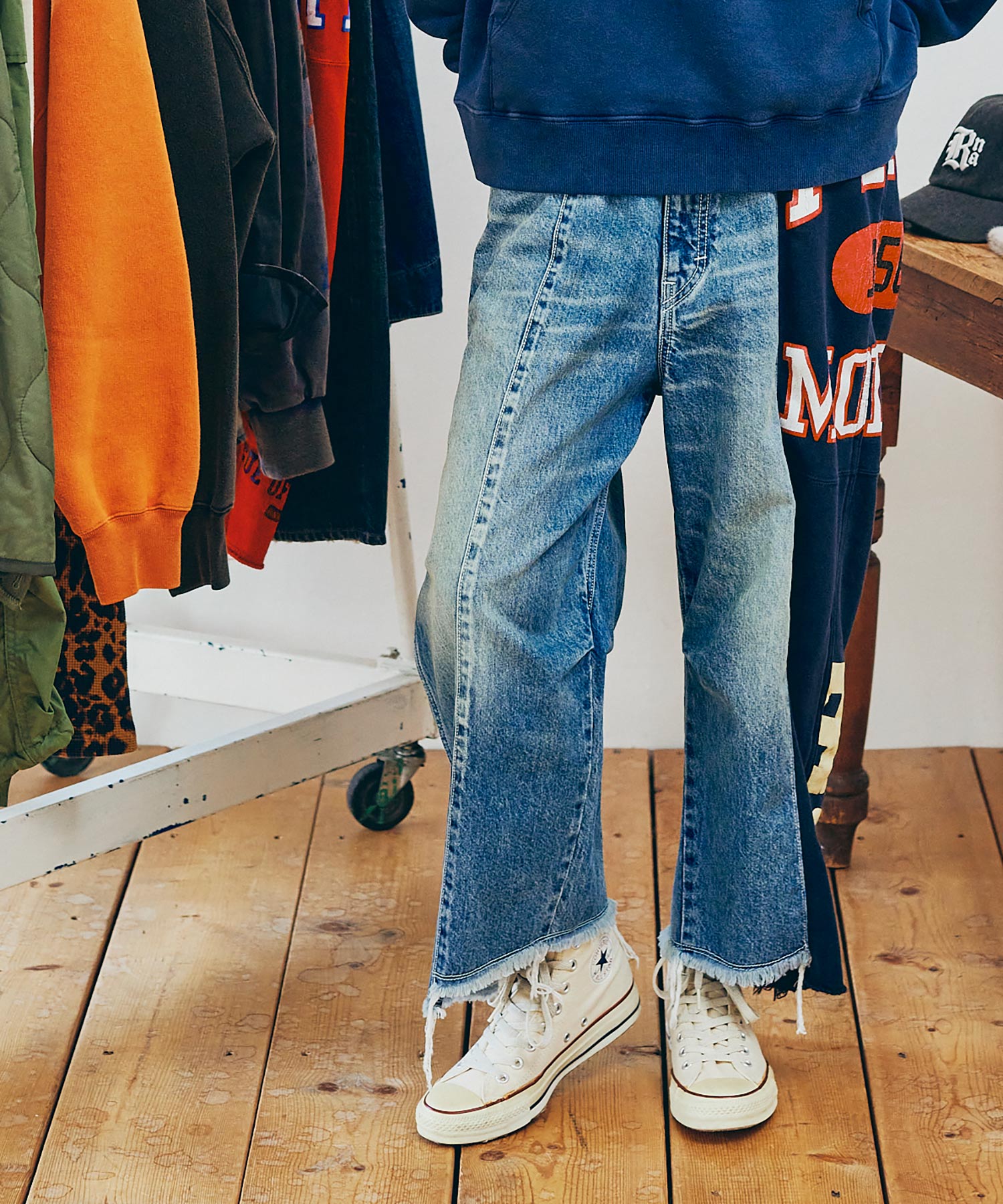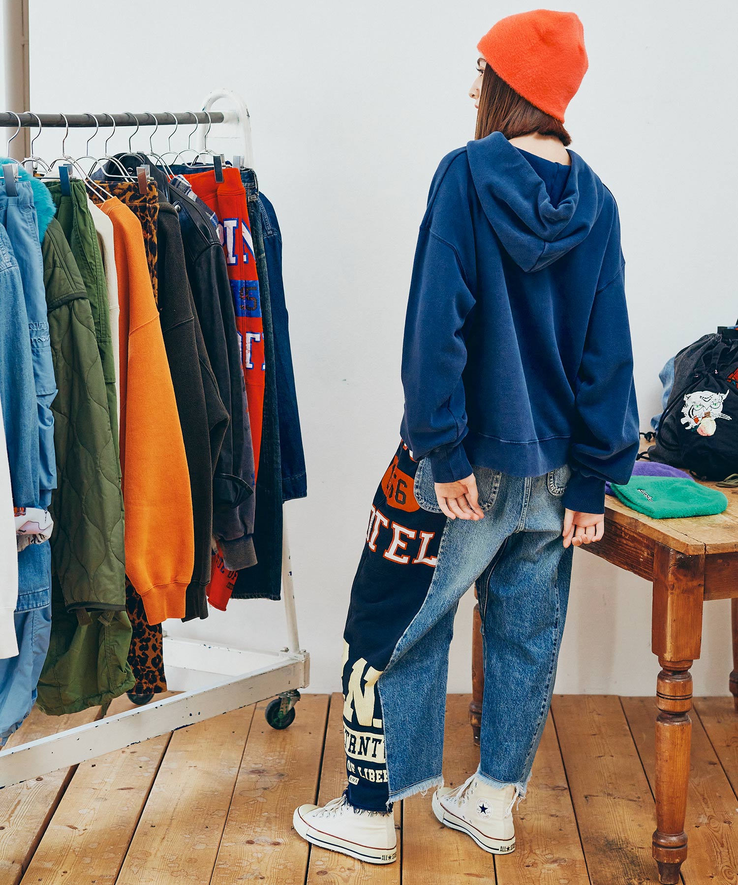 素材にはビンテージ感のあるムラ感が特徴の日本製デニムと、しっかりとした裏毛スウェット生地を使用し、異素材のコントラストが楽しめます。シルエットは、股上が深めのリラックスルーズシルエットを採用しました。特に、ややカーブしたアウトシーム(脇線)が女性らしい曲線を描き、ルーズながらもクールなシルエットを実現します。ジャストなレングスで軽快に着用可能です。製作工程にもこだわり、デニムパーツと裏毛パーツを別々に加工した後、ドッキングするという、手間と時間をかけた特別な工程を経て完成しました。