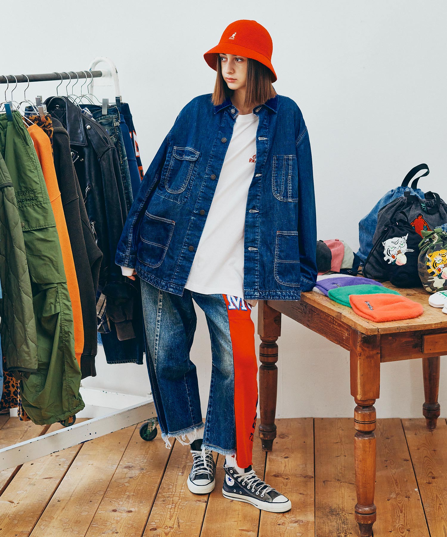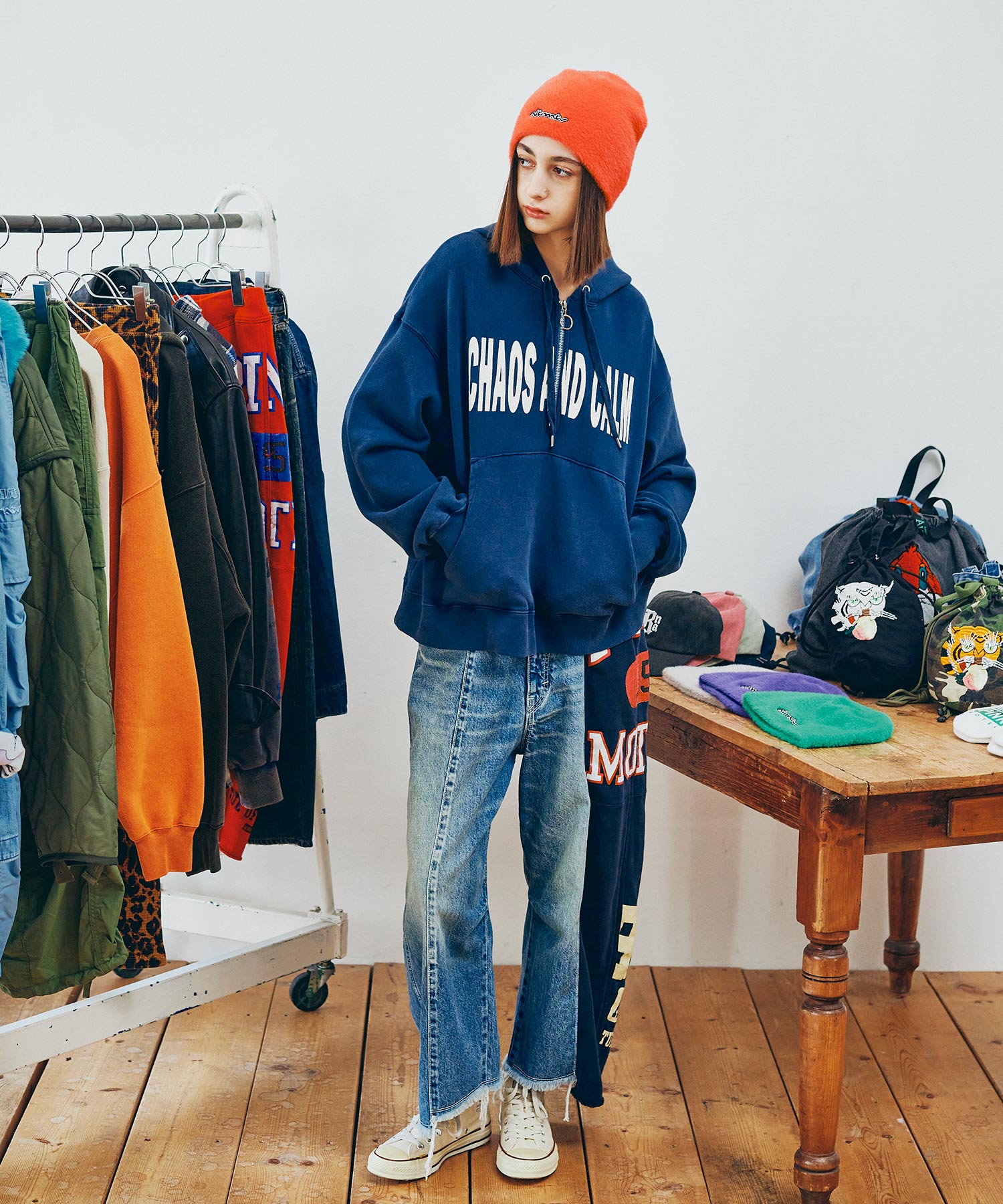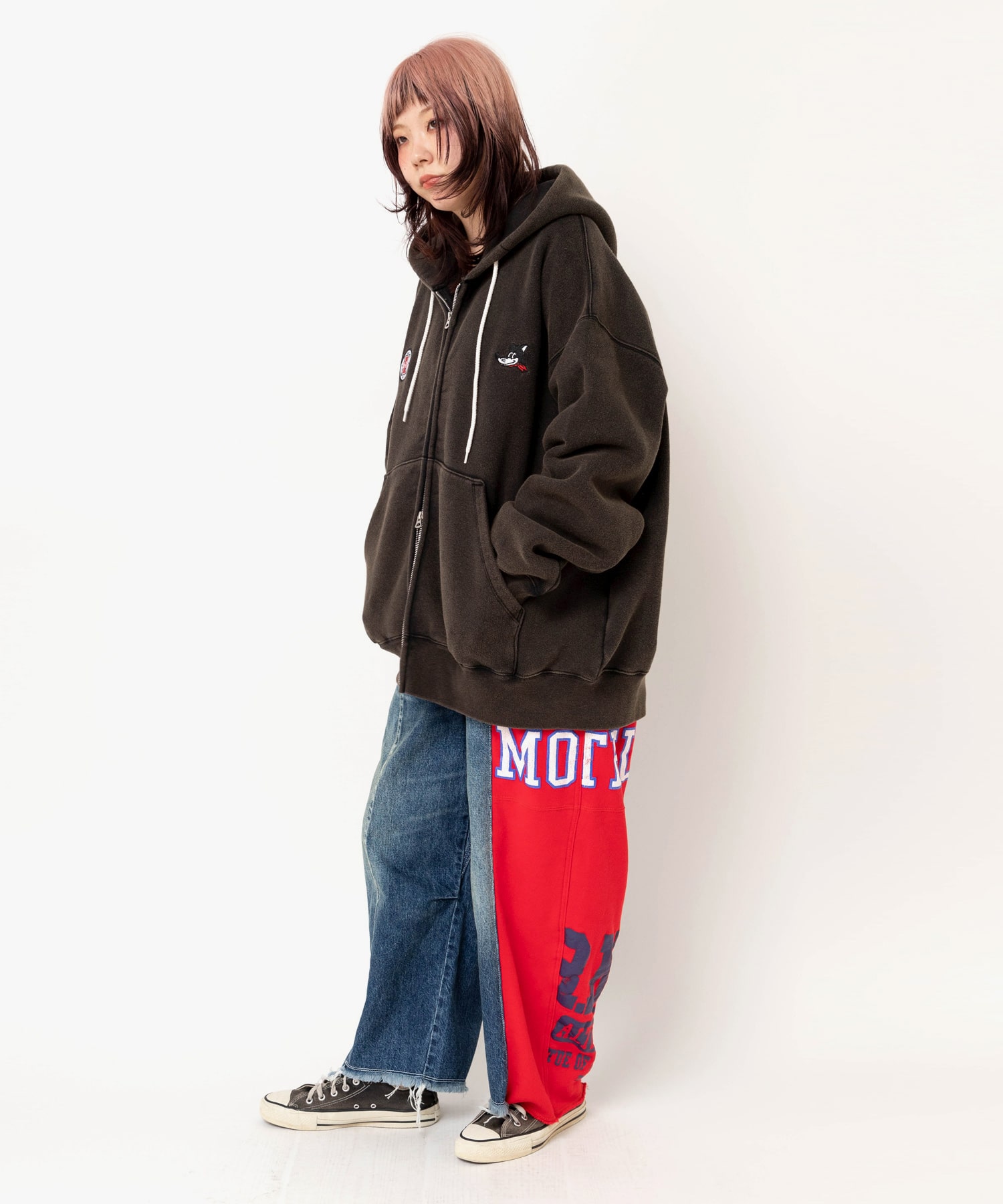 素材にはビンテージ感のあるムラ感が特徴の日本製デニムと、しっかりとした裏毛スウェット生地を使用し、異素材のコントラストが楽しめます。シルエットは、股上が深めのリラックスルーズシルエットを採用しました。特に、ややカーブしたアウトシーム(脇線)が女性らしい曲線を描き、ルーズながらもクールなシルエットを実現します。ジャストなレングスで軽快に着用可能です。製作工程にもこだわり、デニムパーツと裏毛パーツを別々に加工した後、ドッキングするという、手間と時間をかけた特別な工程を経て完成しました。