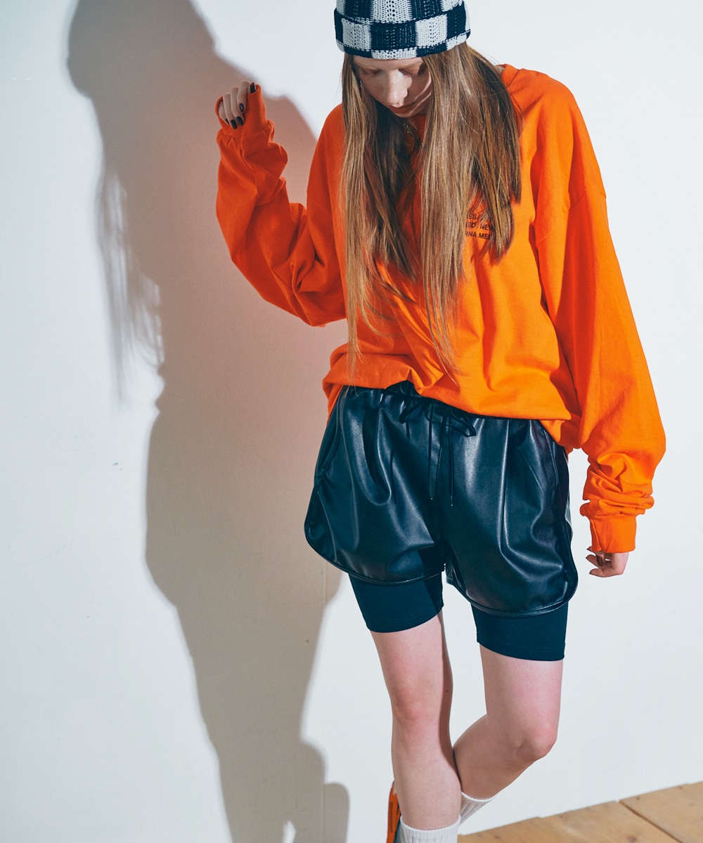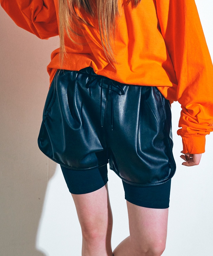 ジョグショーパンのスポーティーなテイストと、フェイクレザーのクールな雰囲気のギャップがポイントです。