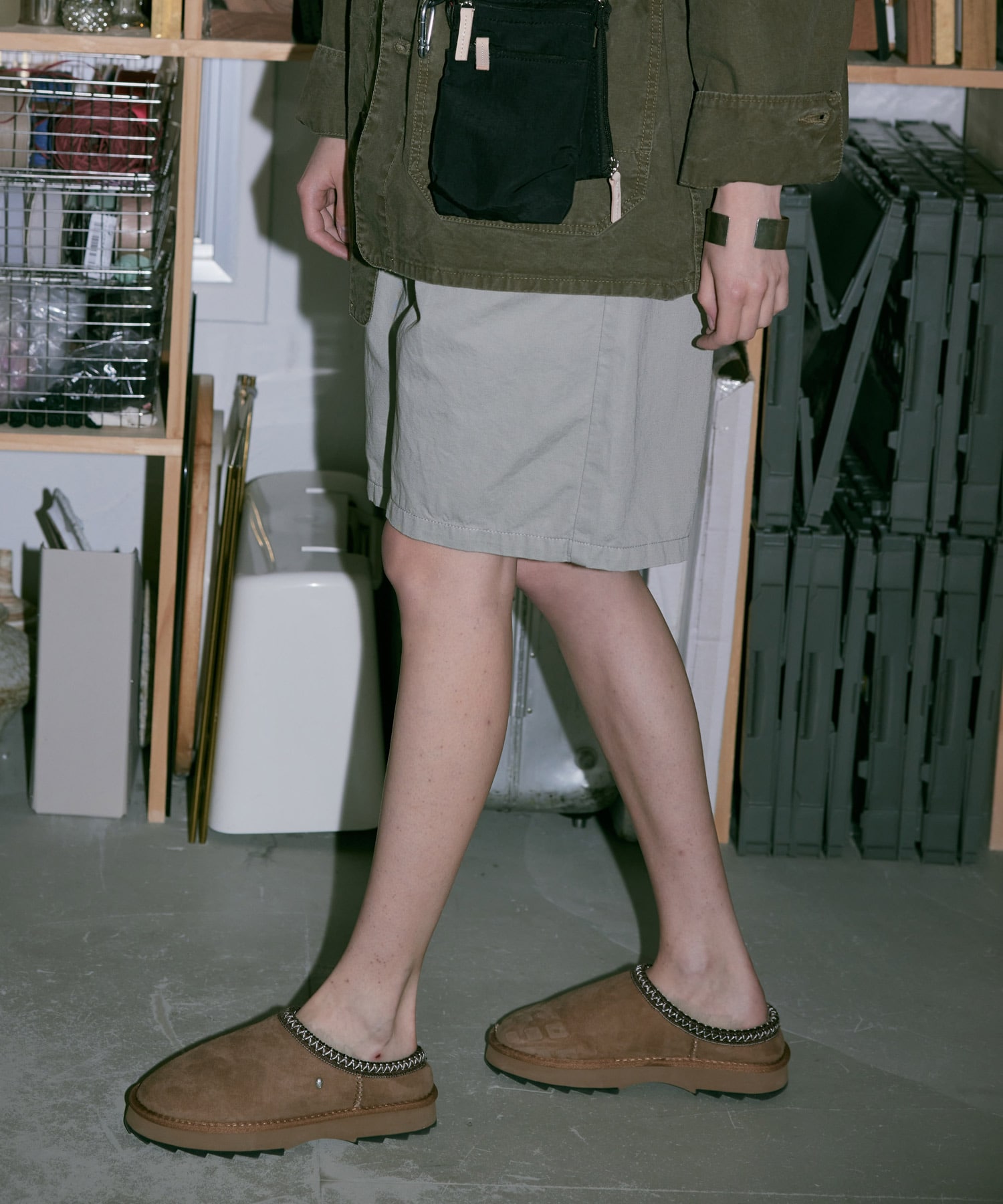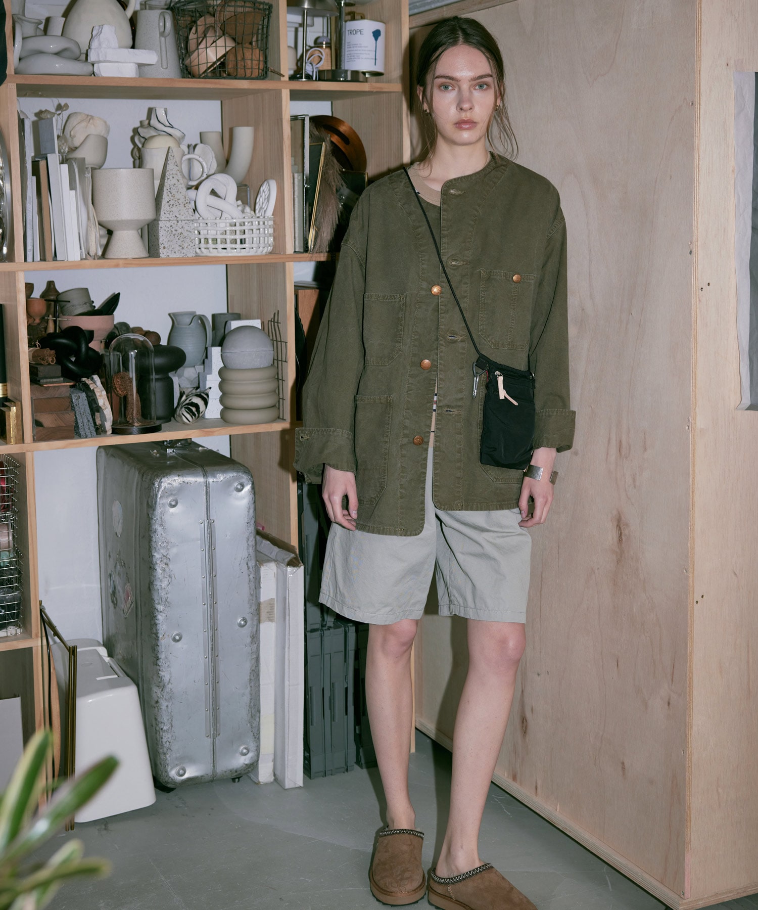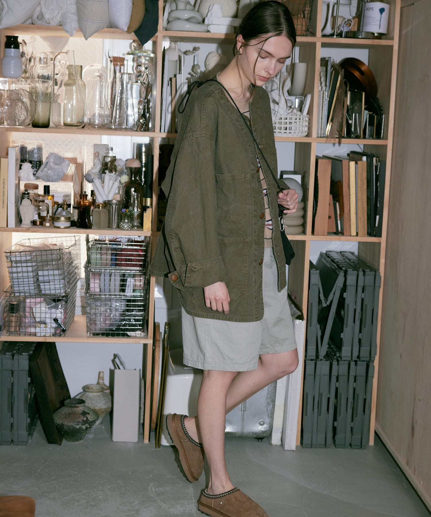 コンパクト目なTシャツやリネンシャツなどと合わせたり、シューズはレザーのがおすすめ。