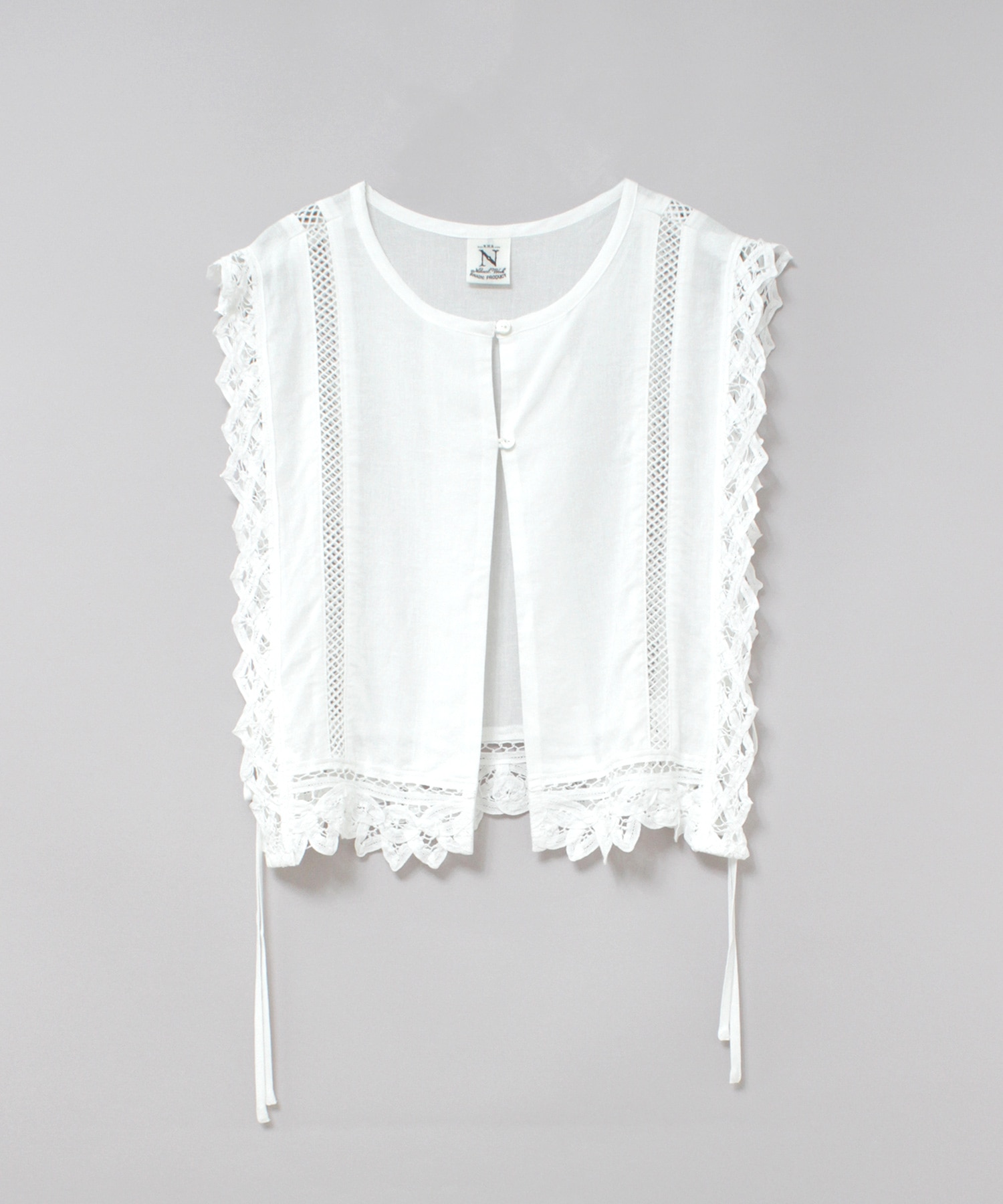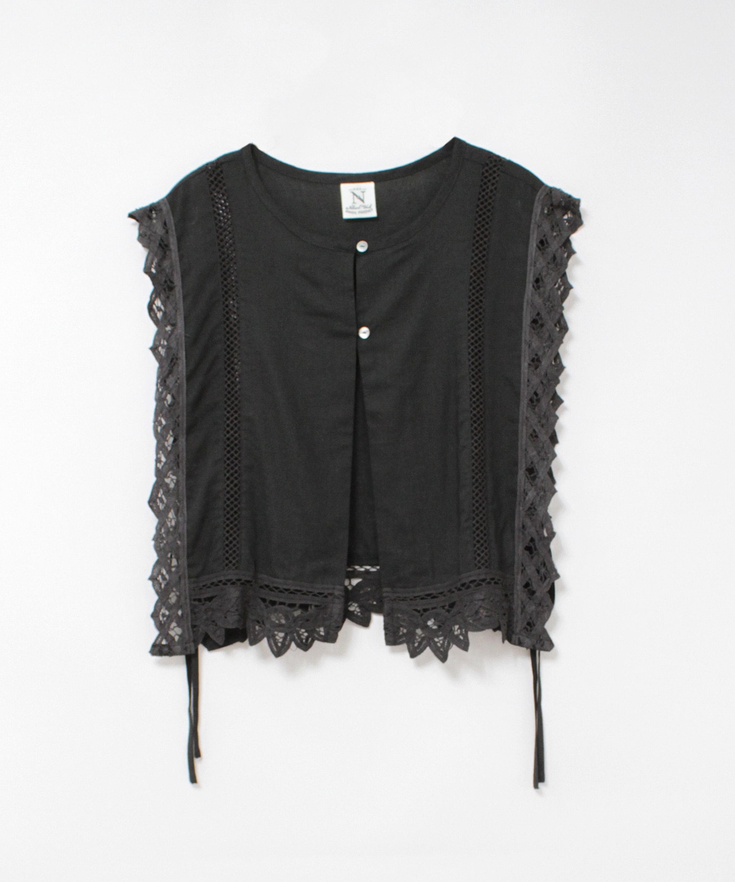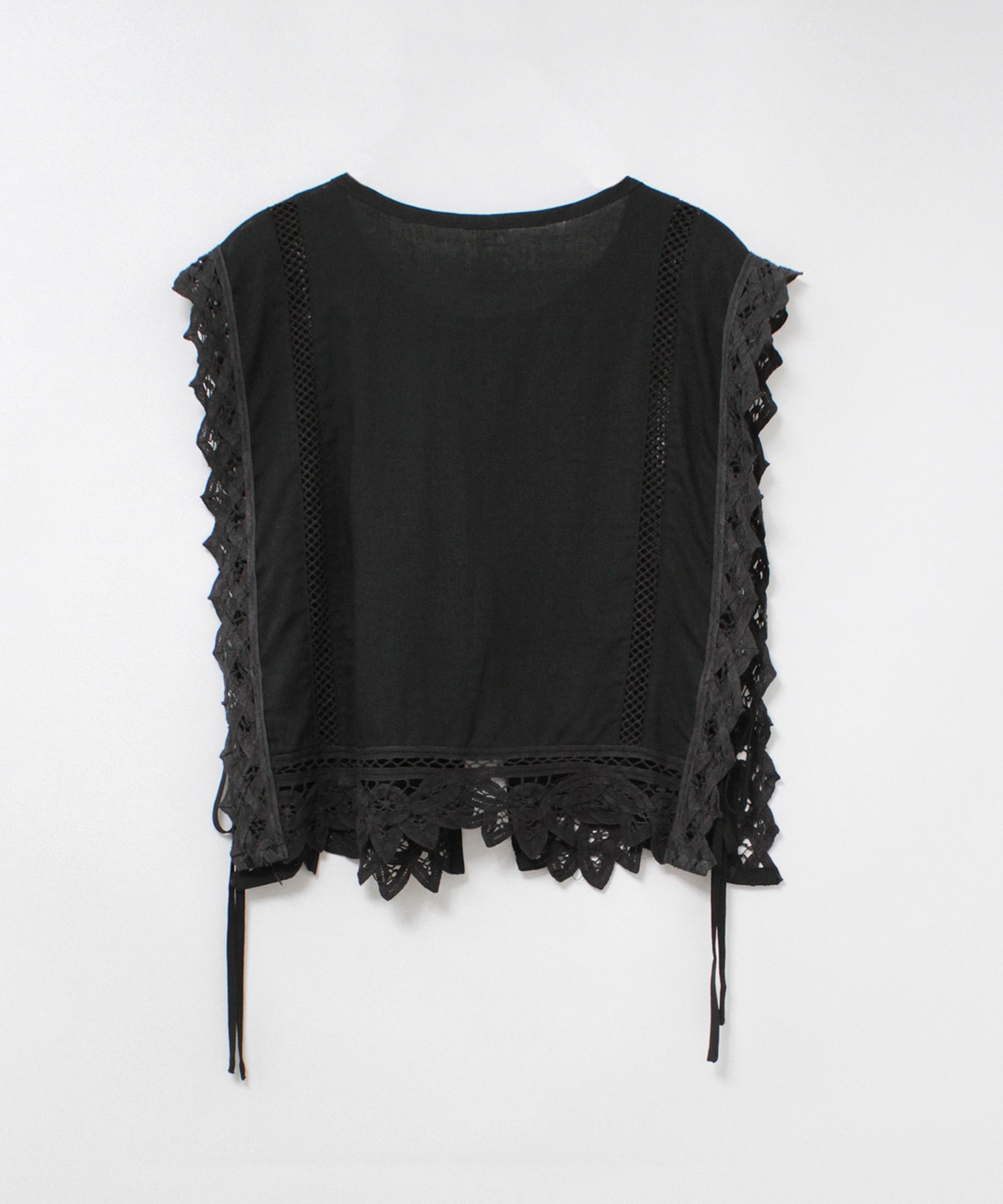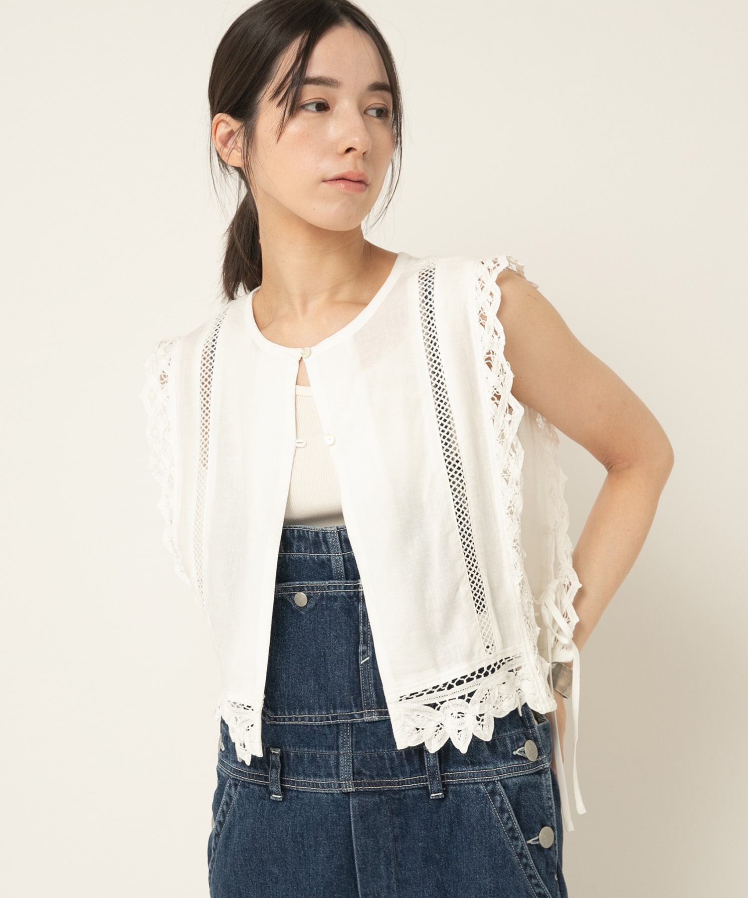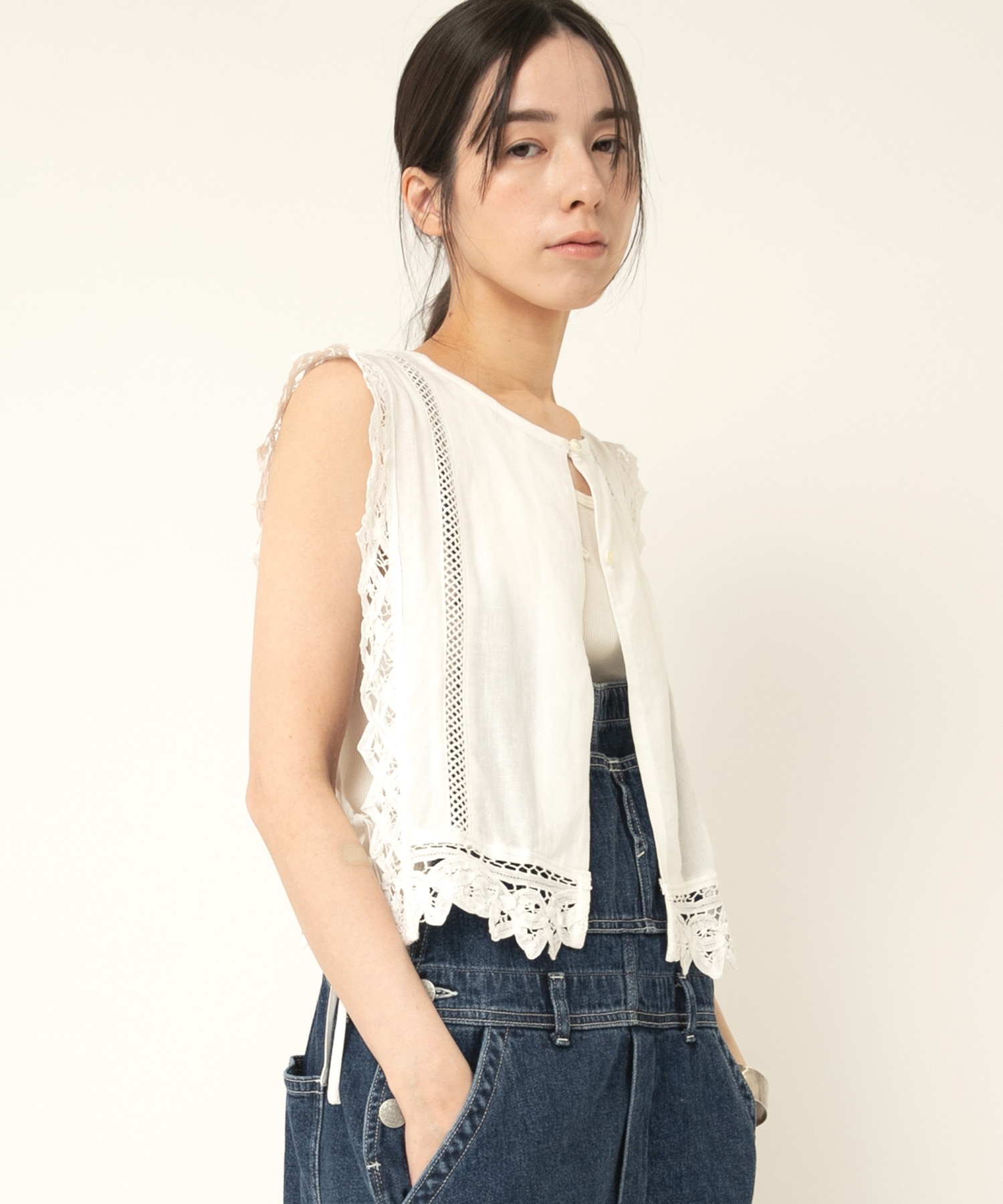 2種類のバテンレースとはしごレースを組み合わせたヴィンテージ感溢れるアイテムです。サイドが全て開いているので、どんなサイズのトップスにも合わせる事ができます。肩から裾まで贅沢にレースを使い、その透け感もナチュラルで雰囲気の出るベストです。