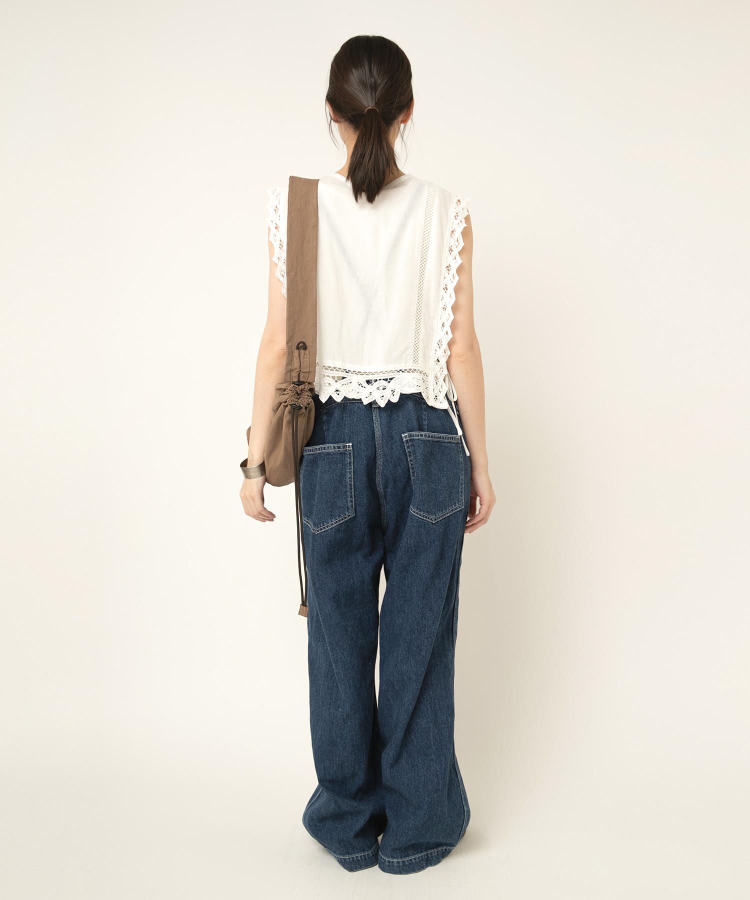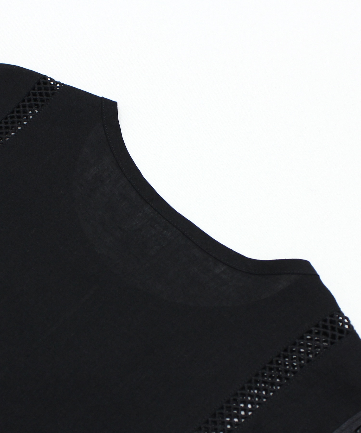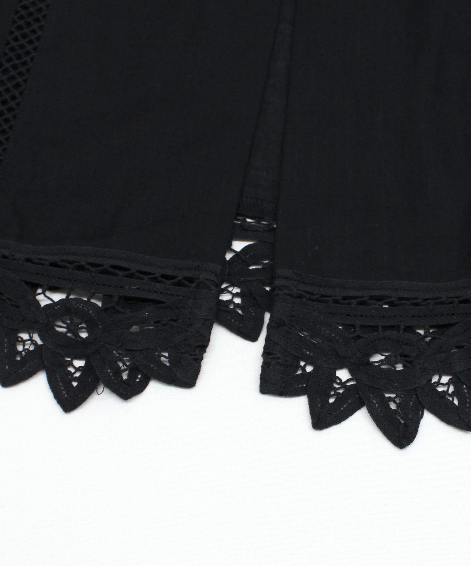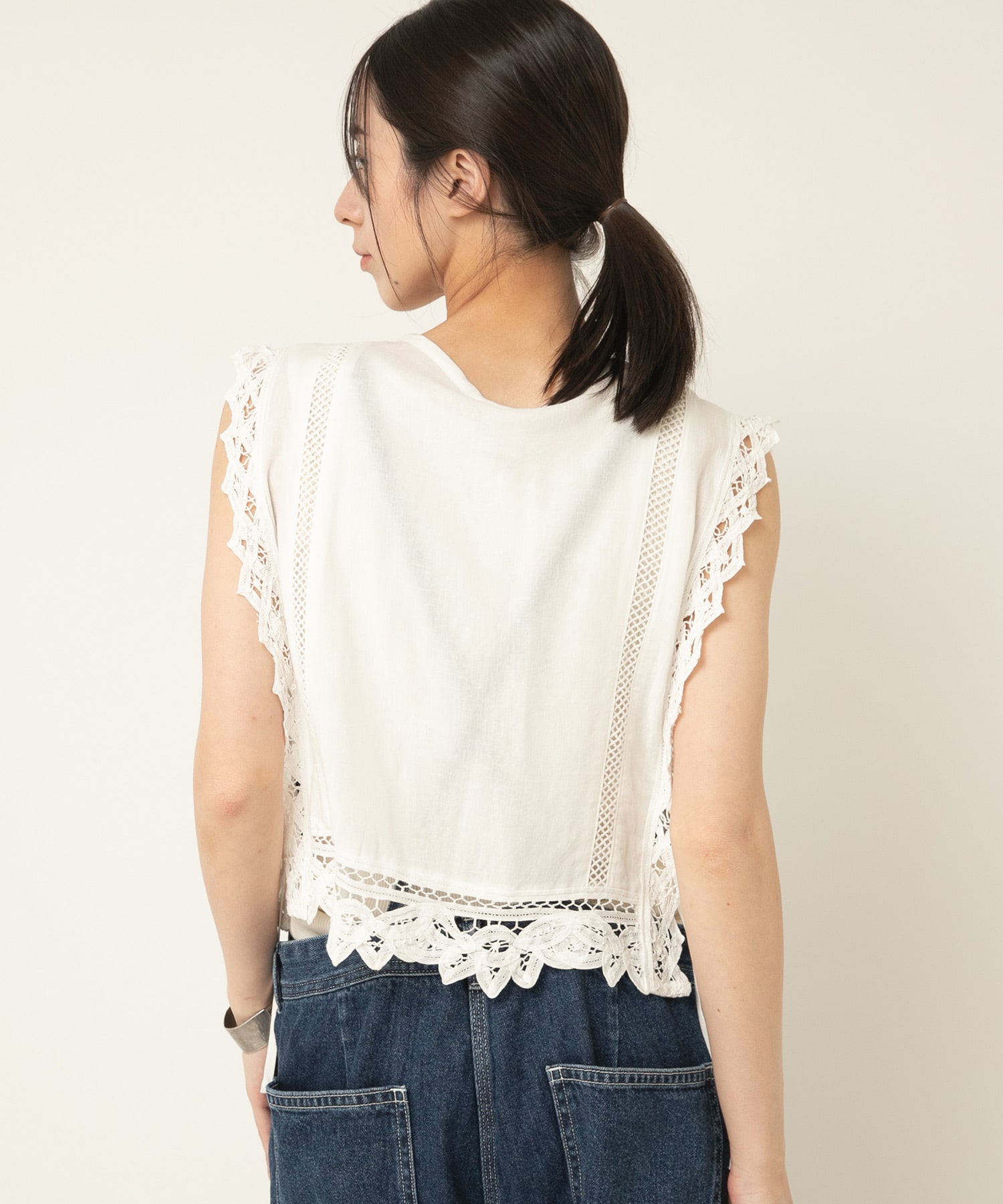 2種類のバテンレースとはしごレースを組み合わせたヴィンテージ感溢れるアイテムです。サイドが全て開いているので、どんなサイズのトップスにも合わせる事ができます。肩から裾まで贅沢にレースを使い、その透け感もナチュラルで雰囲気の出るベストです。