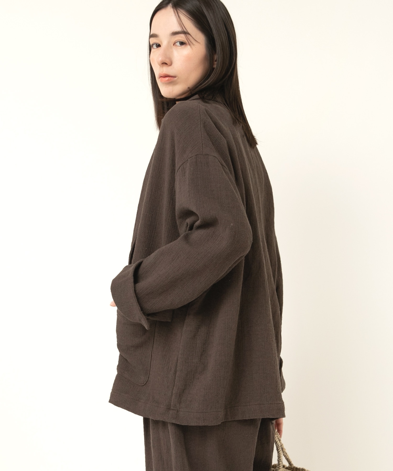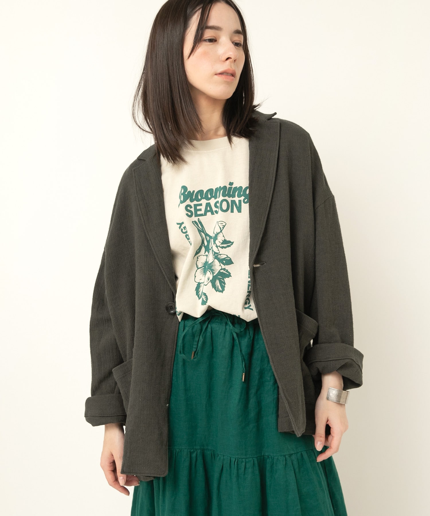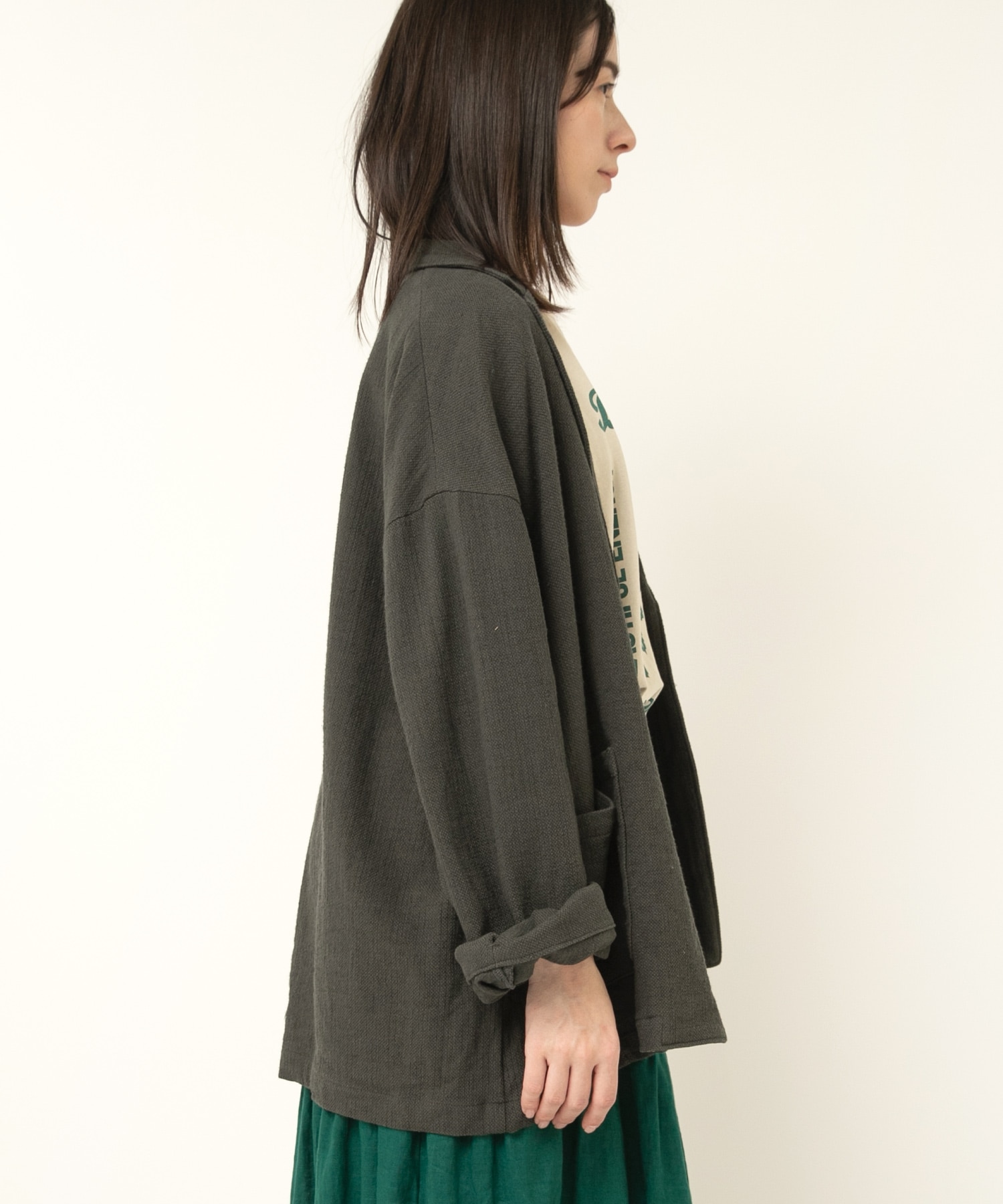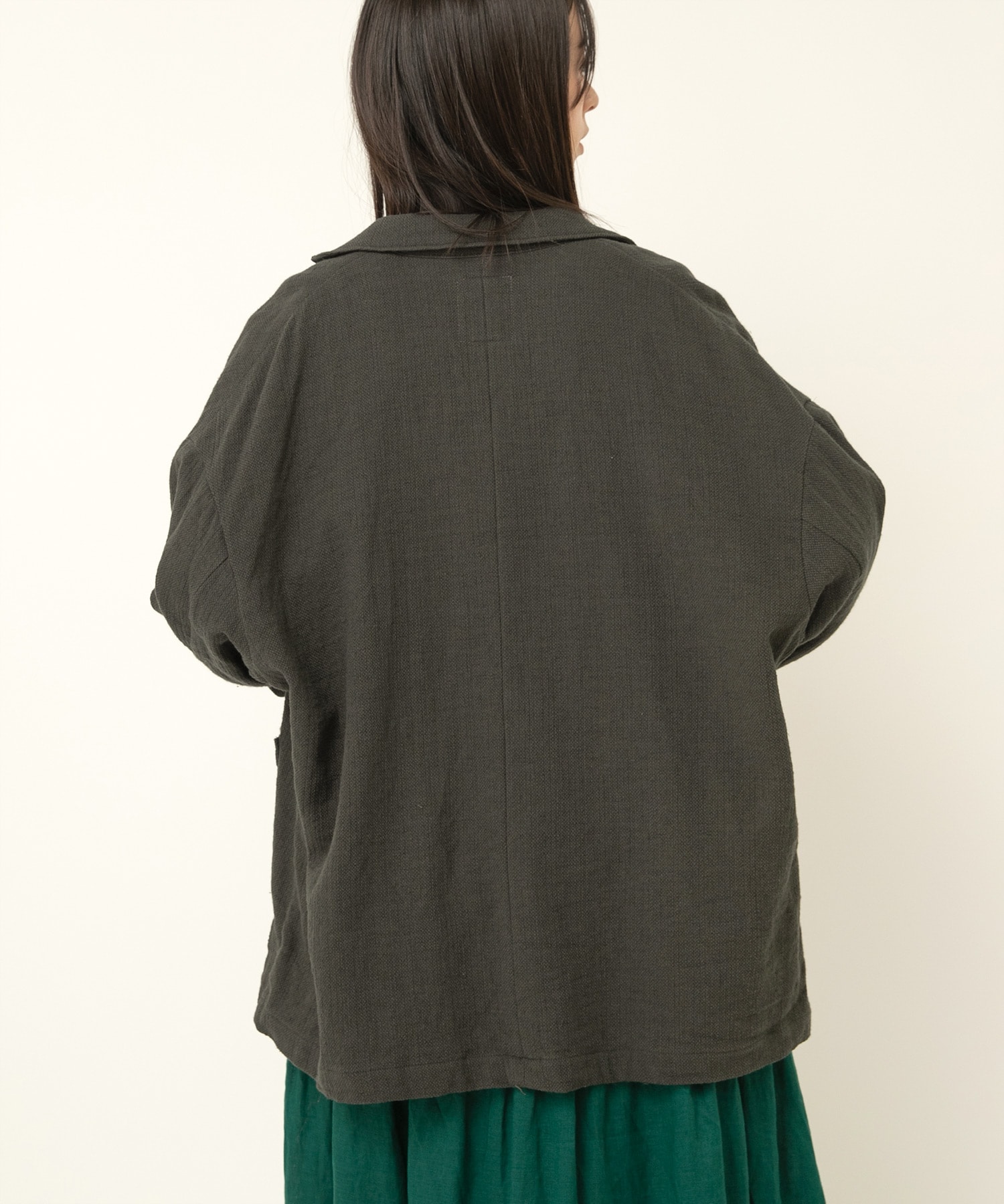 身幅や袖幅は大きく、ゆったりとしていて、ドロップショルダーがさらにカジュアルで、良い意味で決まりすぎないゆるっとかっこいいジャケットに仕上がりました。