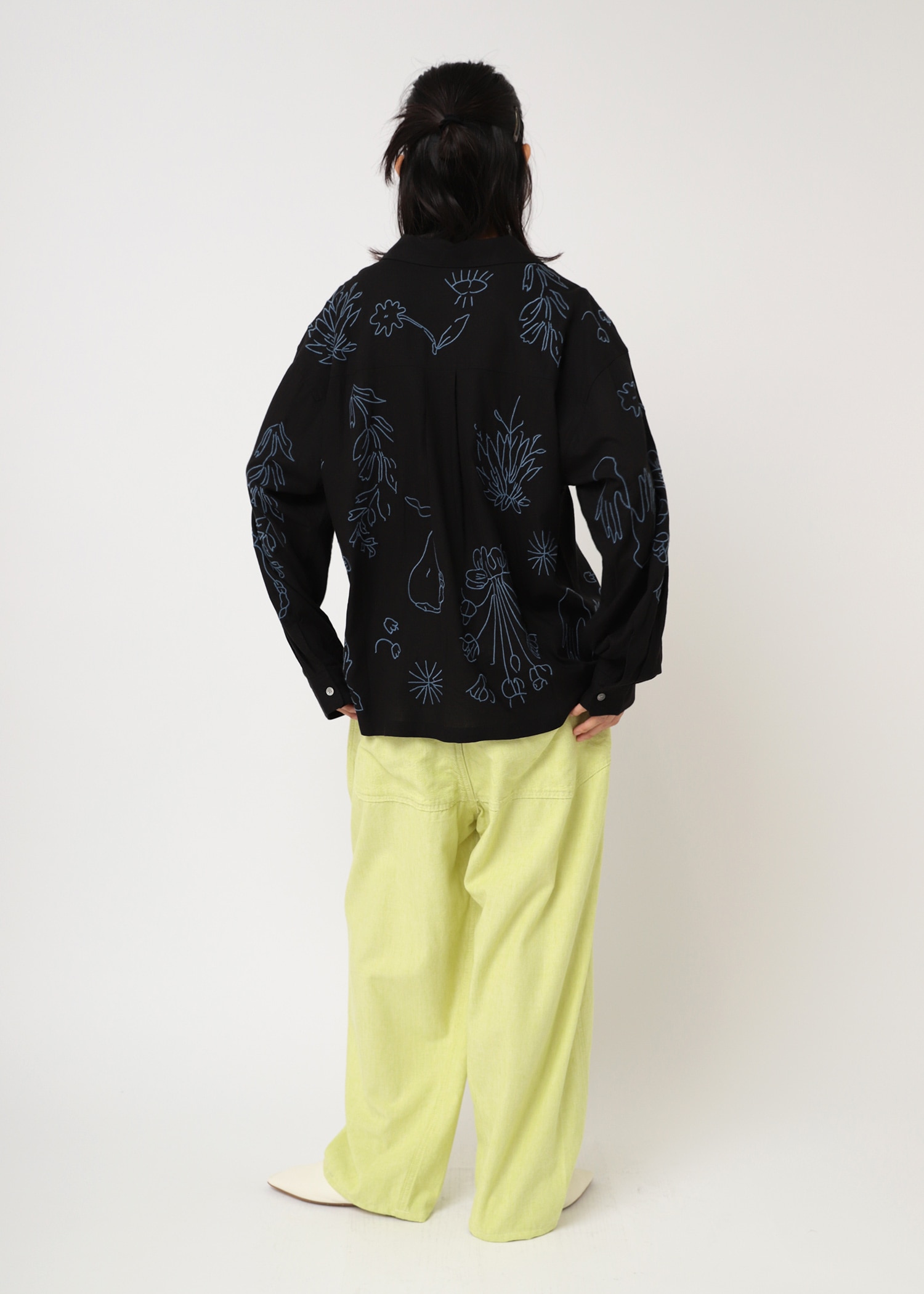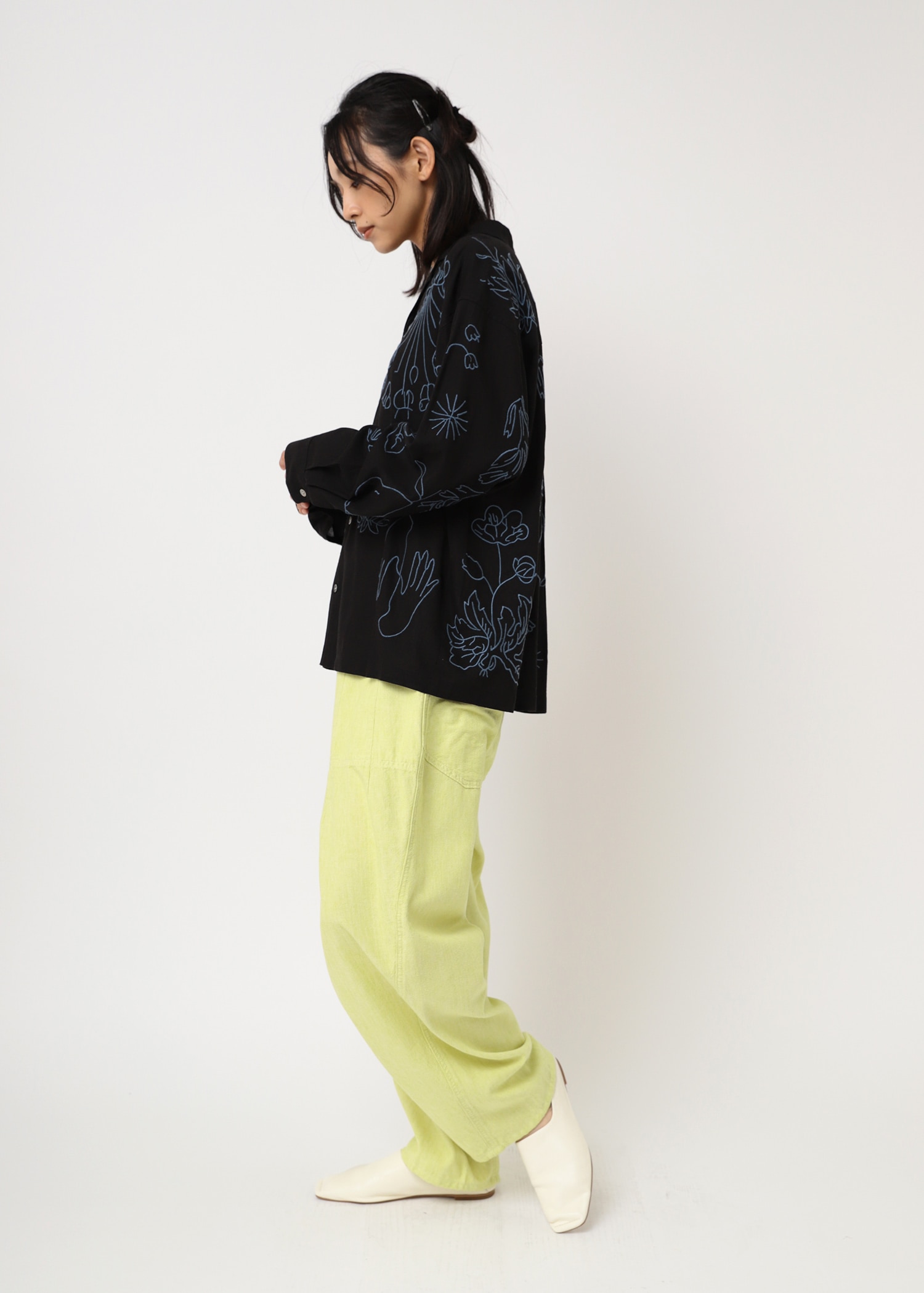 アメリカ製ヴィンテージカバーオールをベースに、現代の気分に合わせてアップデートした一着。 ややワイドな身頃と裾まわりのルーズなサイズ感で、軽快に着こなせます。襟元にはインディゴ染めのコーデュロイをあしらい、アクセントをプラスしました。縫製やステッチワークもヴィンテージ仕様を忠実に再現しています。 最大のこだわりは内側のライニング。保温性のある軽い起毛素材にオリジナルMAP柄をプリントし、見えない部分にもPINK MOTELの世界観を凝縮。袖を折り返して裏地を見せる、クールな着こなしも楽しめます。