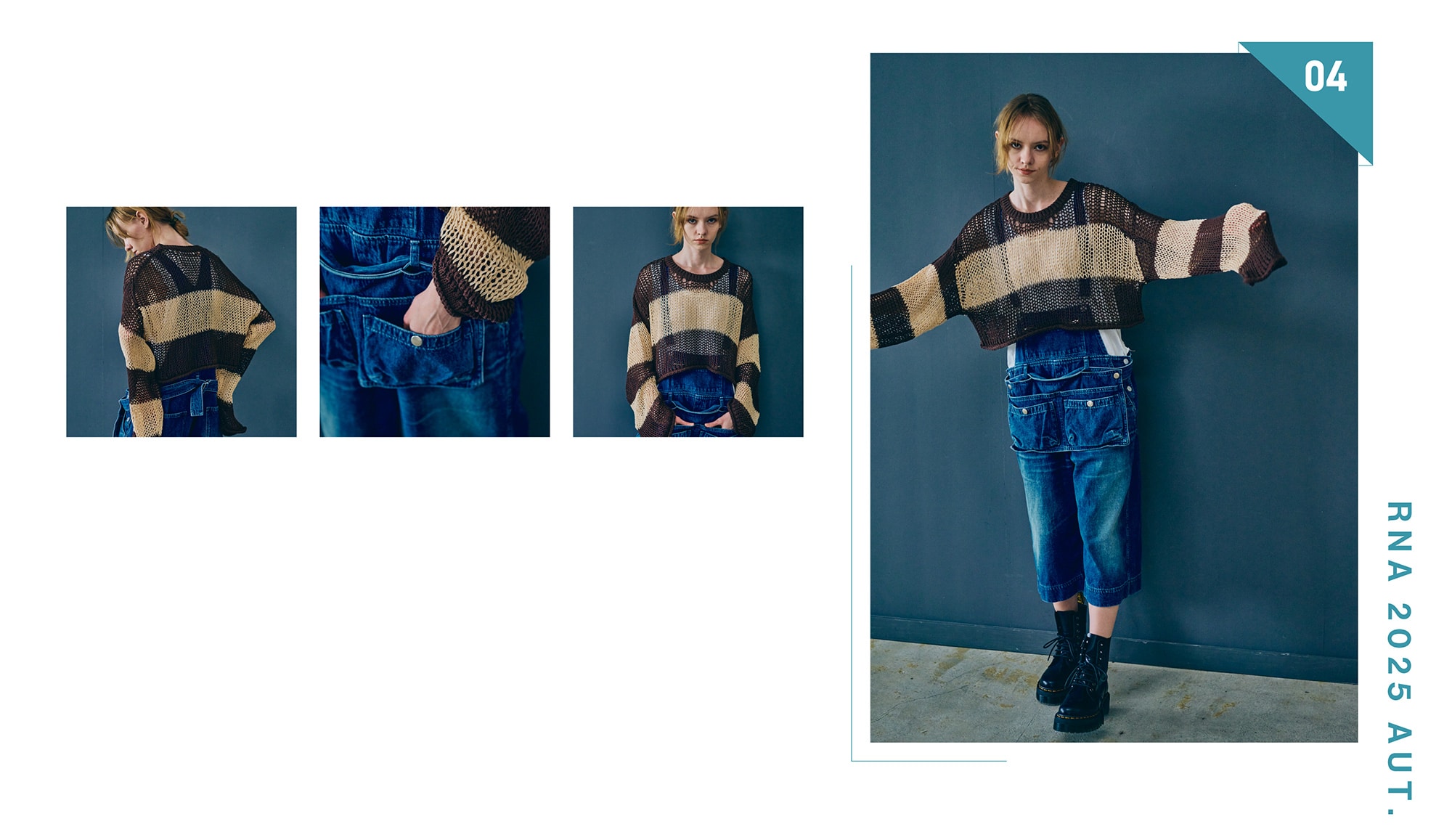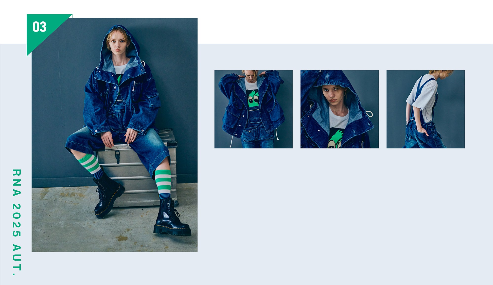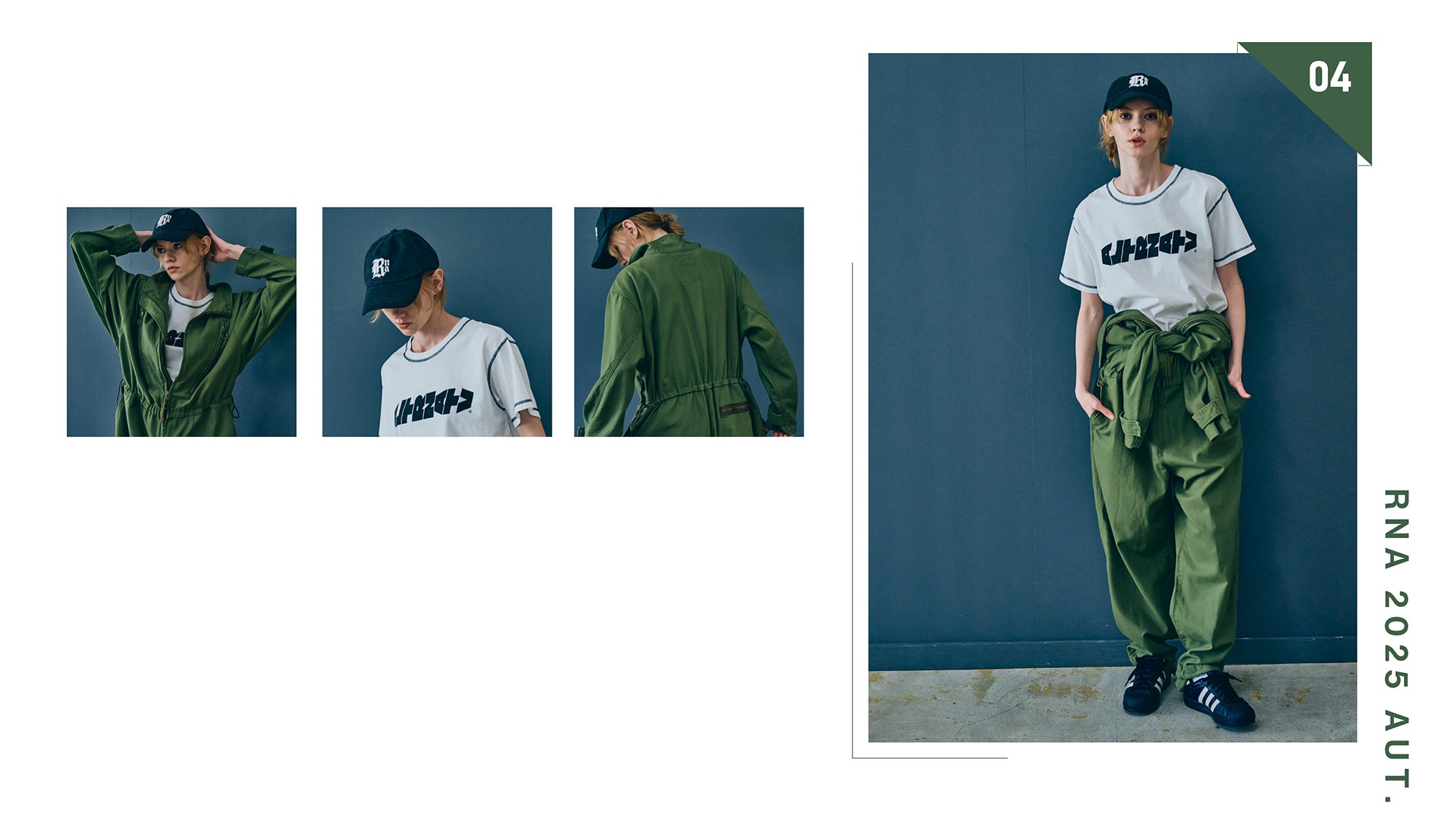 エプロン風デザインのカットレングスオーバーオールなど、RNAらしいこだわりが詰まっています。