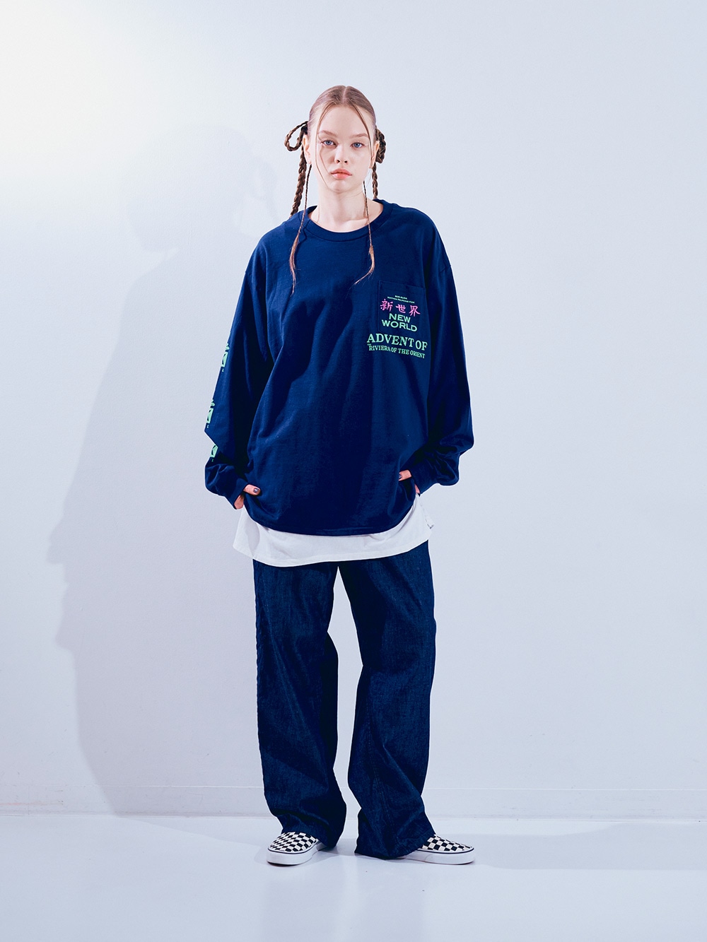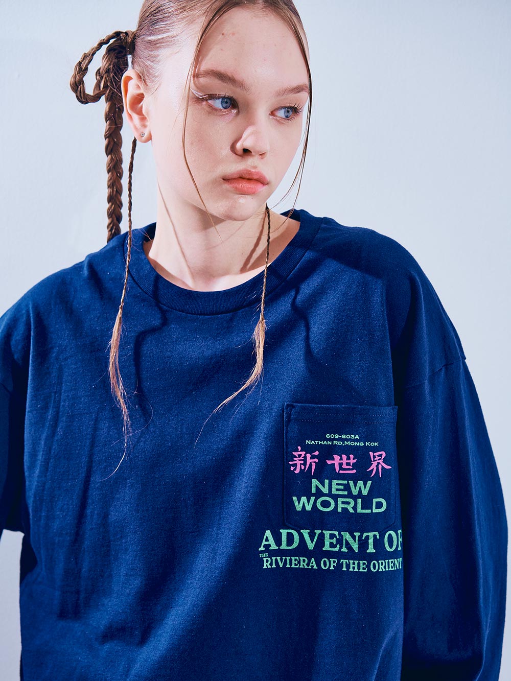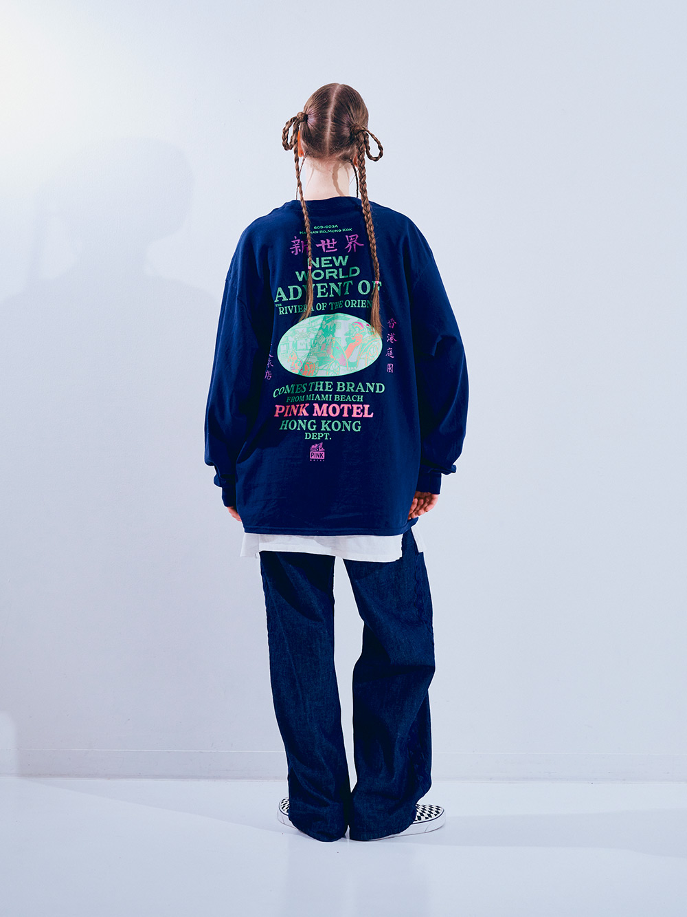 アジアとヨーロッパが交差する街・香港の独特な空気感を表現したロングTシャツ。 胸ポケット上に施されたロゴプリントがさりげないアクセントになり、カルチャーミックスを象徴するビジュアルデザインが全面に映える仕上がりです。 ゆったりとしたオーバーサイズシルエットで、個性を楽しみながらラフに着こなせる一枚です。