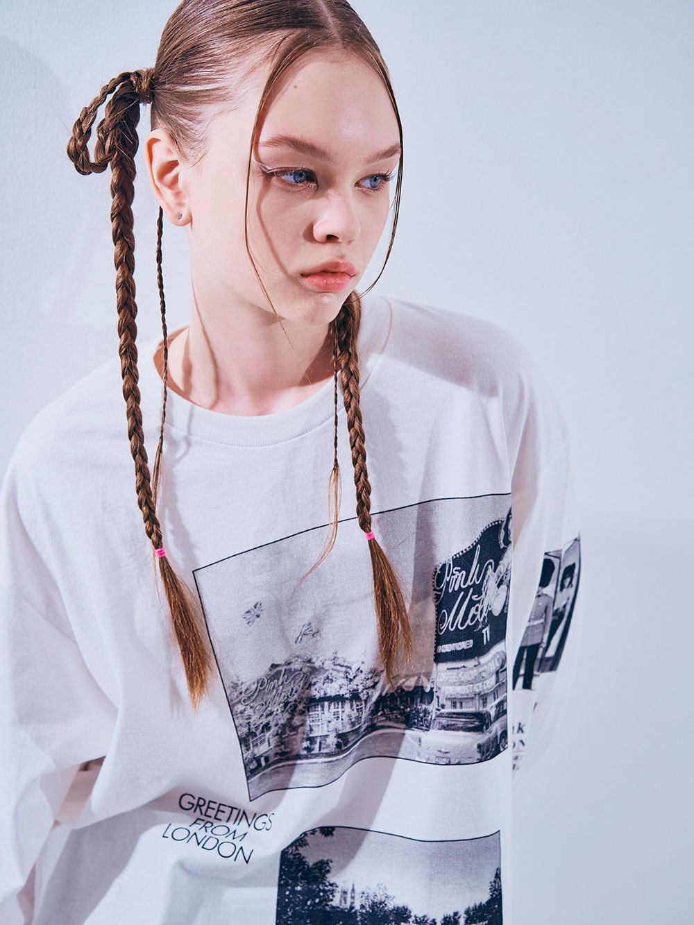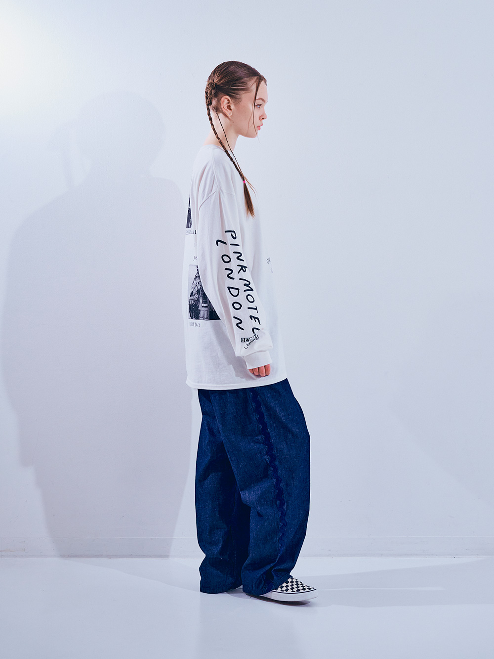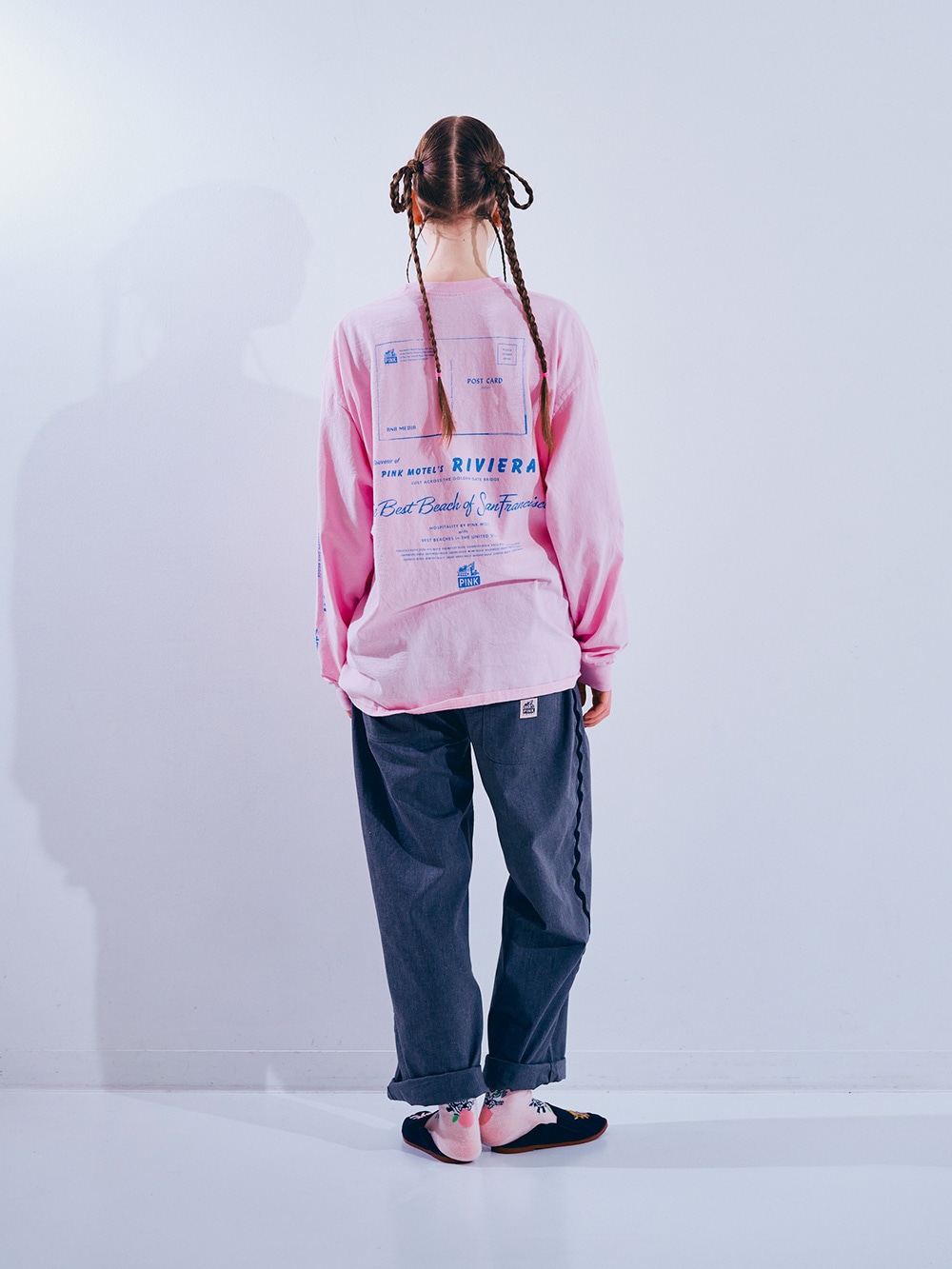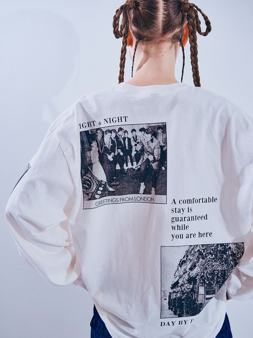 ロンドンの街で過ごした記憶や風景をグリーティングカードに閉じ込め、身頃全体に散りばめたスペシャルなロンTEE。 着るたびに、あの街角の光景や旅の空気感が鮮やかによみがえるような一枚です。 ゆったりとしたオーバーサイズシルエットは、ラフに羽織るだけでスタイルが完成。PINK MOTELならではの世界観とロンドンの記憶を重ねて楽しめる特別なアイテムです。