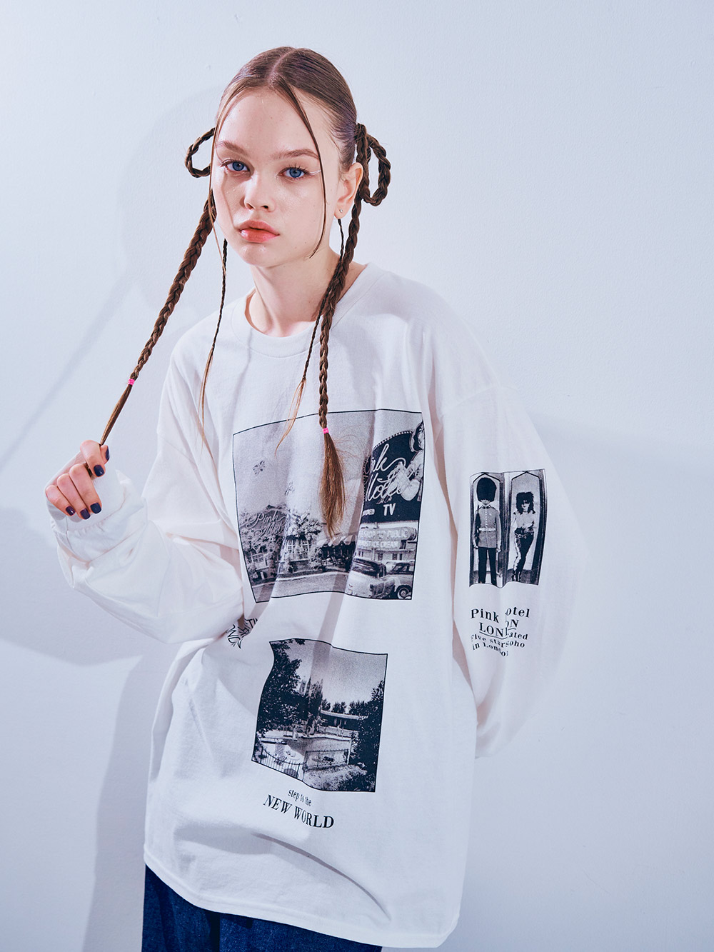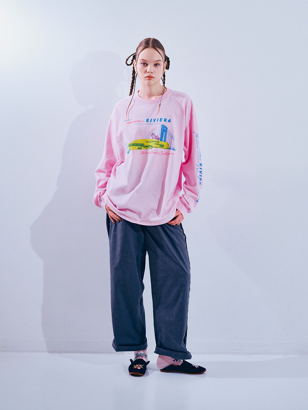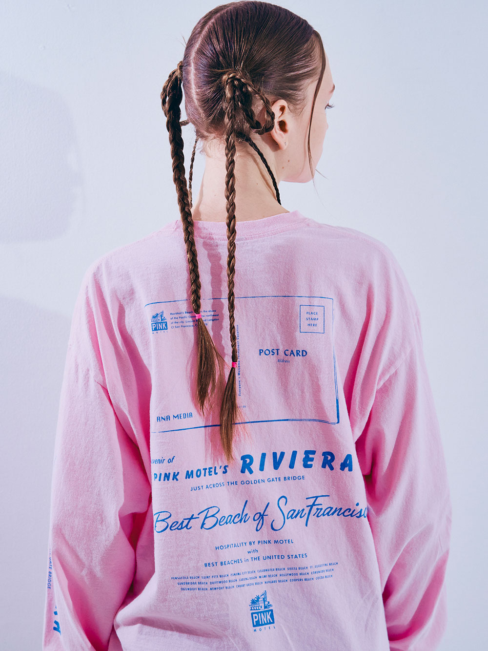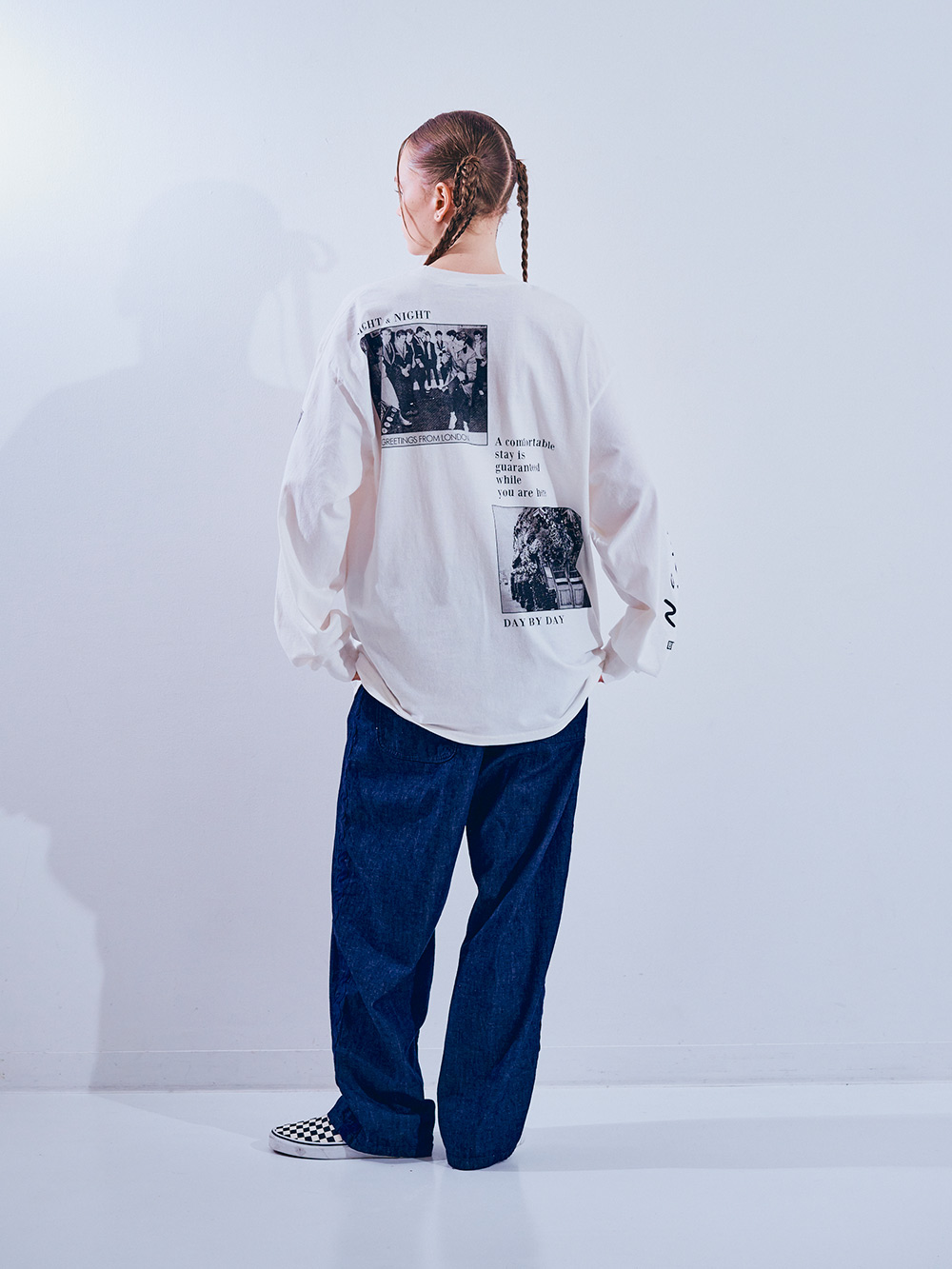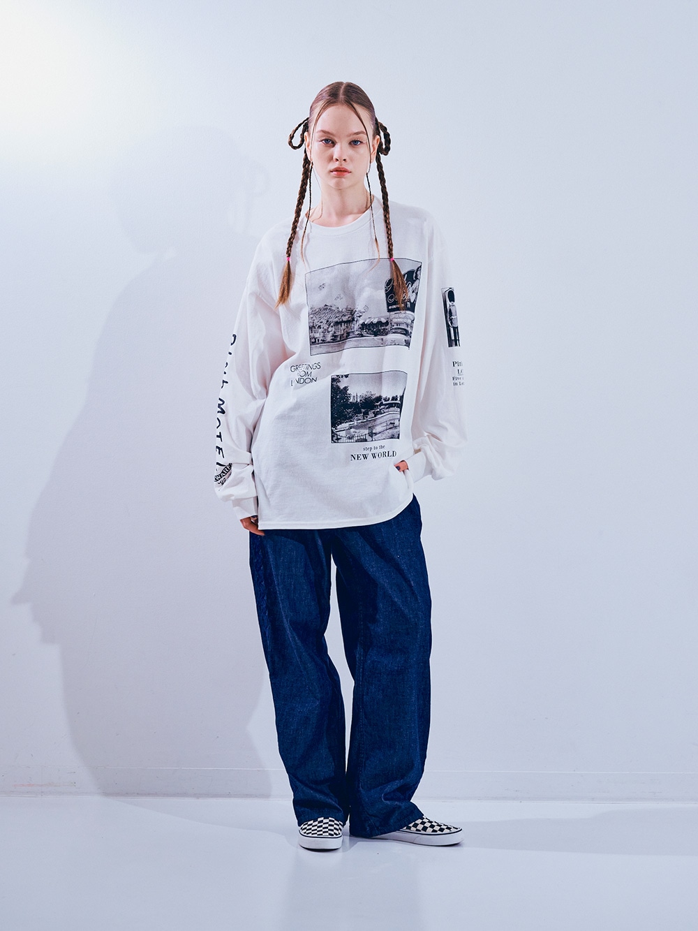 ロンドンの街で過ごした記憶や風景をグリーティングカードに閉じ込め、身頃全体に散りばめたスペシャルなロンTEE。 着るたびに、あの街角の光景や旅の空気感が鮮やかによみがえるような一枚です。 ゆったりとしたオーバーサイズシルエットは、ラフに羽織るだけでスタイルが完成。PINK MOTELならではの世界観とロンドンの記憶を重ねて楽しめる特別なアイテムです。