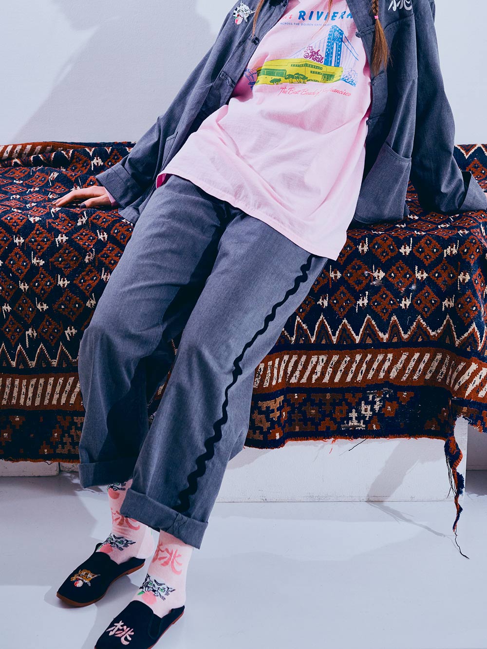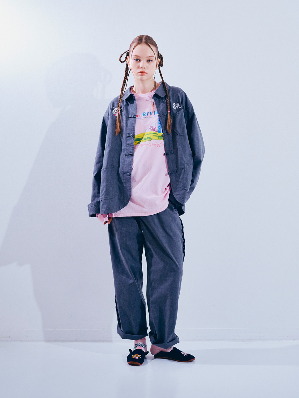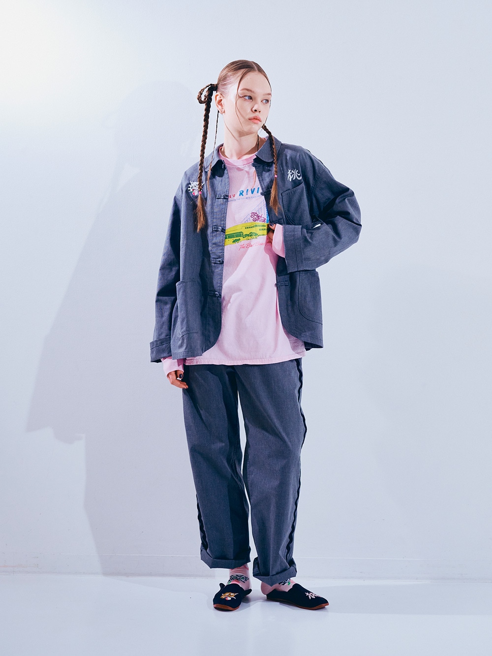フランスのチャイナタウンで販売されていたビンテージのチャイナスーツから着想を得た、PINK MOTELならではのセットアップ。 ジャケットには「桃」と「虎」を組み合わせた刺繍を施し、襟やポケットの柔らかなラインで独特の表情をプラス。 パンツはゆったりとしたビッグテーパードで、波型テープが個性的なアクセントに。 シーンや気分に合わせて選べる、特別なセットアップです。
