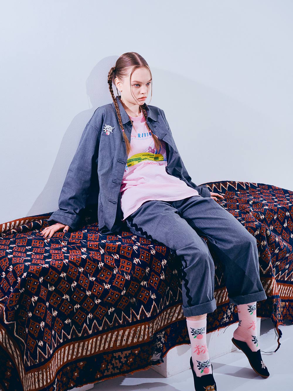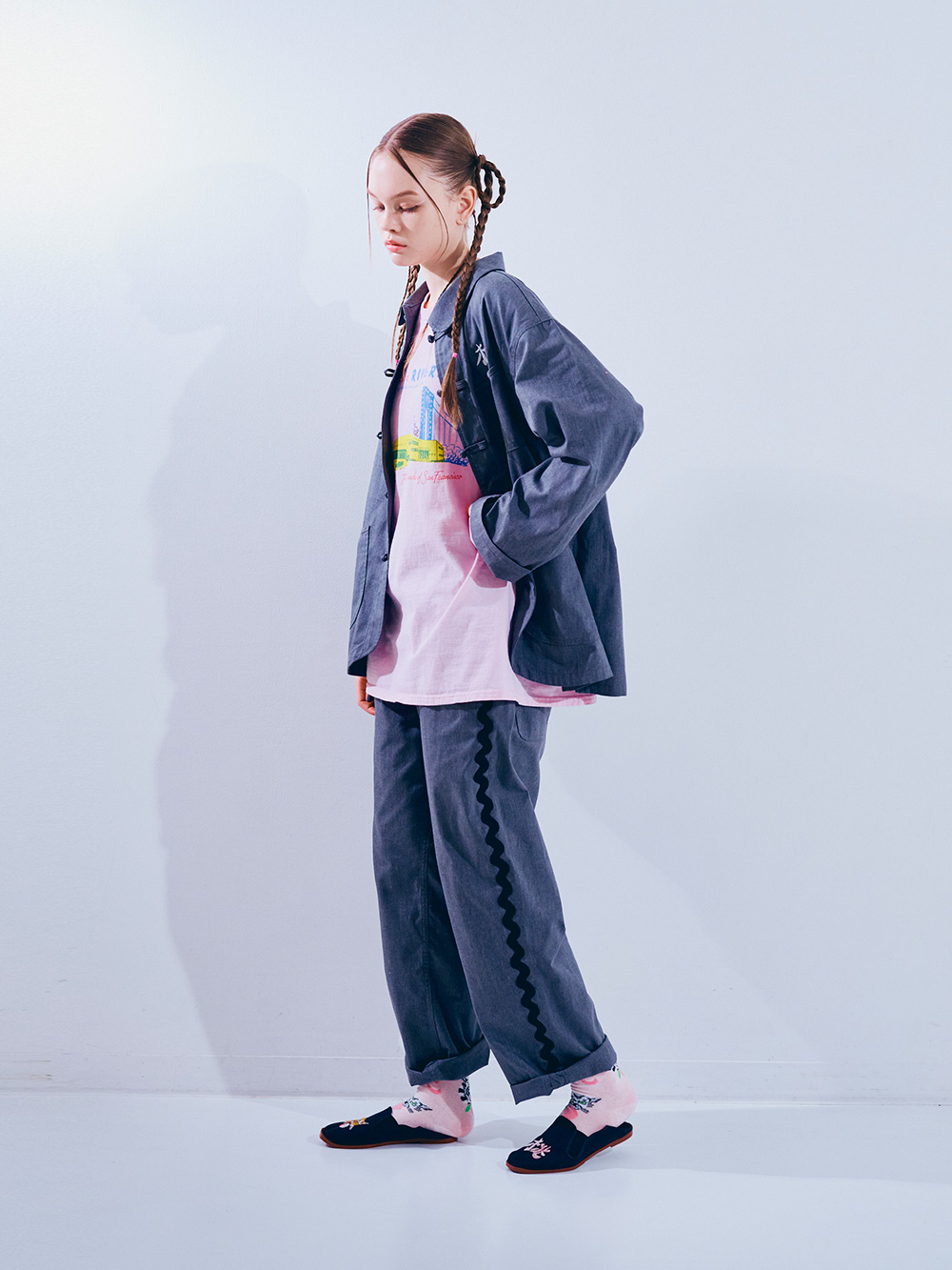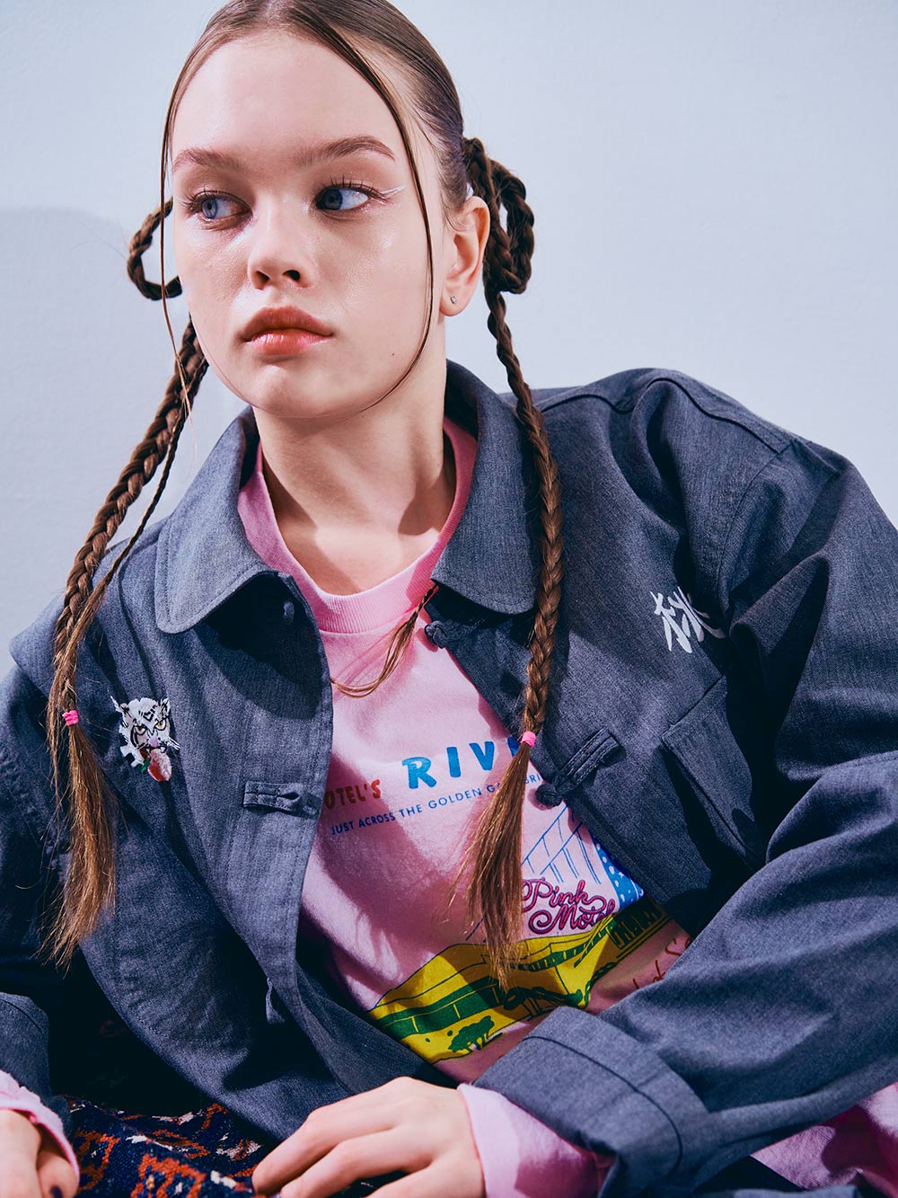 フランスのチャイナタウンで販売されていたビンテージのチャイナスーツから着想を得た、PINK MOTELならではのセットアップ。 ジャケットには「桃」と「虎」を組み合わせた刺繍を施し、襟やポケットの柔らかなラインで独特の表情をプラス。 パンツはゆったりとしたビッグテーパードで、波型テープが個性的なアクセントに。 シーンや気分に合わせて選べる、特別なセットアップです。