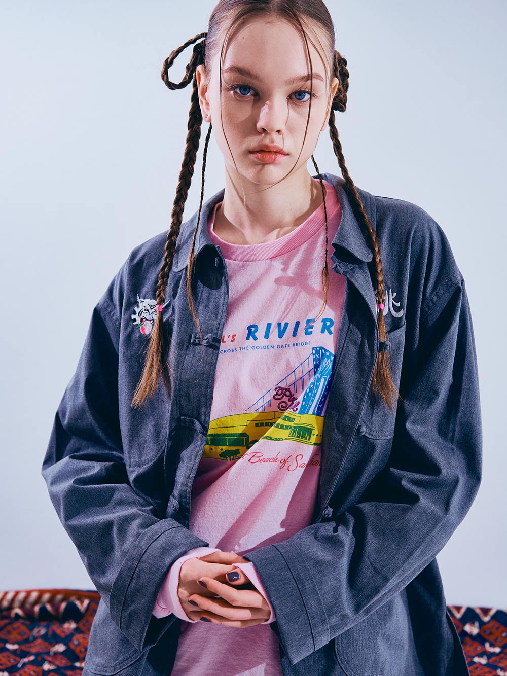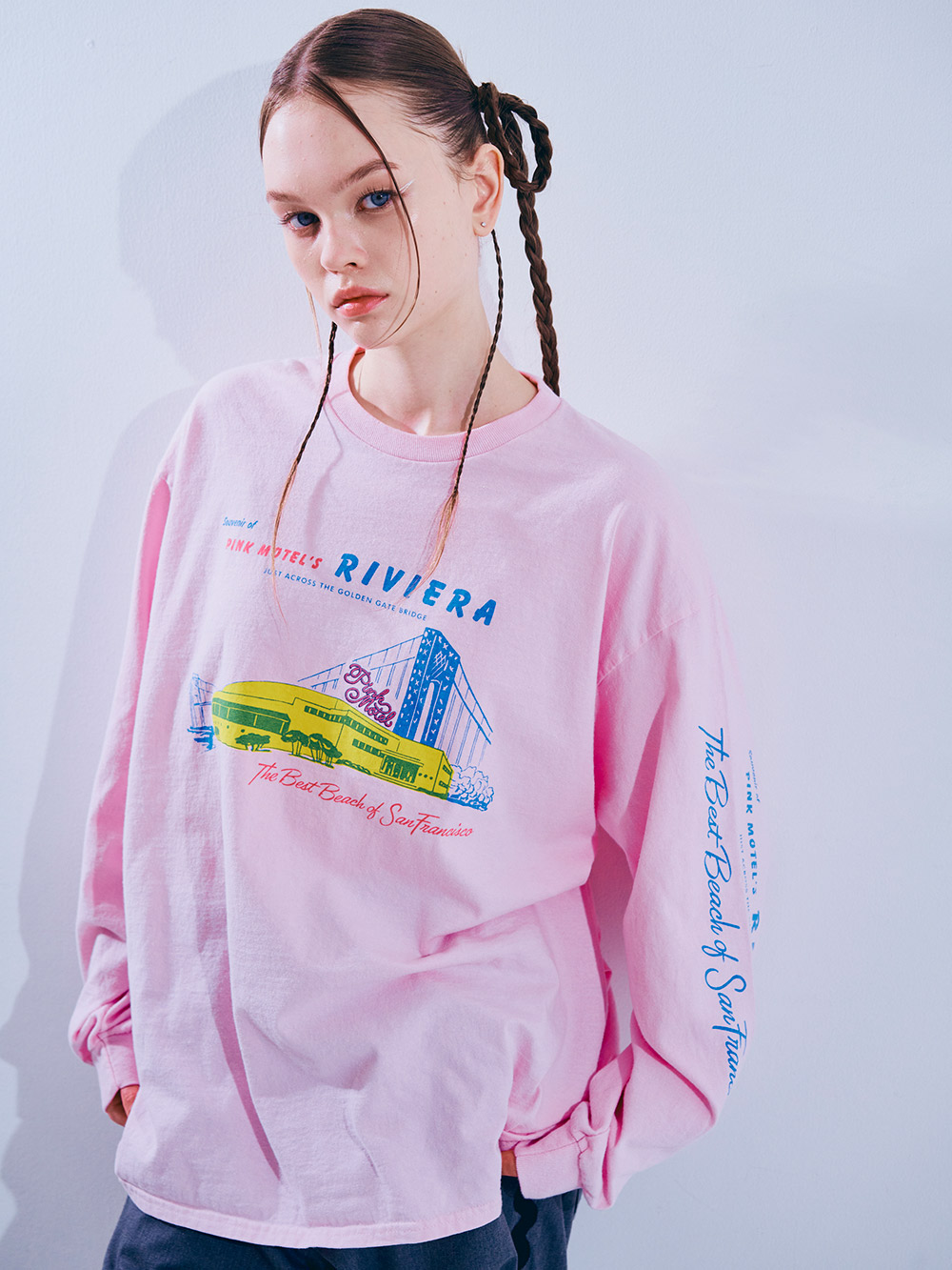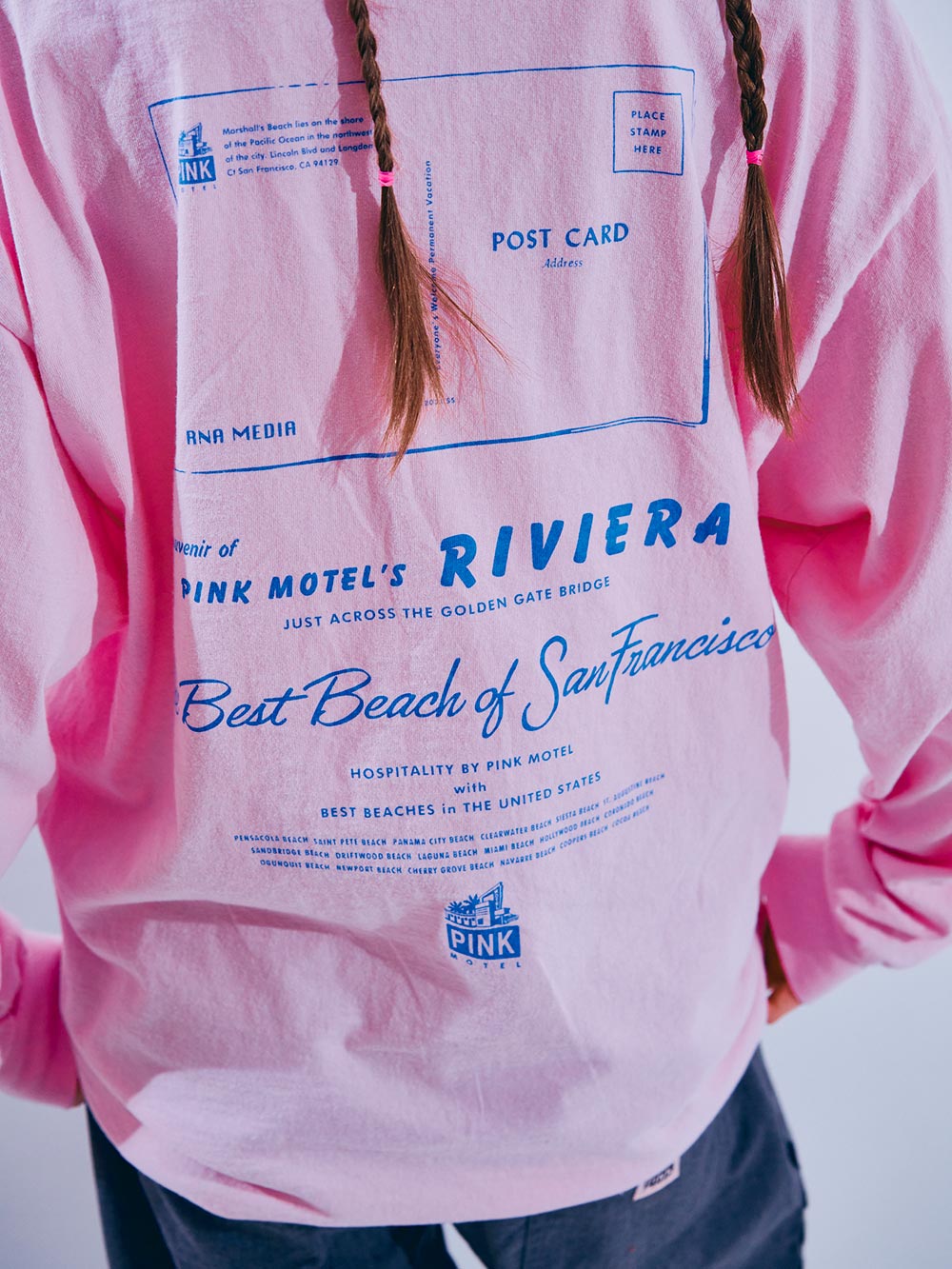 サンフランシスコの北西にあるベイカービーチを舞台にした“PINK MOTEL”スーベニアTシャツ。 ゴールデンゲートブリッジを望む絶景は、日没時に夕陽と橋が織りなすコントラストでさらに美しく輝きます。 そんな旅の記憶を、バックスタイルいっぱいに広がるグリーティングカード風デザインで表現。特別な思い出を纏うように楽しめる一枚です。