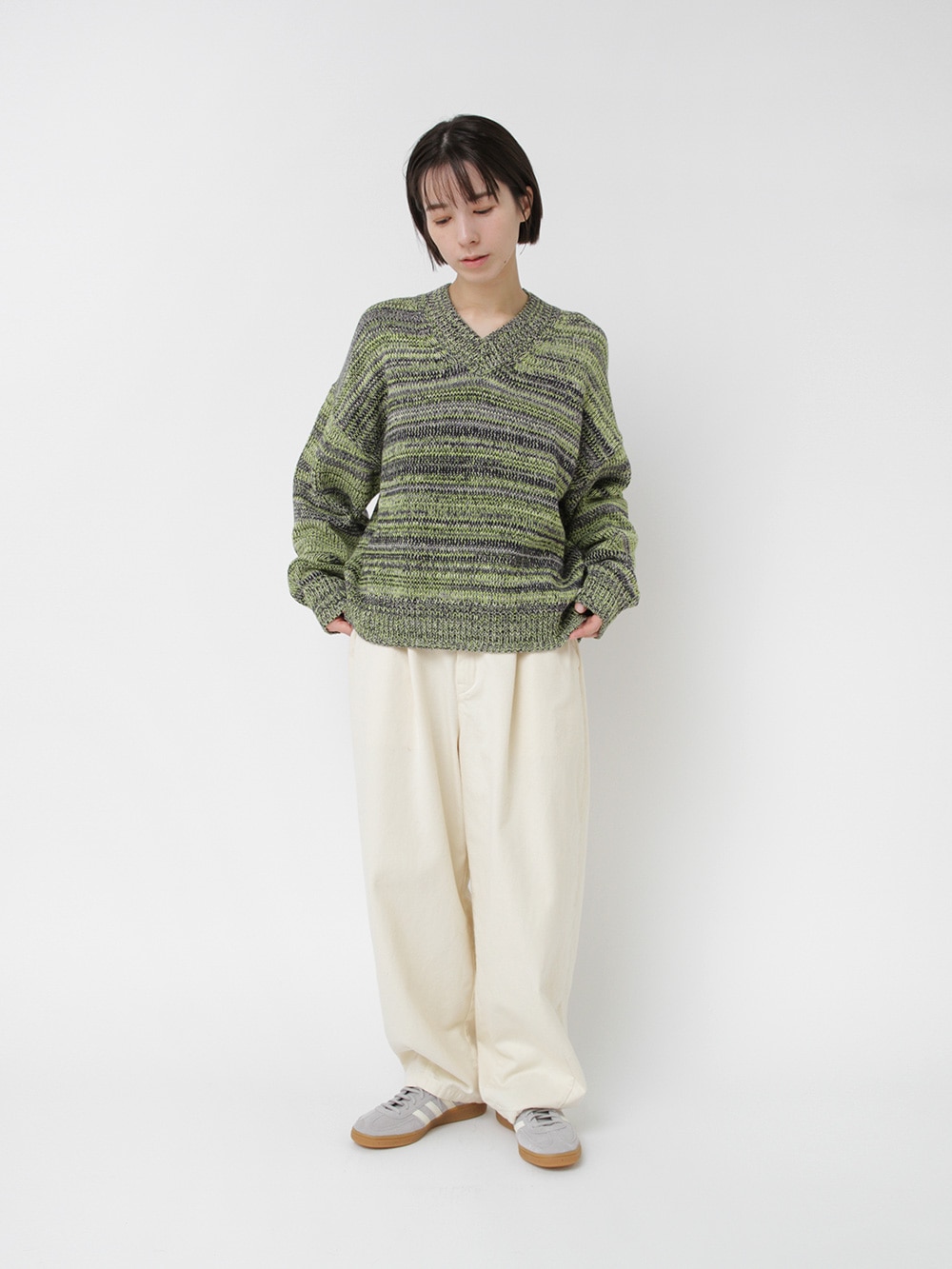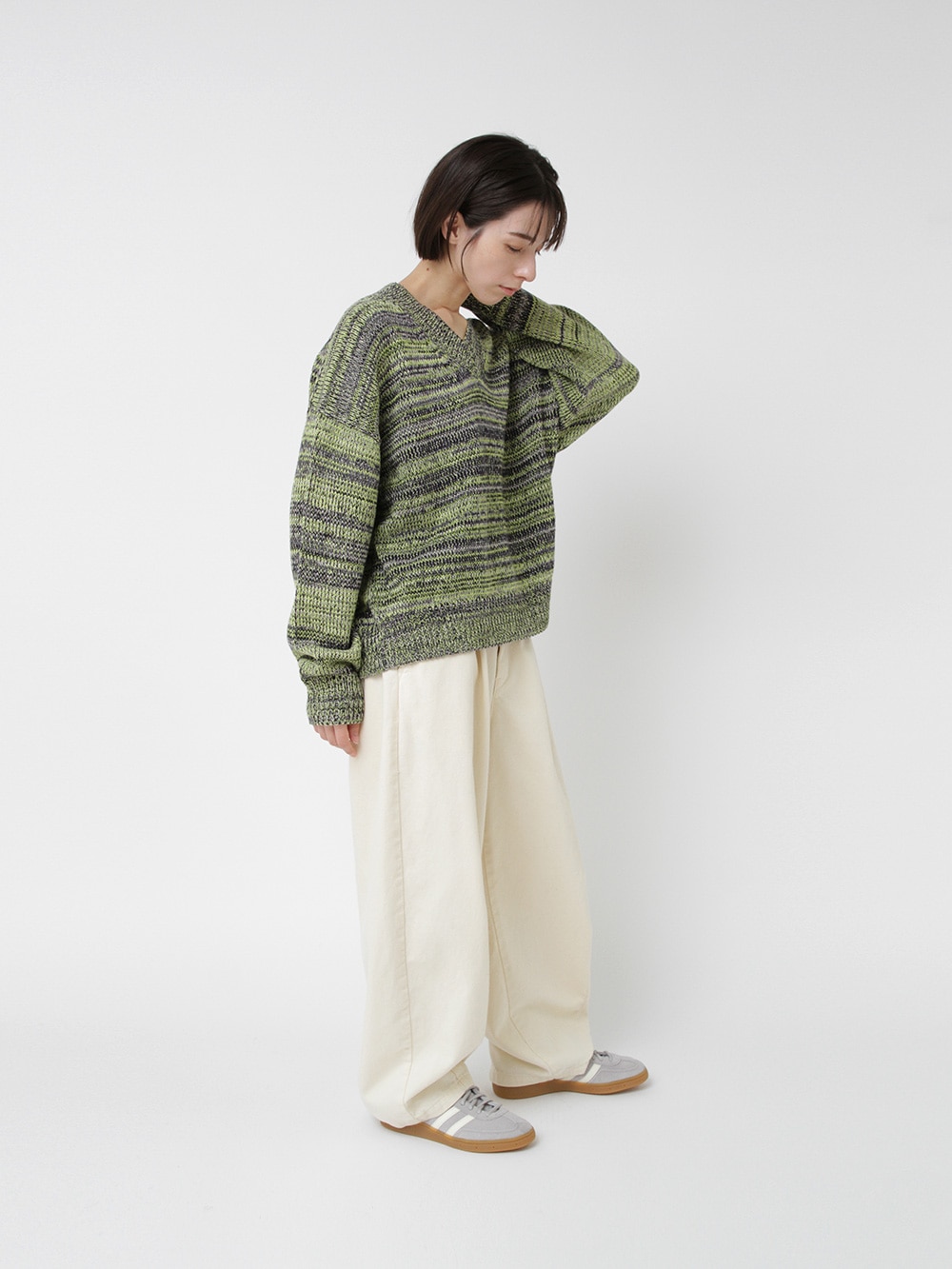 やわらかなコットンベースの糸を使用し、快適な着心地を実現。 奥行きのある鮮やかなミックスカラーが表情を引き立て、シンプルなデザインながらも確かな存在感を放つ一着。 ベーシックなデザインとサイズ感で幅広いスタイリングに溶け込みます。