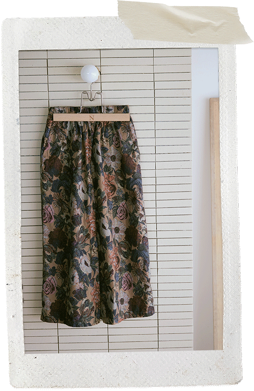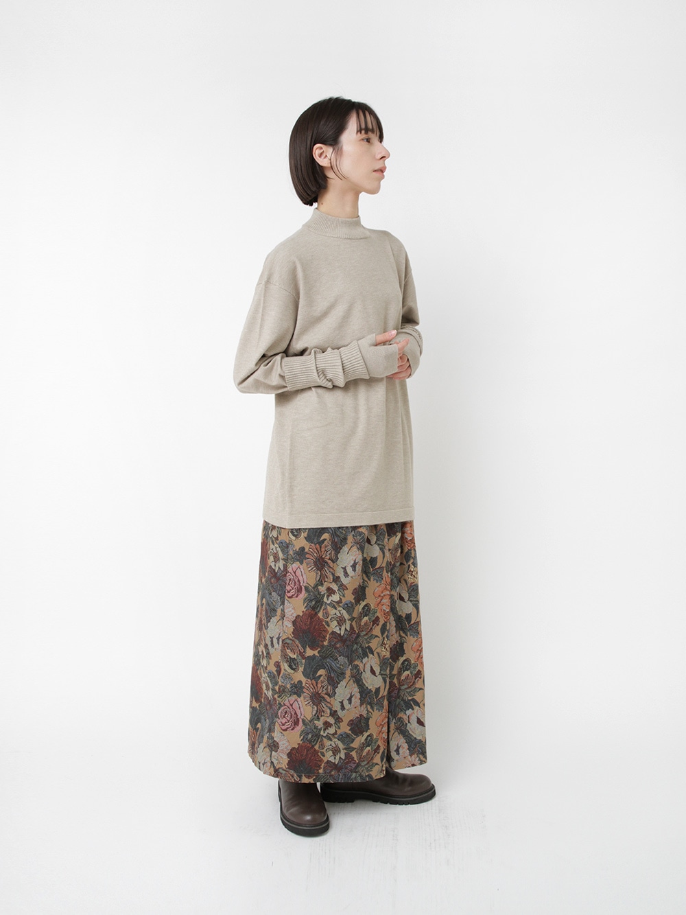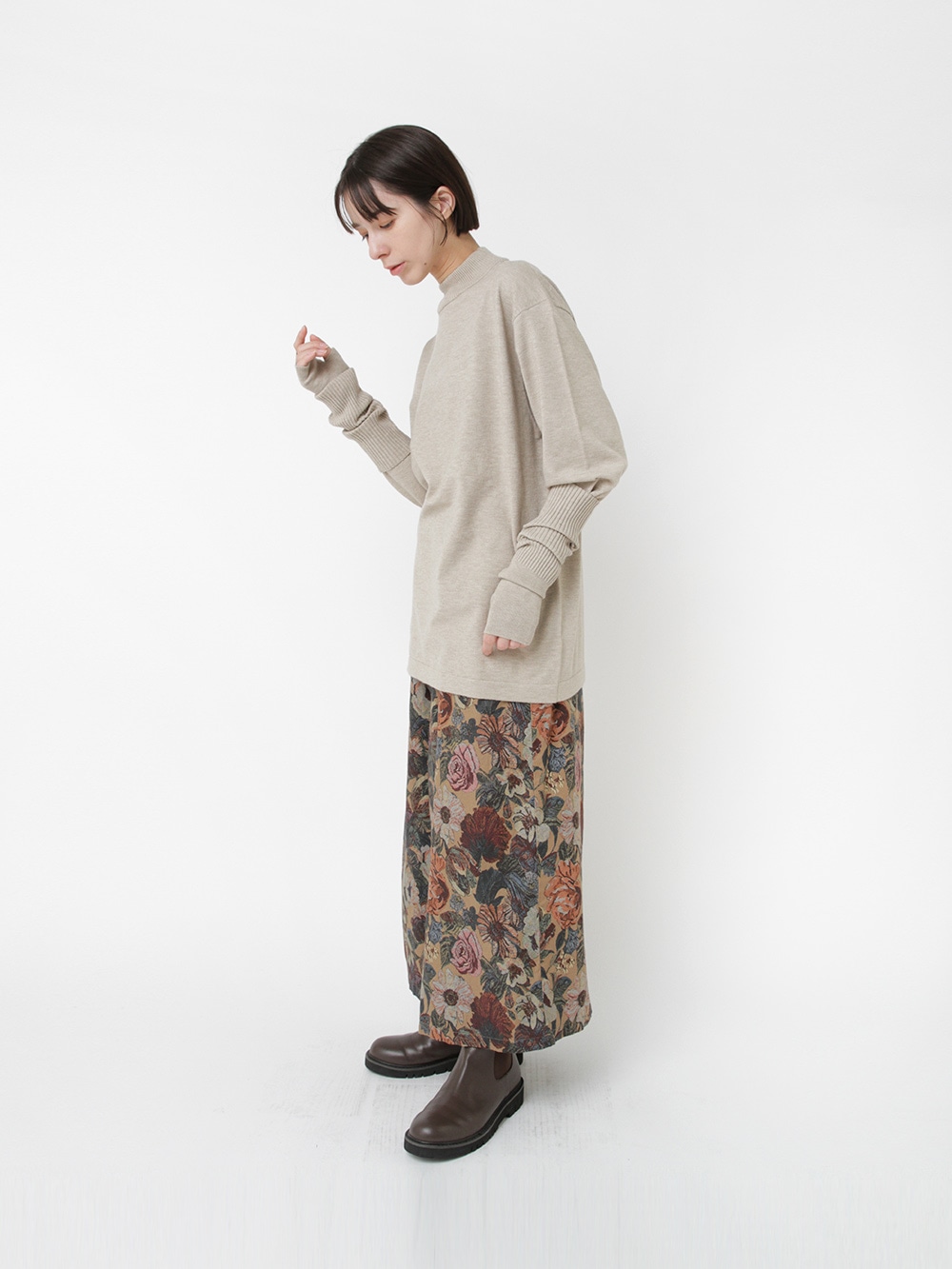 モダンアンティークな花柄スカートに合わせれば、落ち着きのある華やかさが漂う。