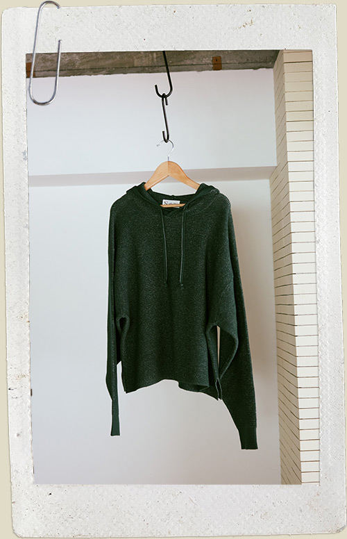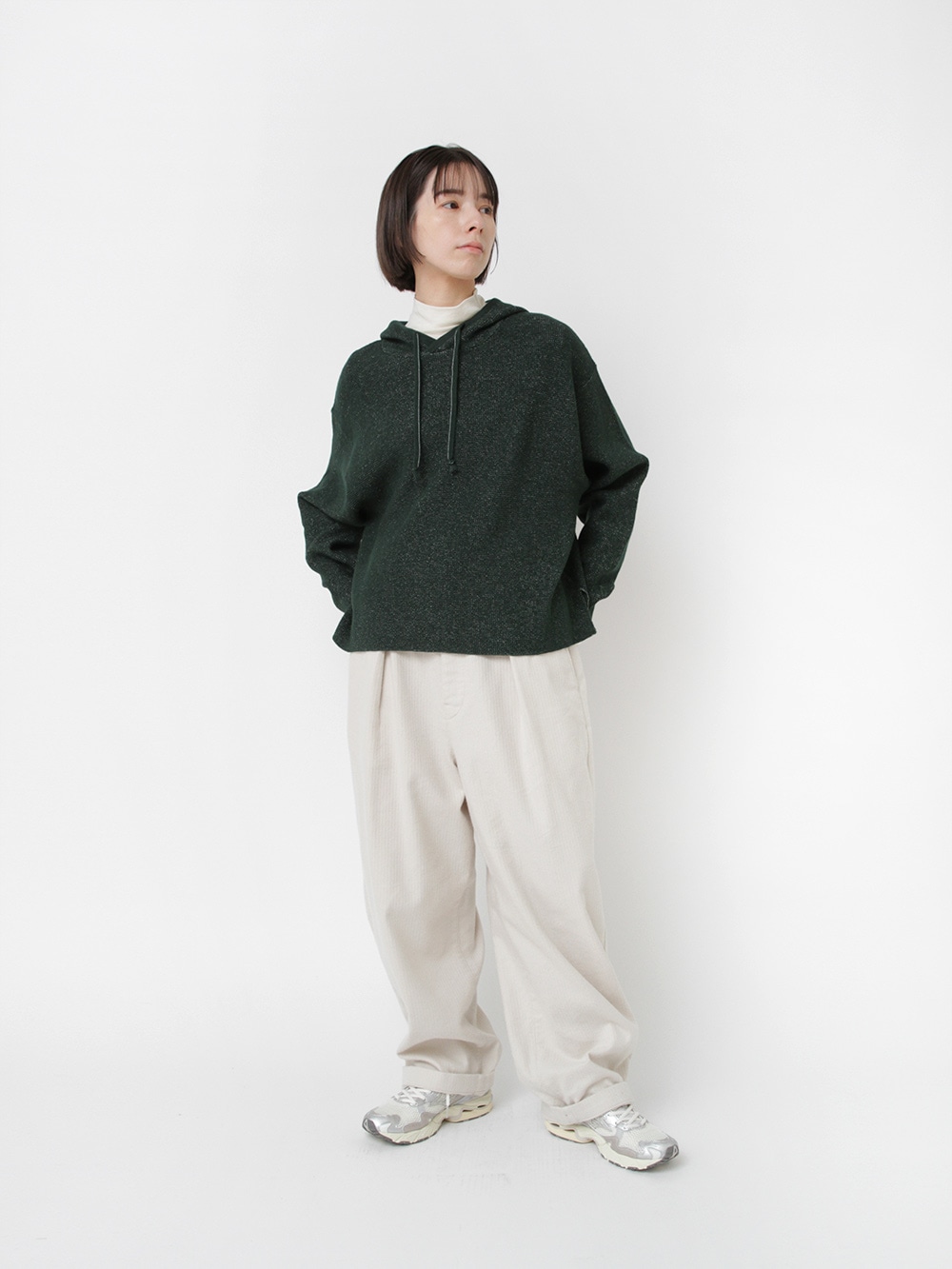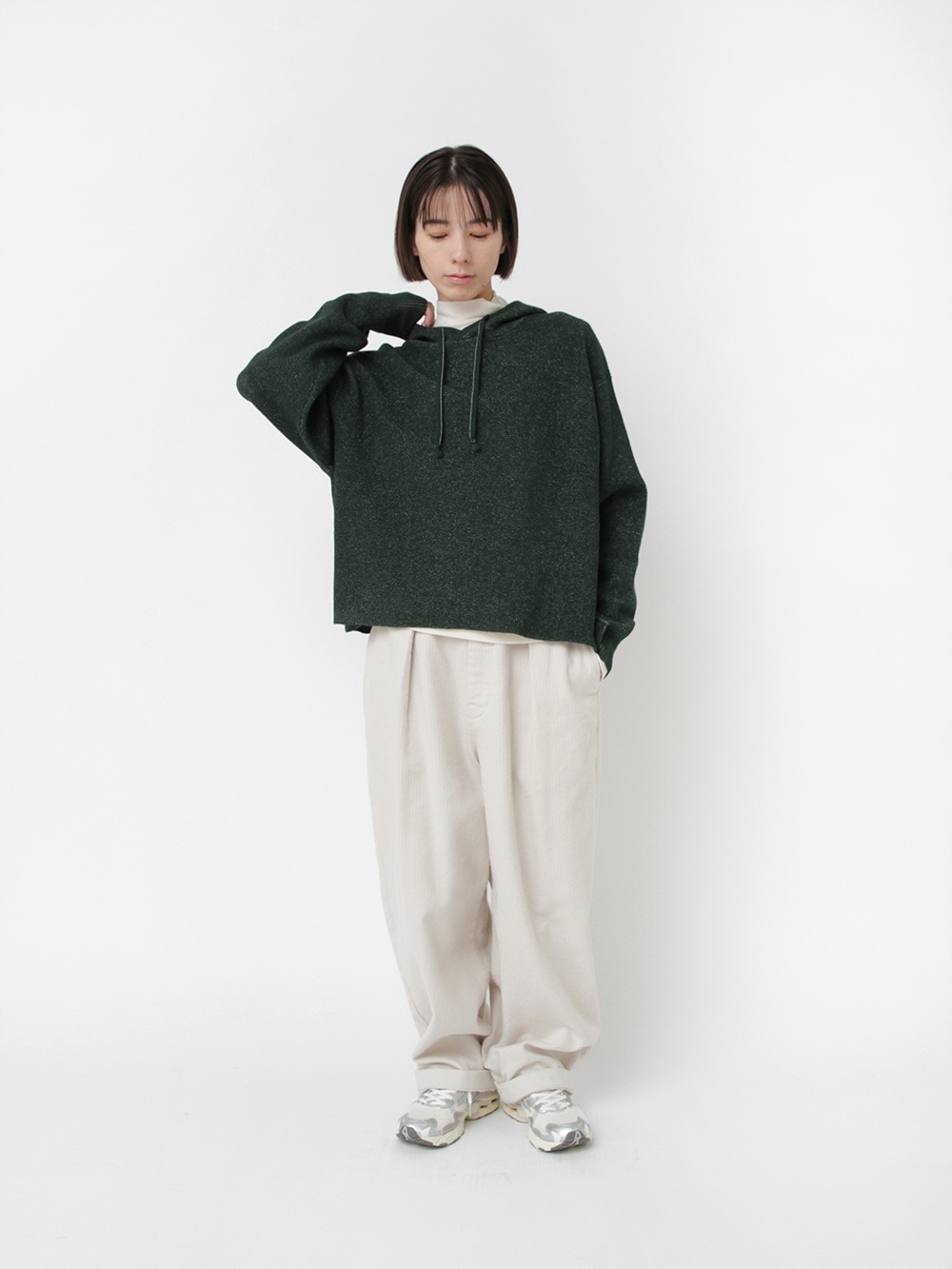 肌触りが心地良いワッフル生地の程よいラフさと、コンパクトな丈とフードのバランスがスタイリングにちょっとした抜け感を与えてくれる。 様々なボトムとバランスをとりやすい万能ニット。 シンプルなホワイトパンツと合わせて、カジュアルながら洗練されたスタイルに。