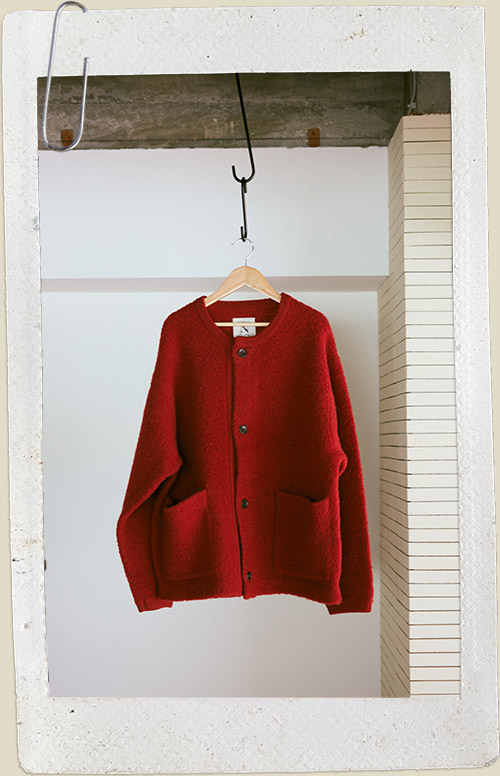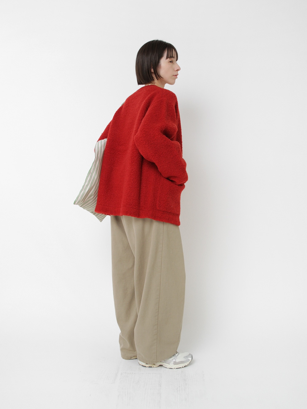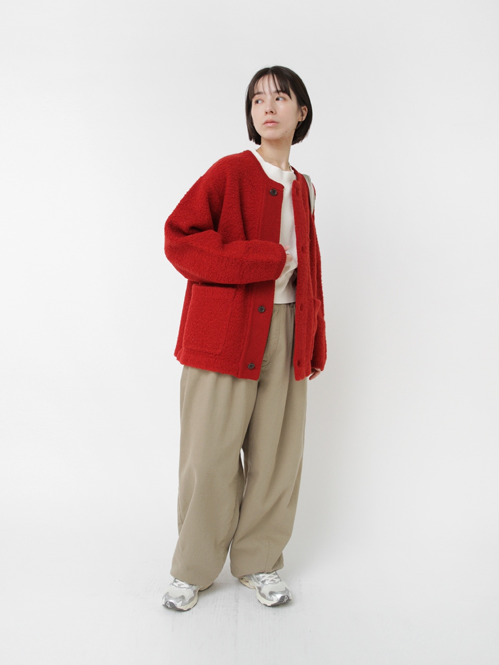 ループ編み縮絨ウール100%で仕立てたニットジャケット。 ふっくらとした風合いと軽やかな暖かさが魅力で、シンプルに羽織るだけで華やぎます。 鮮やかなレッドをワイドパンツに合わせて、大人の抜け感あるカジュアルが完成。