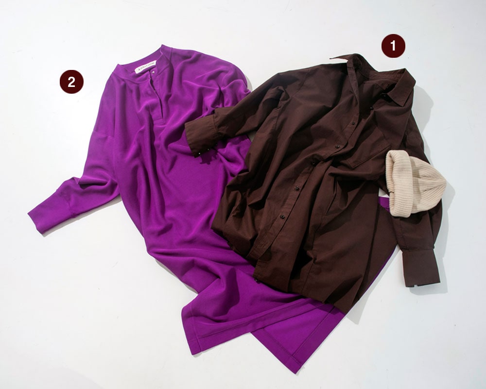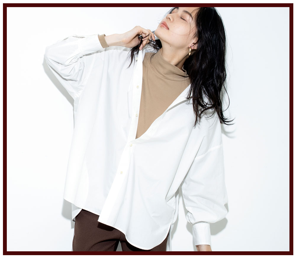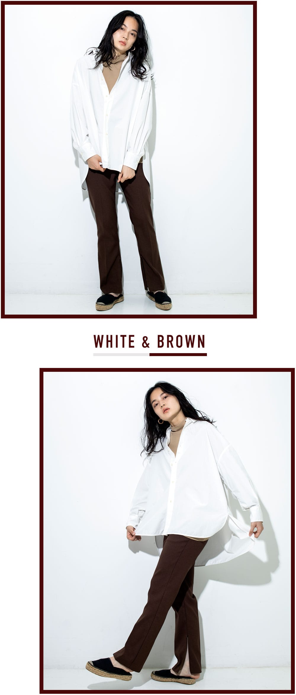ホワイトのBIGシャツにダークブラウンのテーラー