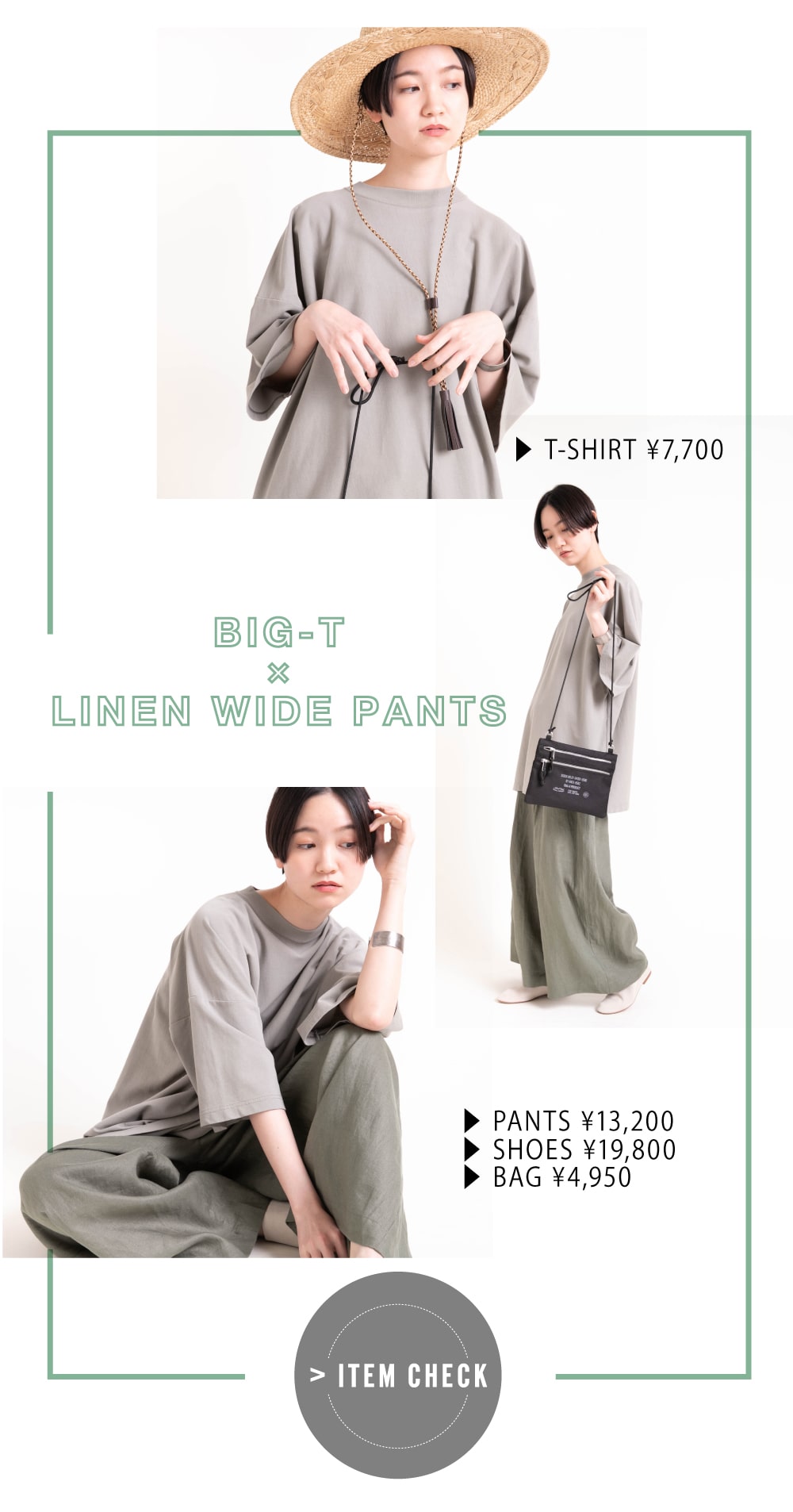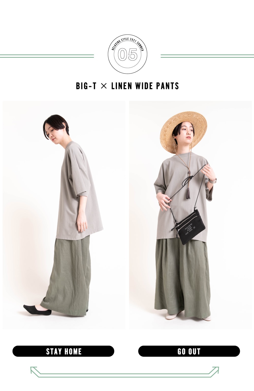 | ▶ M1653 ハーフスリーブビッグTシャツ ¥7,700 ▶ R3845 リネンイージーワイドパンツ ¥13,200 ▶ E4653 バブーシュ2wayフラットシューズ ¥19,800 ▶ E4783 ミリタリーサコッシュ ¥4,950 |
