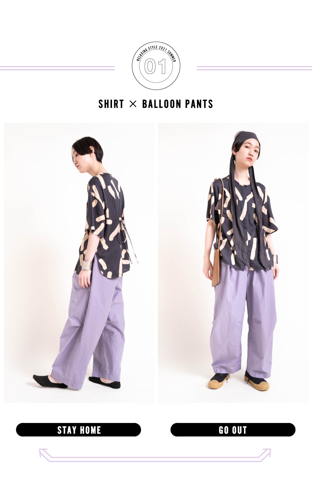 パープルが目を引くバルーンパンツを合わせたコーディネート。