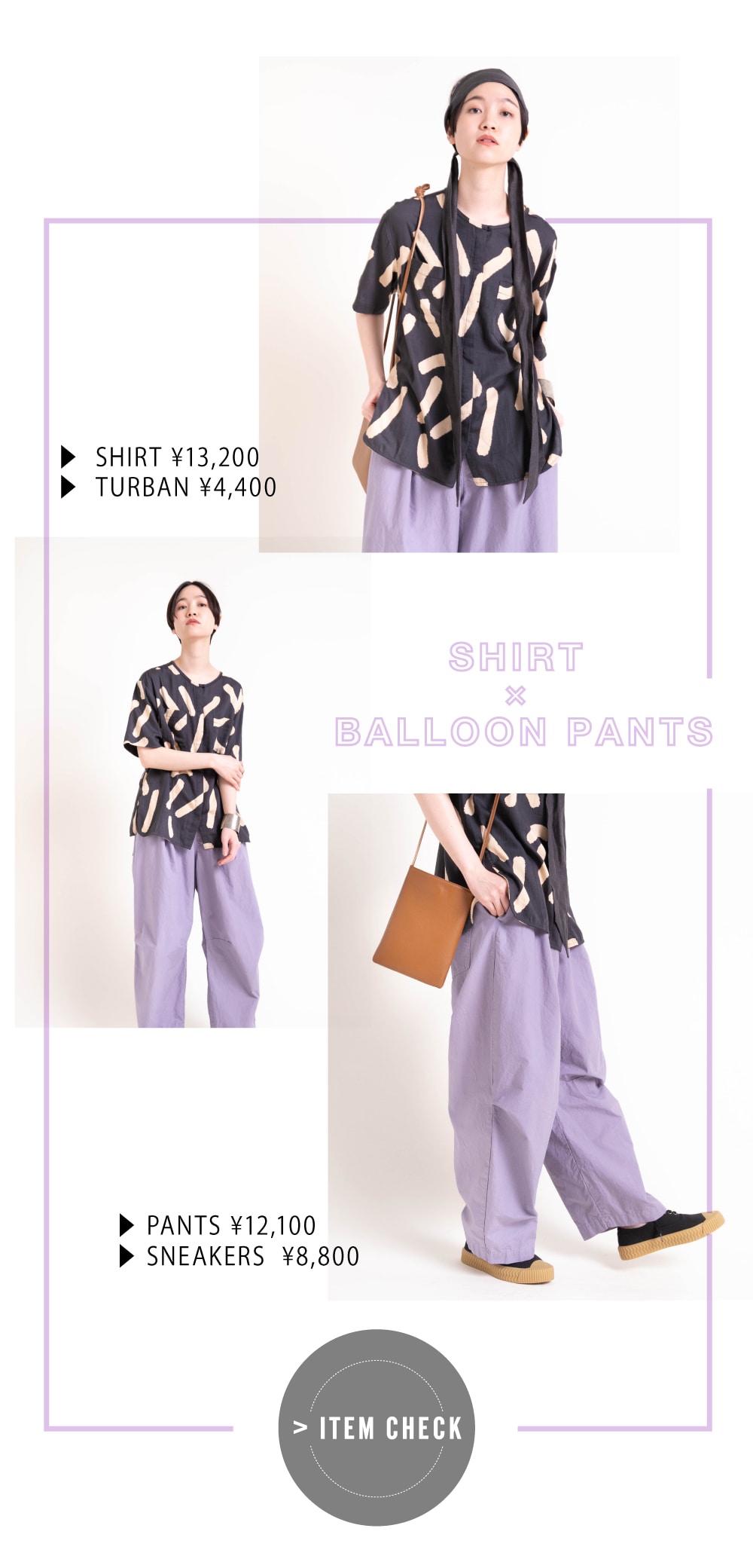 | ▶ B2630 アートプリントハーフスリーブシャツ ¥13,200 ▶ R3858 バルーンワークカラーパンツ ¥12,100 ▶ E4764 ミリタリースニーカー ¥8,800 ▶ E4763 リネンヘアターバン ¥4,400 |