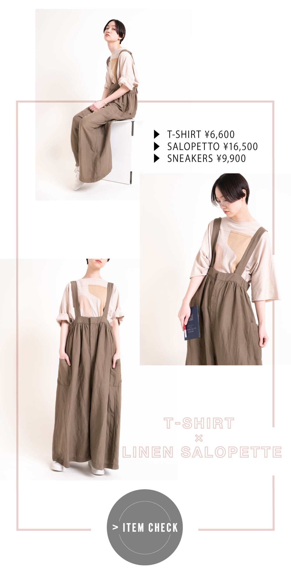 | ▶ M1639 21/-リサイクルイラストT ¥6,600 ▶ O0641 リネンギャザーサロペット ¥16,500 ▶ E4765 シンプルスニーカー ¥9,900 |