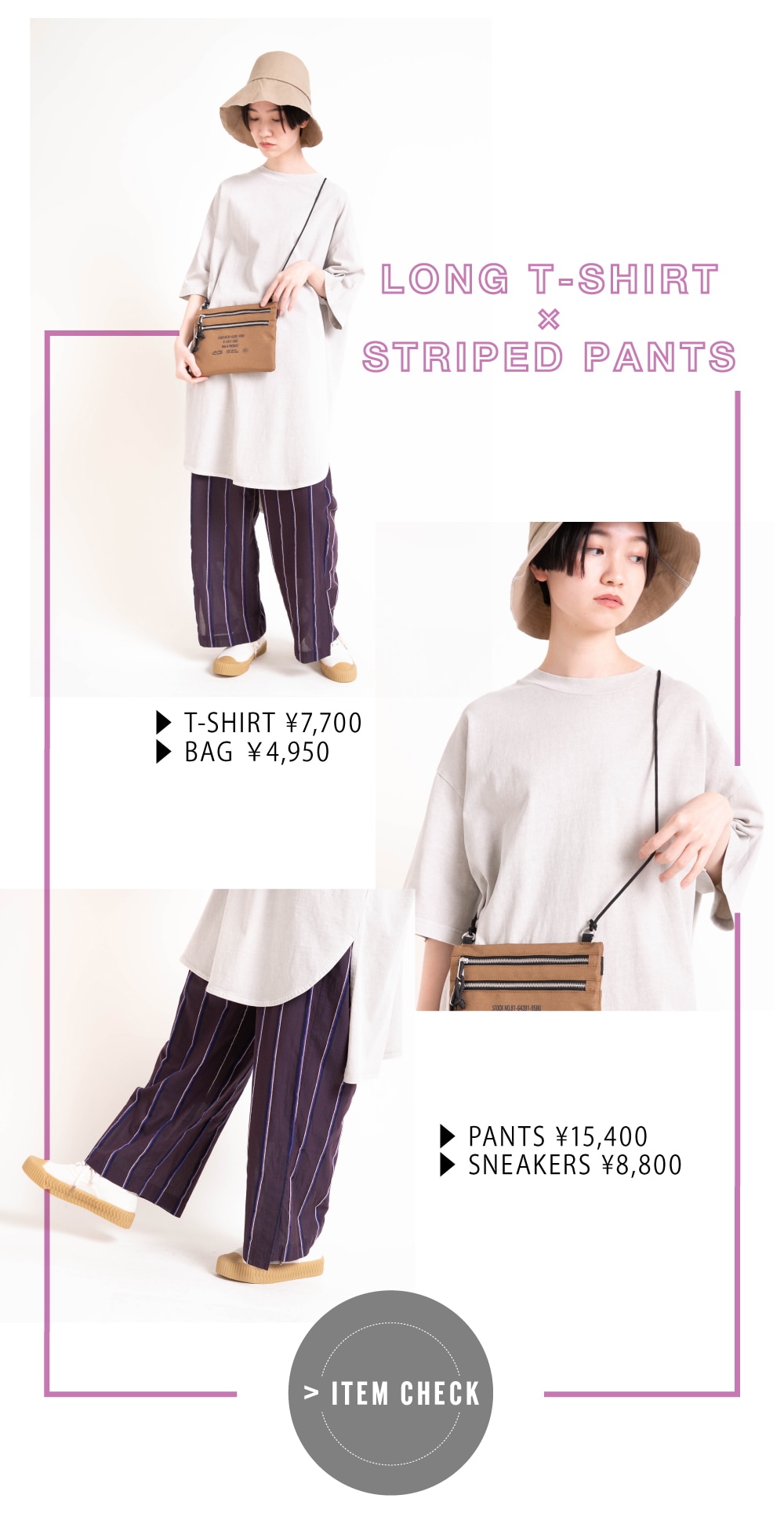| ▶ M1636 18/OE脱脂度詰天竺ロング丈T ¥7,700 ▶ R3835 シアーストライプイージーパンツ ¥15,400 ▶ E4783 ミリタリーサコッシュ ¥4,950 ▶ E4764 ミリタリースニーカー ¥8,800 |