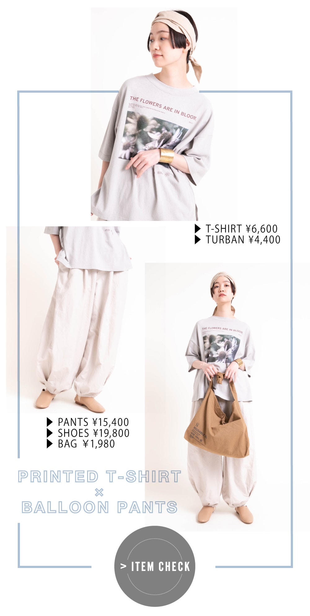| ▶ M1638 21/-リサイクルフラワーT ¥6,600 ▶ R3851 タックバルーンデザインパンツ ¥15,400 ▶ E4763 リネンヘアターバン ¥4,400 ▶ E4733 リユーザブルバッグ ¥1,980 |
