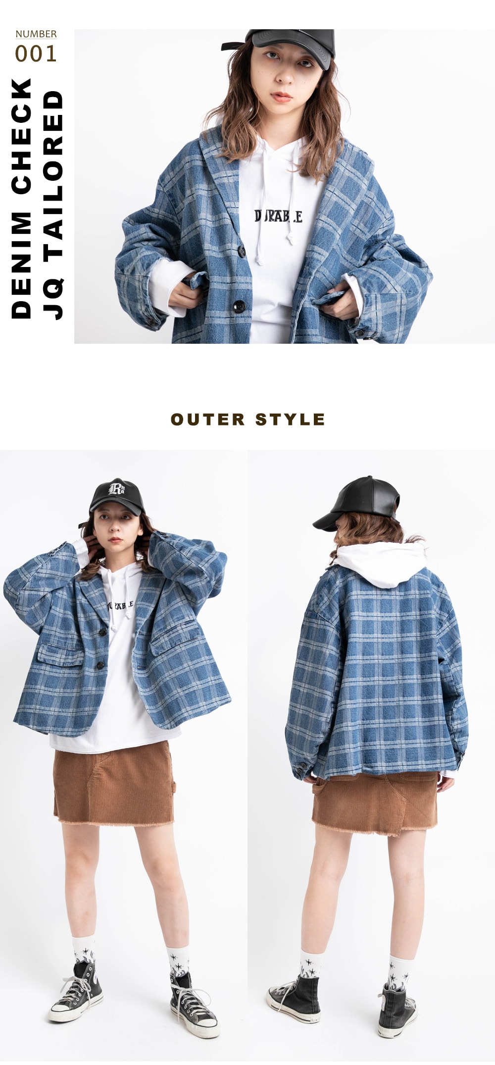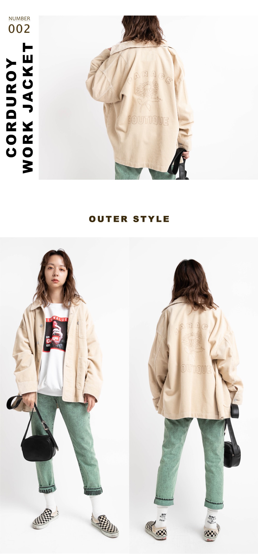 | J1982 Jacket ¥18,700 / M1743 Tops ¥7,700 R3875 Pants ¥18,700 / E4808 Bag ¥6,820 |