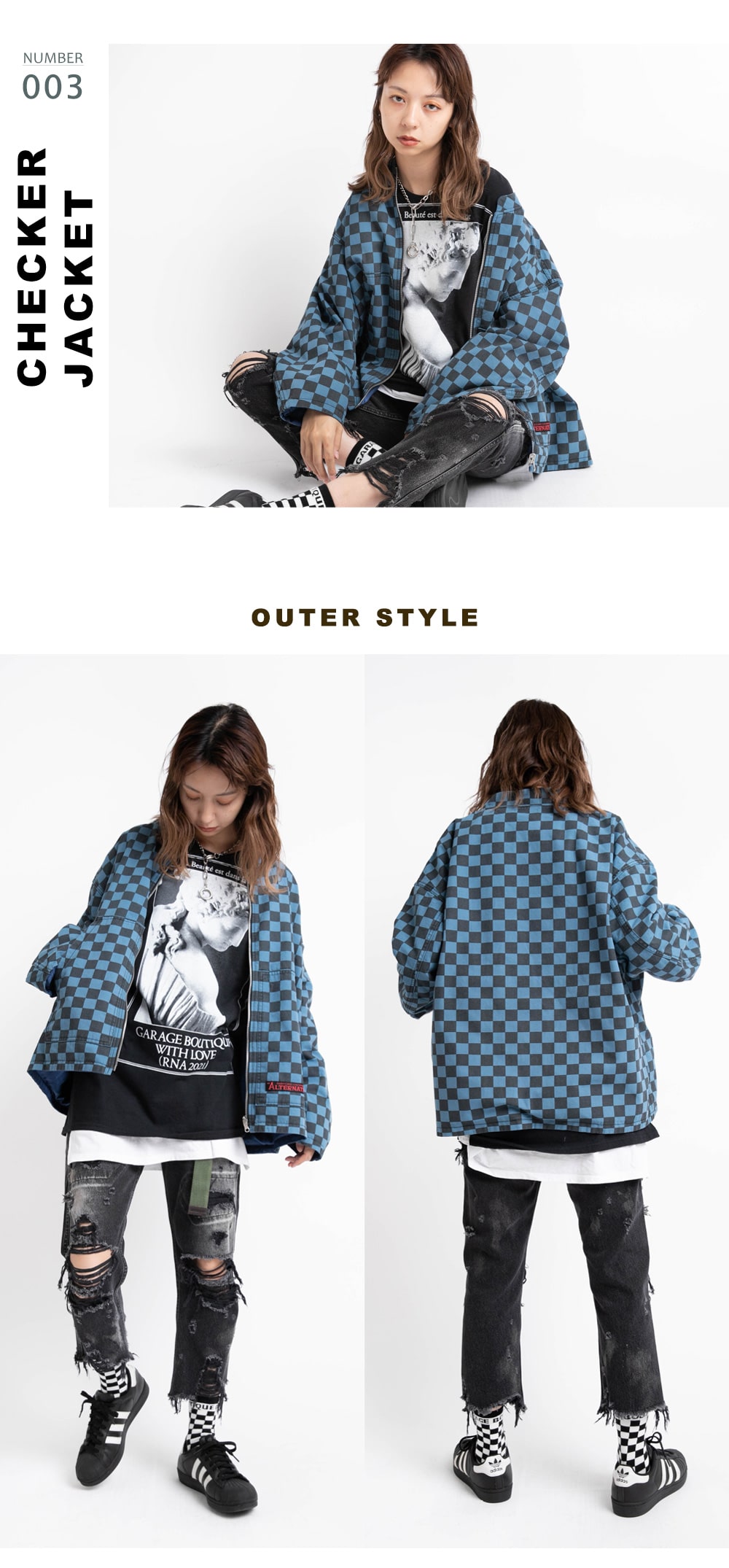 | J1989 Jacket ¥27,500 / M1745 T-shirt ¥6,600 M1329 Tank-top ¥3,850 / R3862 Pants ¥19,800 E4758 Neck-lace ¥3,850 |