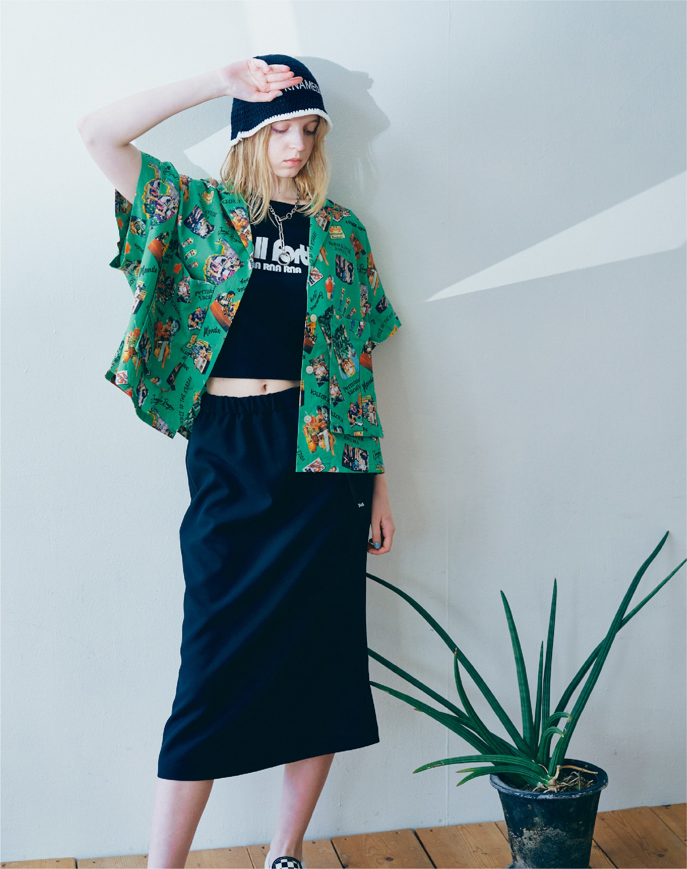 今回は鮮やかなグリーンカラーを活かして、他はモノトーンでまとめたルック。